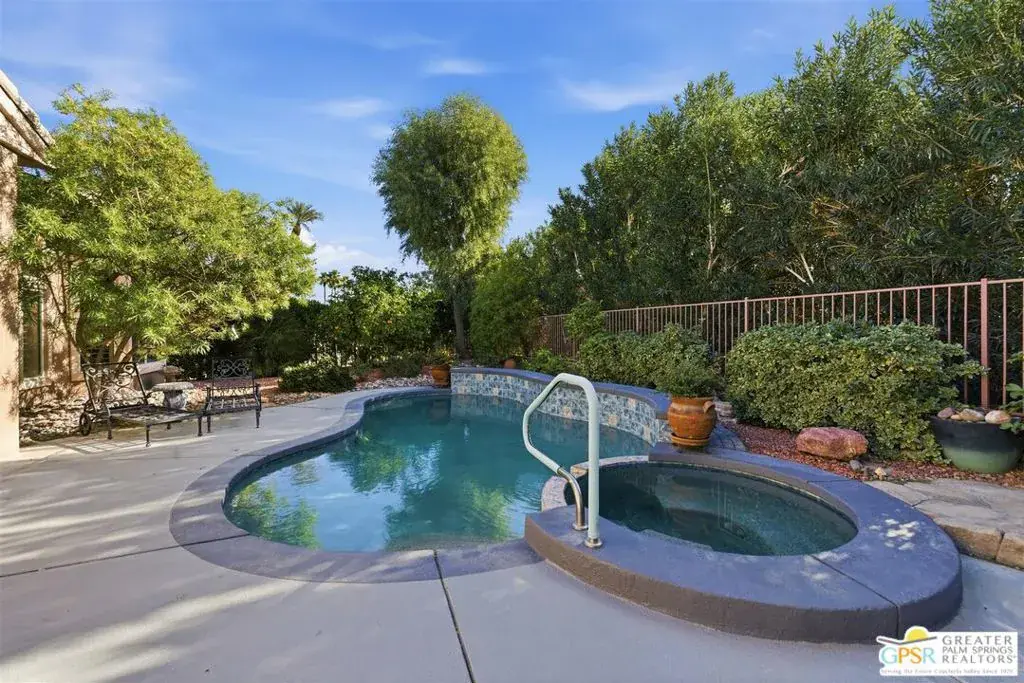 Welcome to desert living at its best in this beautifully upgraded home, tucked away on a quiet cul-de-sac in the heart of an active country club golf community. Enjoy stunning mountain views from the south-facing backyard, where relaxing by the Pebble Tec pool and spa becomes part of everyday life, ideal for afternoon sun and evening gatherings.This extended Emerald model offers a spacious great room with dining area and a thoughtfully updated kitchen featuring stainless steel appliances, quartzite countertops, and a casual eating area that flows seamlessly into the family room with fireplace, creating an inviting space for both entertaining and daily living.The home features three bedrooms, including a generous primary suite with ensuite bath and large walk-in closet. One secondary bedroom is well suited for use as a home office or den, while the third bedroom/casita is accessible from both the interior of the home and a separate exterior entrance, offering flexible use for guests or additional living space.Notable upgrades include a remodeled Pebble Tec pool, paid solar panels, tankless water heater, and newer air conditioning units replaced in 2018. Tile flooring and plantation shutters are featured throughout, along with mature desert landscaping. The two-car garage includes a dedicated golf cart bay, ideal for enjoying everything this sought-after community has to offer.A must-see opportunity for those seeking comfort, efficiency, and the Palm Desert lifestyle.