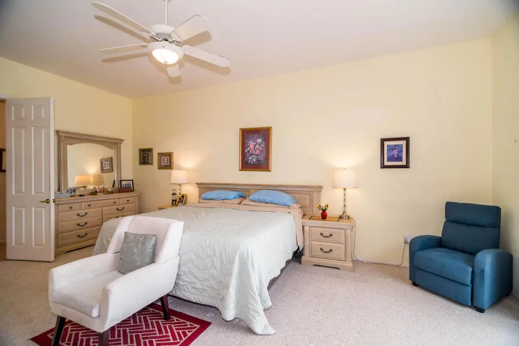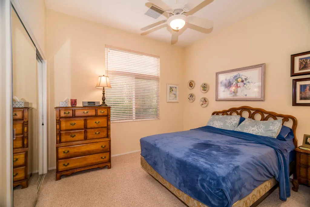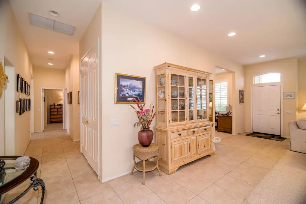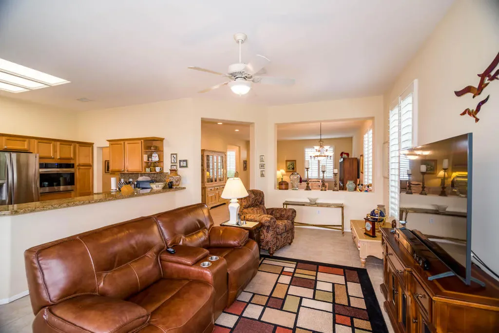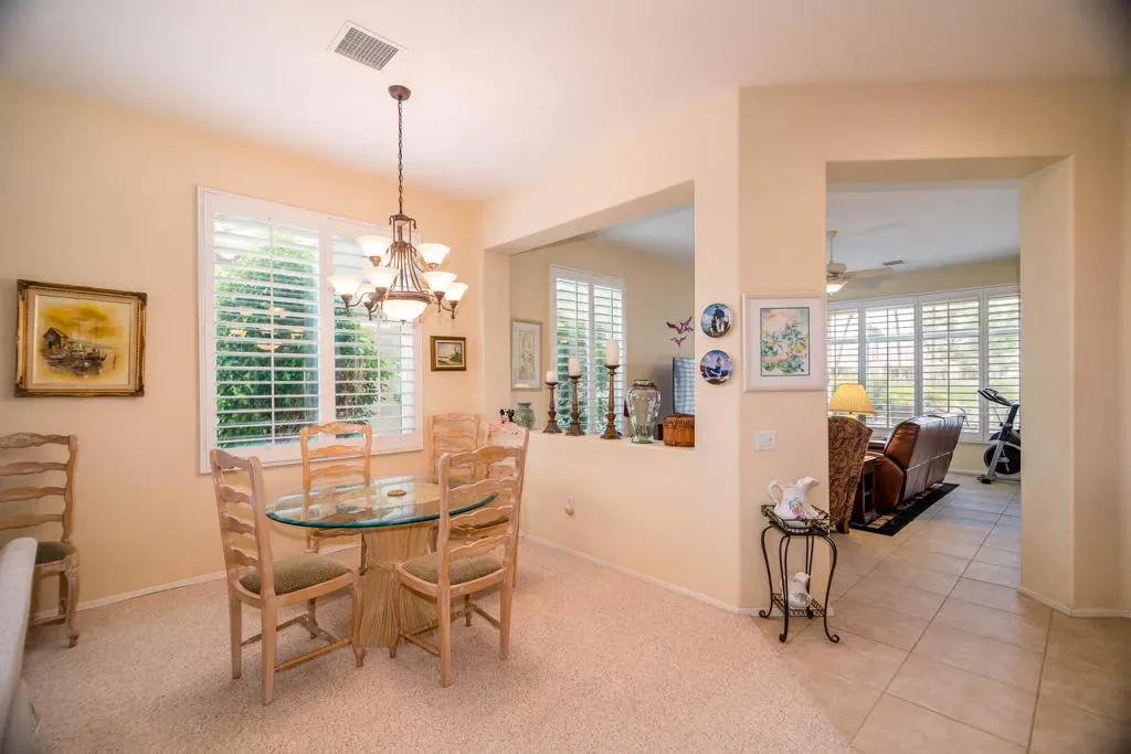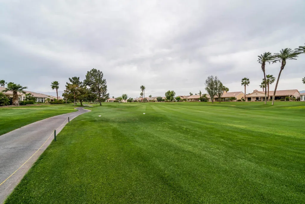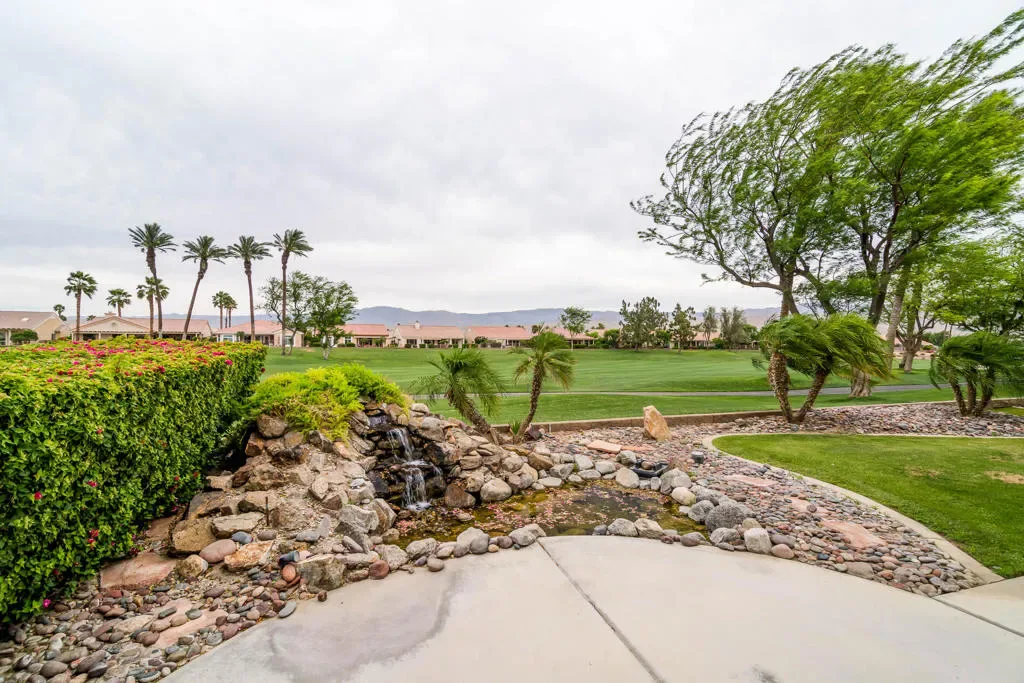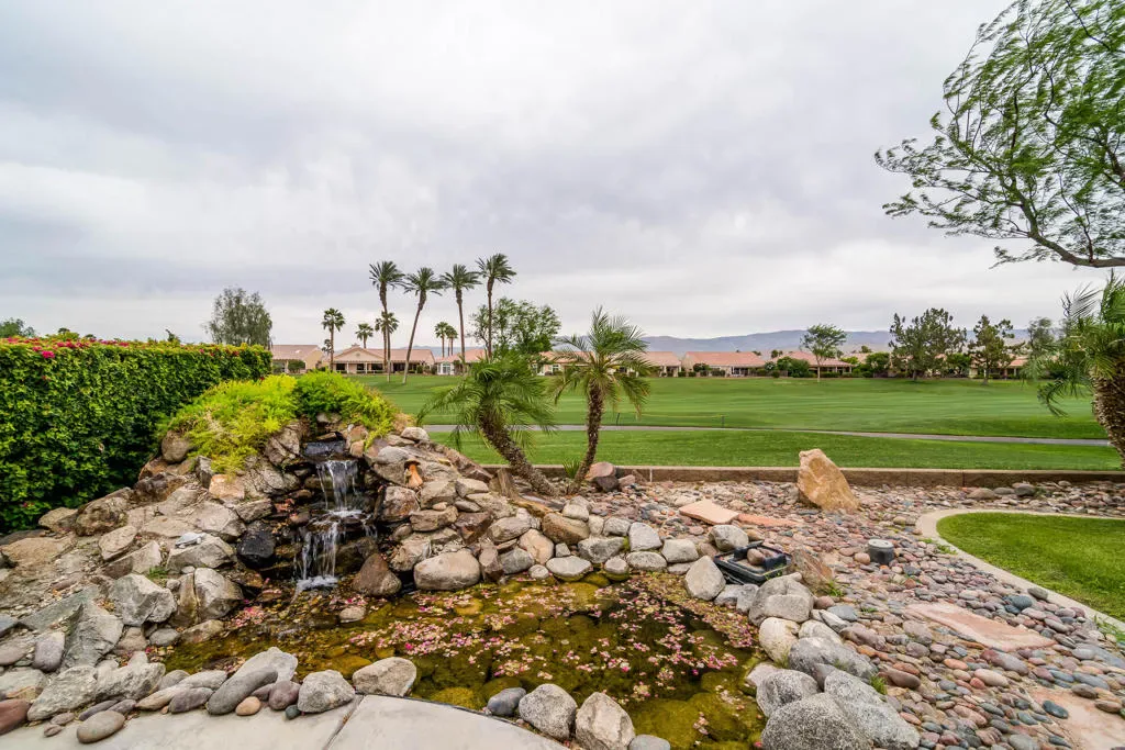 This is a fine fairway home in Sun City Palm Desert, a 55 plus community. This popular San Carlos home on 14th hole of the Mt Vista golf course, features 2 bedrooms and office/den, has a north facing patio with expansive views of golf course and mountains. the lovely, landscaped yard has a mature grapefruit tree and a cascading waterfall feature and a pond. The chef’s kitchen is a delight with large granite countertops with a breakfast bar and lots of cabinet space. Other features include Plantation shutters in living room, family room, den, and kitchen, an Enviro water filtration system, tankless Water Heater, extended garage with epoxy flooring, large laundry room w a sink and cabinets and courtyard entry with water feature. Some furniture included outside of escrow. Come experience the best of desert living at Sun City with golf, pools, tennis, pickleball, fitness centers, dining with endless social activities within two state-of-the-art Community centers with concerts and numerous events!
