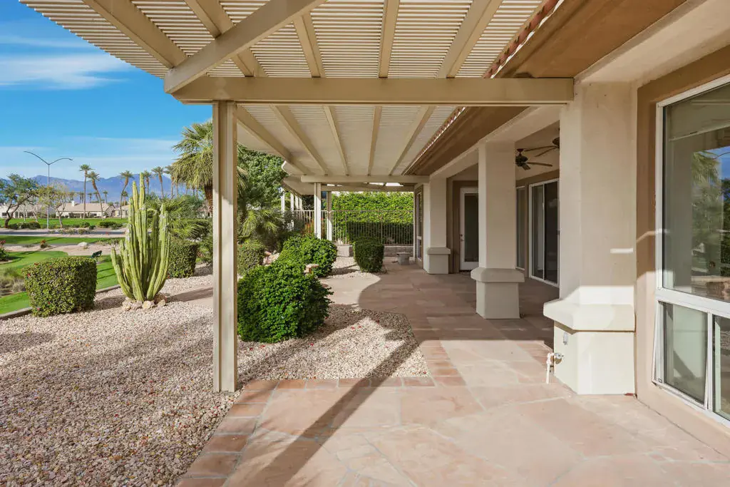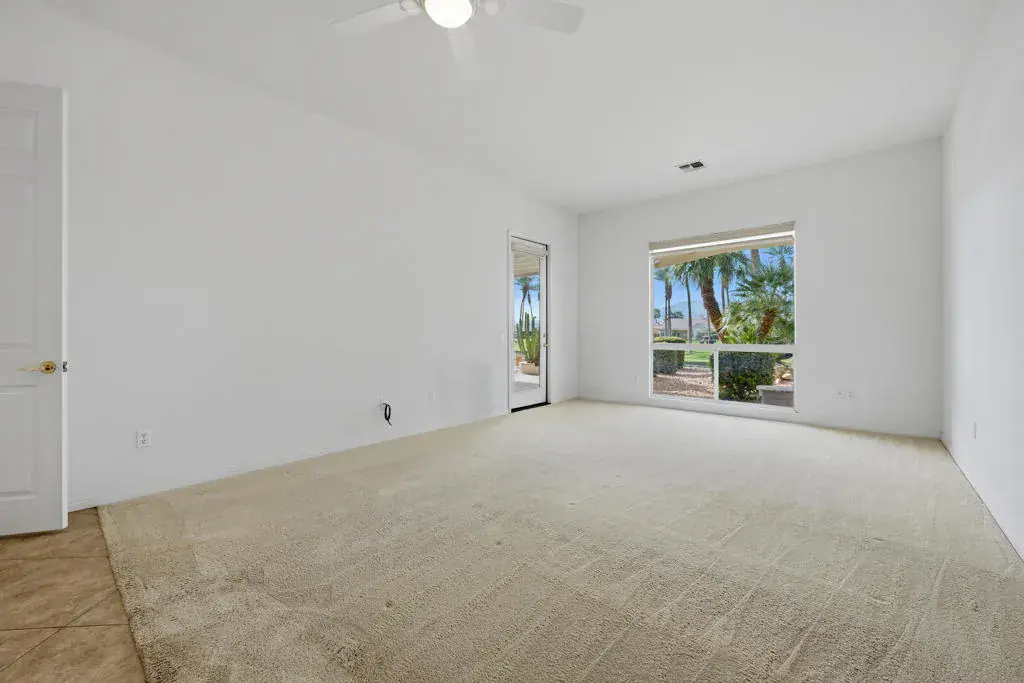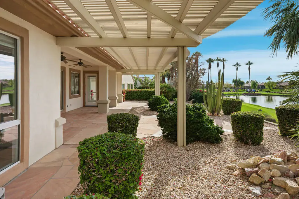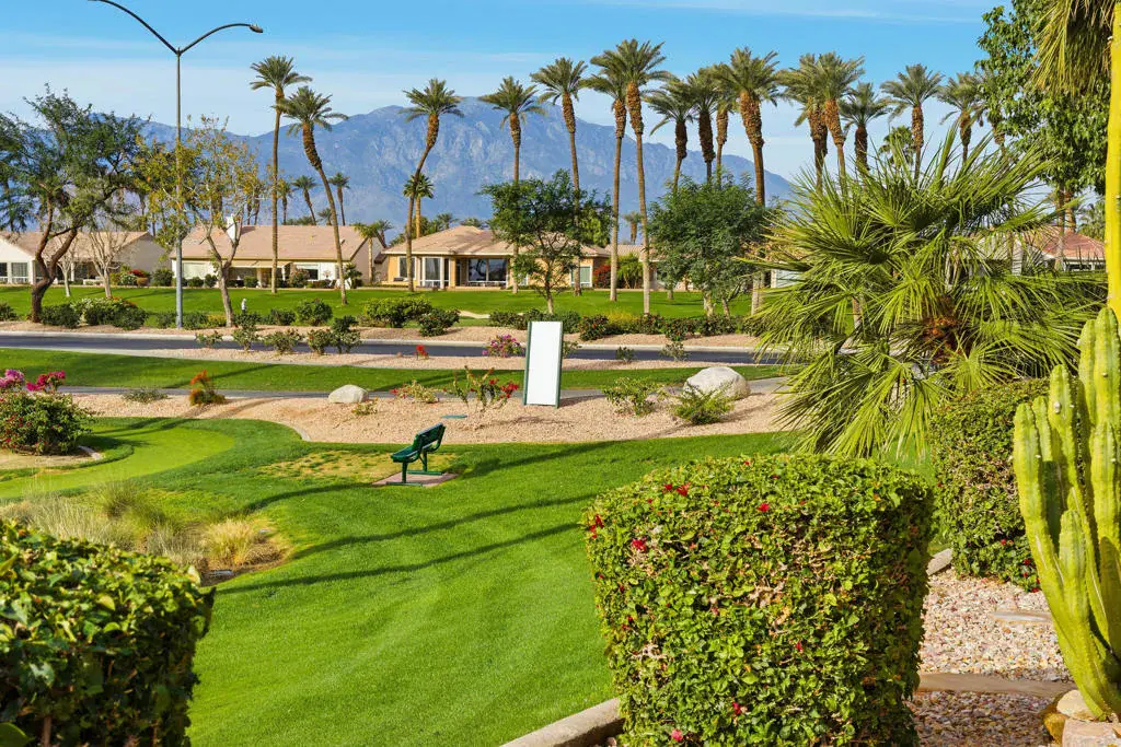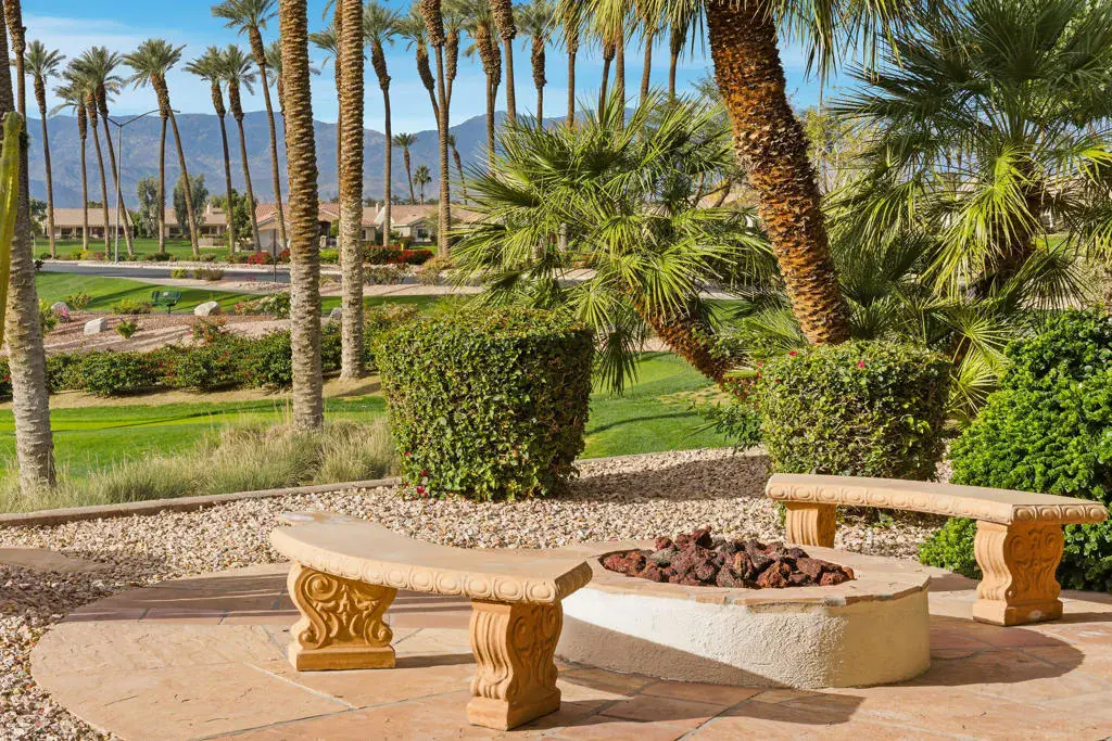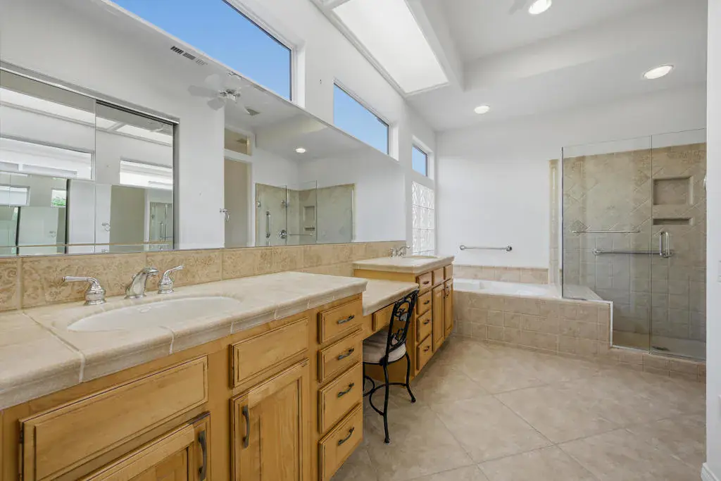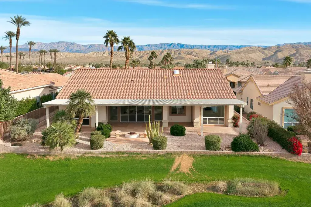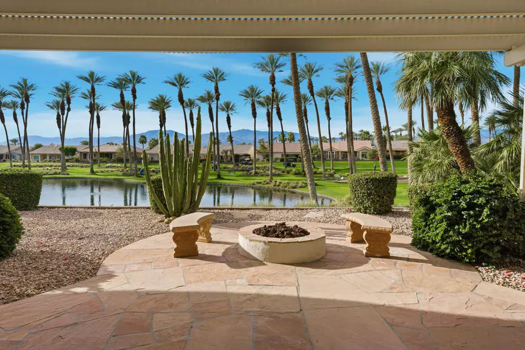 Sun City Palm Desert – Monaco. Set in a truly fabulous location overlooking the 18 hole putting course and just around the corner from the Lakeview Fitness Center and pool, this exceptional Monaco model captures the best of desert resort living. An elevated, south-facing rear yard features a flagstone patio with firepit and offers panoramic views of the putting course, lake, and surrounding mountains–an ideal setting for both relaxation and entertaining. A gated front courtyard and glass front doors create inviting curb appeal while filling the interior with natural light. Inside, the home impresses with soaring 12-foot ceilings in the foyer and great room, complemented by 10-foot ceilings throughout the rest of the home. Large-format 20-inch tile is featured in all living areas except the great room and bedrooms. The great room showcases expansive views through a double slider that opens to the rear patio, seamlessly blending indoor and outdoor living. The adjacent family room offers a cozy gathering space with a tile-trimmed gas fireplace. The kitchen is thoughtfully designed with extended maple cabinetry featuring an antiqued finish and pullout shelves, stainless steel appliances, a large chef’s island, skylight, under-cabinet lighting, smooth glass electric cooktop (plumbed for gas), and a wall oven. Matching maple cabinetry continues throughout the bathrooms and laundry room. This well-designed home offers three bedrooms, each with an ensuite bathroom. The extended primary suite features a door to the rear patio, a spacious walk-in closet, and a luxurious ensuite bath with spa tub, dual sinks with sitting vanity, tile surfaces, and a stall shower with rimless glass enclosure. The extended guest suite includes French doors to the front courtyard and an ensuite bath with stall shower, rain glass doors, and tile finishes. A third guest suite also features an ensuite bath with stall shower and rain glass doors. Additional highlights include a laundry room with abundant storage and utility sink, a gigantic 2+ golf cart garage, recirculating hot water, and dual air-conditioning systems replaced in 2019. An exceptional opportunity to enjoy views, privacy, and close proximity to premier amenities in one of Sun City Palm Desert’s most desirable settings.
