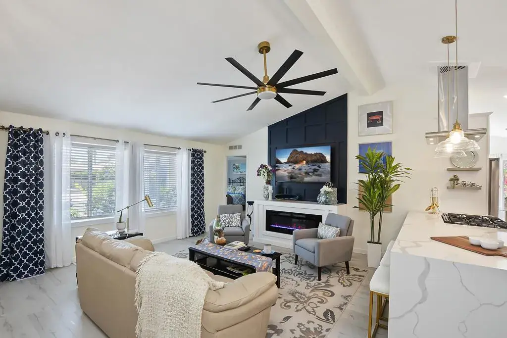 Welcome to the CROWN JEWEL of Suncrest Country Club! A stunningly renovated 3-bedroom, 3-bath home offering not one, but two master suites, and an amazing open-concept floorplan. Residing on one of the most private lots in the community with clear mountain views, just steps from club amenities, this home is an entertainer’s dream and a serene retreat all in one. The charming frontage and immaculate desert friendly landscaping, with new irrigation system, welcomes you into a peaceful front courtyard with a charming seating area and tranquil fountain feature. Step into the gorgeous light-filled living room with vaulted ceilings, a spacious entertainment area, and a custom ultramodern electric fireplace wall. The newly designed kitchen boasts quartz countertops throughout, a long peninsula with a waterfall edge, breakfast bar and an abundance of additional cabinetry. Stainless-steel appliances, butler station, all new fixtures and a walk-in pantry further enrich this amazing kitchen with breakfast nook. The luxurious master suites, each with their own spacious walk-in closets, are complimented by exquisitely modernized bathrooms, tastefully furnished throughout. The indoor laundry room with wash sink provides direct access to a full 2-car garage with a recently upgraded opener and panel door. The private backyard oasis presents a spacious aluminum covered rear patio for entertaining, adjacent to a lavish artificial lawn area perfect for lounging or relaxing in the premium above-ground spa. A leased solar-system adds energy-efficiency to this incredible home, and the new A/C unit brings an ice-cold environment at the touch of a button. This entire home has been stylishly painted both inside and out. In addition to this beautiful property, Suncrest offers an abundance of amenities from a Clubhouse with a restaurant, to a 9-hole golf course, three community pools and spas (one only four houses away), pickleball and tennis courts, all within securitized gates. An incredible lifestyle upgrade, for an amazingly affordable price, minutes from shopping centers, fine dining, and all the Coachella Valley has to offer.