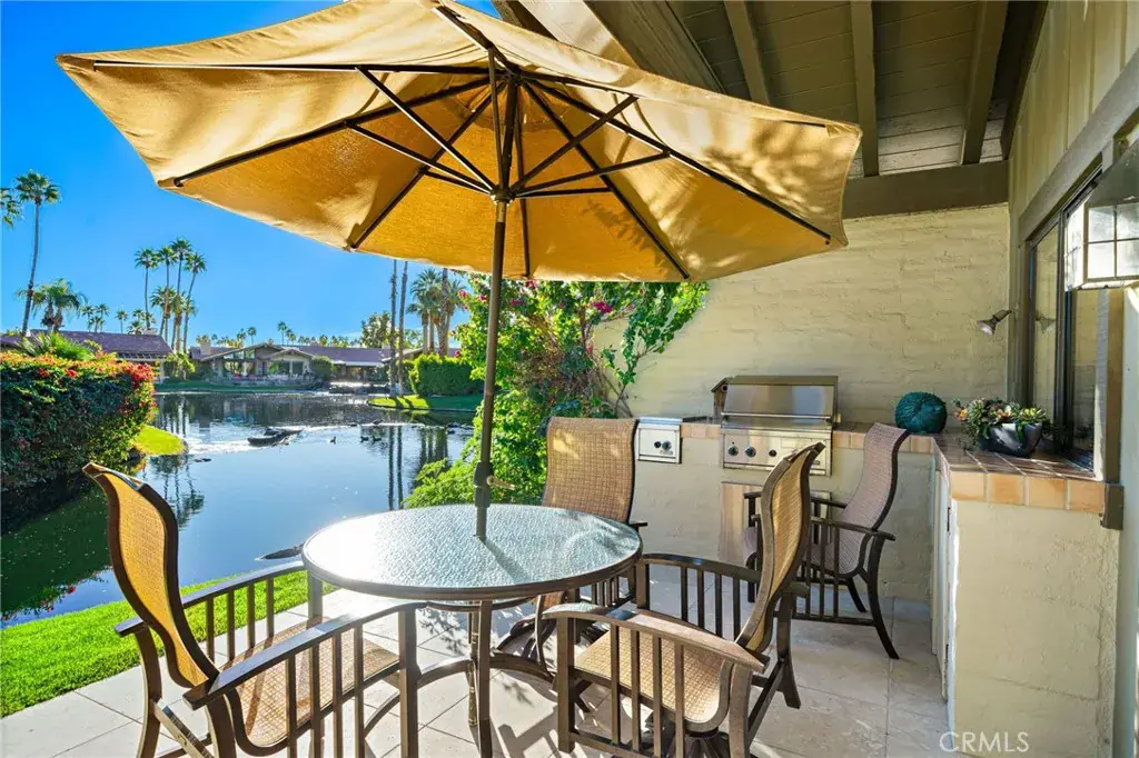 The southeast-facing patio is a true sanctuary — perched lakefront with gentle waterfalls and a built-in outdoor kitchen, making mornings peaceful and evenings unforgettable. Just across a quaint bridge, a nearby community pool is tucked away amid lush landscaping, offering resort-style relaxation less than a minute from your door.