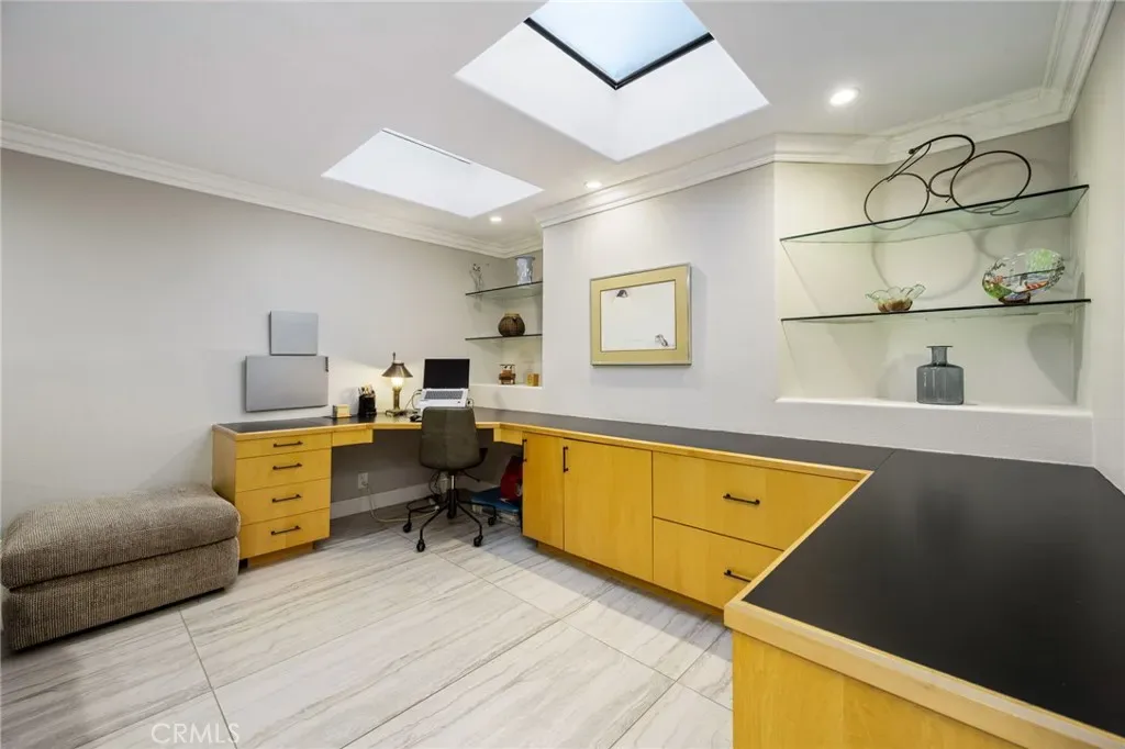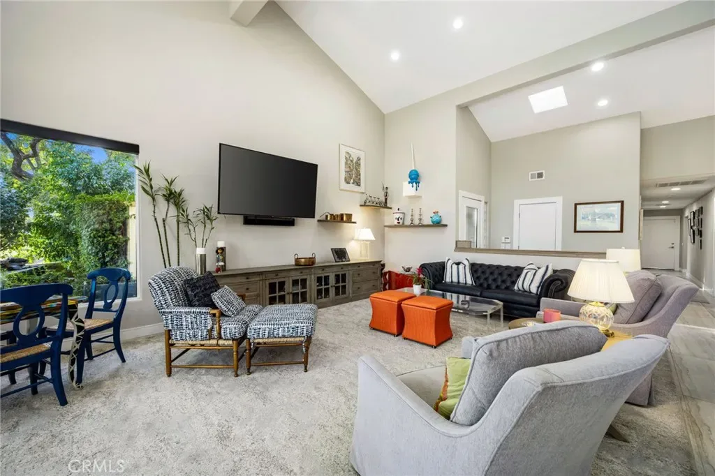 A coveted private gated side yard with tranquil water feature creates a serene retreat for games or cozy TV time outside. Inside, expansive accordion doors open the great room and chef’s kitchen to an extended patio designed for al fresco dining, sunset gatherings, and fireside evenings. Vaulted ceilings and abundant natural light enhance the spacious great room, dining area, and beautifully appointed kitchen with large island, premium appliances, walk-in pantry, and casual seating.