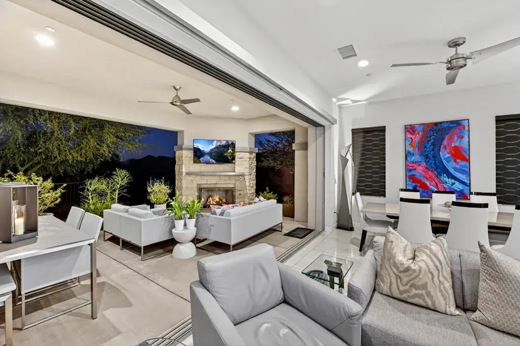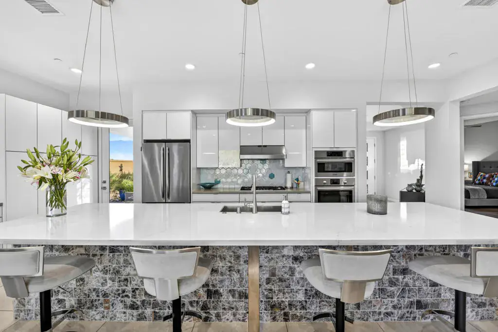 Rare opportunity to own this beautifully upgraded Haven 2 floor plan in the prestigious Retreat at Desert Willow. Perfectly positioned in the community’s most desirable location, this contemporary residence offers 2,184 square feet (EST.), 3 bedrooms, 3 bathrooms, and was built in 2018 with exceptional craftsmanship and thoughtful design throughout. Sweeping southern mountain and golf course views create an impressive backdrop, enhancing the home’s serene and luxurious ambiance. Inside, refined upgrades abound, including 32×32-inch polished porcelain tile flooring, designer paint, and expansive pocket sliding glass doors that open wide to blend indoor and outdoor living. The chef-inspired kitchen is both stylish and functional, featuring custom soft-closing cabinetry, upgraded quartz countertops, glass tile accents on the island, stainless steel appliances, and a wine cooler–ideal for effortless entertaining. Custom window treatments and ceiling fans add comfort and sophistication throughout the home. All three bathrooms have been tastefully remodeled with enhanced showers, premium tile work, upgraded cabinetry, modern doors, custom mirrors, and elegant arctic polish quartz countertops. The luxurious primary suite offers a serene retreat with a beautifully appointed bathroom and a convenient linen cabinet. Additional highlights include epoxy flooring in the garage along with a Trax storage system and cabinetry. The outdoor covered patio serves as an inviting extension of the living space, complete with a cozy fireplace and mounted TV, making it the ideal spot to unwind while taking in the stunning surrounding views. Life at The Retreat at Desert Willow offers unmatched resort-style amenities including a sparkling pool, lap pool, spa, clubhouse with billiards and ping pong, fitness center, BBQ areas, and a private golf-cart path leading directly to Desert Willow Golf Resort. HOA dues provide incredible value with internet, cable, water, pest control, and trash service, plus exclusive owner perks such as unlimited use of the Desert Willow driving range and access to the Golf Academy. A rare blend of luxury, lifestyle, and breathtaking views–this exceptional home is a must-see for buyers seeking an elevated Palm Desert living experience.