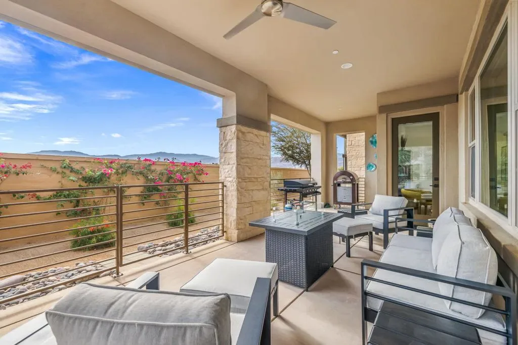 Enjoy magnificent views and privacy at The Retreat at Desert Willow. Step inside and you’reimmediately WOWED by the panoramic south-facing Santa Rosa Mountain views, a truedefinition of desert luxury. Morning coffee and evening cocktails on the private patio comewith an endless skyline backdrop. This beautifully customized Plan 1 (Sanctuary) offers two bedrooms, a den/office, and two and a half bathrooms. The great room features an open-concept design with high ceilings, 8′ doors, and extensive recessed lighting. The gourmet kitchen showcases custom cabinetry, quartz countertops, an oversized island, updatedplumbing and lighting fixtures, a Bosch appliance suite, Samsung Bespoke refrigerator,Zephyr vent hood, and a walk-in pantry. The dining area flows seamlessly to the expandedpatio for ideal indoor-outdoor living. Upgrades include custom automatic blinds, Totowashlets, warm modern finishes, and exceptional detail throughout. The spacious primarysuite offers patio access and a spa-style bath with double sinks, soaking tub, walk-in shower with bench, and a fully upgraded custom closet. The guest suite features its own bath, walk-in closet, and private patio. The den/office with double glass doors provides flexible living space, and the private front courtyard creates an additional peaceful outdoor retreat. Thehome also includes a two-car attached garage with mini split, an extended driveway, a largelaundry room with abundant cabinetry and sink, brand new carpeting, and owned solar with11 panels plus a Tesla Powerwall 3, a major efficiency and value upgrade. Arguably one of themost customized Plan 1 homes in the community, this residence offers elevated finishes inevery room. The Retreat at Desert Willow delivers true resort-style living with a pool, lappool, heated spa, clubhouse, fitness center, BBQ areas, and a private golf-cart path to DesertWillow Golf Resort with Retreat privileges included in a membership at no cost to Retreathomeowners, providing preferred rates on golf, driving range, retail, and dining. HOAincludes internet, cable, water, exterior pest control, and trash. Your private, resort-styledesert oasis awaits. Schedule your showing today!
