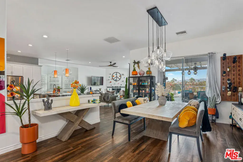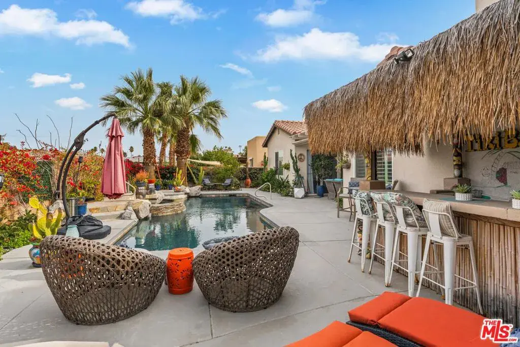 An updated desert retreat with a private pool, stunning views, and a chef’s kitchen awaits! Discover your own private oasis in the heart of Palm Desert. Located on a quiet cul-de-sac within a gated community, this exceptional 4-bedroom, 3-bathroom single-family residence offers 2,330 square feet of beautifully updated living space. From the moment you arrive, the home’s striking curb appeal, featuring a Spanish-style tile roof and lush landscaping, sets a tone of relaxed elegance. Step inside to an open and airy floor plan, where dark wood-style flooring flows seamlessly through the main living areas. The heart of the home is the spectacular gourmet kitchen. It boasts a massive waterfall island with a farm-style sink, professional-grade stainless steel appliances including a 6-burner gas cooktop and double ovens, pristine white cabinetry, and dramatic pendant lighting. This incredible space opens to the spacious family room, complete with a decorative fireplace and large sliding glass doors that flood the area with natural light and provide a seamless transition to the outdoor living space. The private backyard is an entertainer’s paradise. A sparkling pool and spa with a pebble-tech finish serve as the centerpiece, surrounded by a generous patio with a covered area and ceiling fans for comfortable lounging. Enjoy alfresco dining prepared at the built-in BBQ and take in the picturesque mountain views. The unique thatched-roof bar adds a touch of resort-style living to your everyday life. This remarkable property also includes a 3-car attached garage, a low monthly HOA fee, and numerous recent upgrades. Offering a perfect blend of style, comfort, and modern amenities, this Palm Desert home is a rare find. Schedule your private tour today to experience this exceptional property for yourself.
