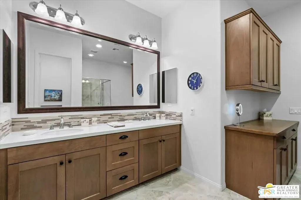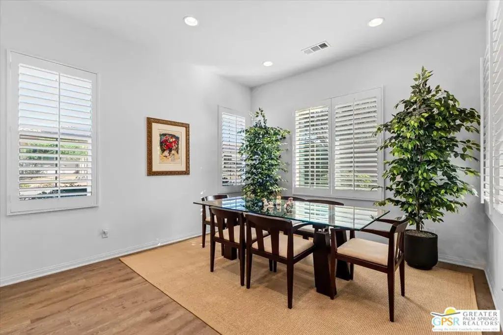 $25,000 price reduction! Welcome to this beautiful single-story home on a corner lot, built in 2015, located in Villa Portofino, an exceptional 55+ community in Palm Desert. Impeccably maintained by its current owners, this residence is offered turnkey furnished (excluding the empty second bedroom and artwork) and is move-in ready. The home features custom plantation shutters throughout, handsome carpeting in each bedroom, and attractive wood plank-style flooring in the main living areas, with porcelain tile in the bathrooms. The spacious primary bedroom offers private patio access and an elegant ensuite bath with a soaking tub, separate stall shower, dual vanity, and an expansive walk-in closet. Energy efficiency is enhanced by leased solar panels at just $37 per month. The HOA fee at Villa Portofino includes roof maintenance, insurance, TV and internet, trash service, and membership in the community’s private club. Residents enjoy resort-style amenities including a sparkling pool and spa, fitness center, billiards room, theater, numerous clubs and classes, and an on-site restaurant. Experience an unparalleled lifestyle. Villa Portofino living is truly second to none.