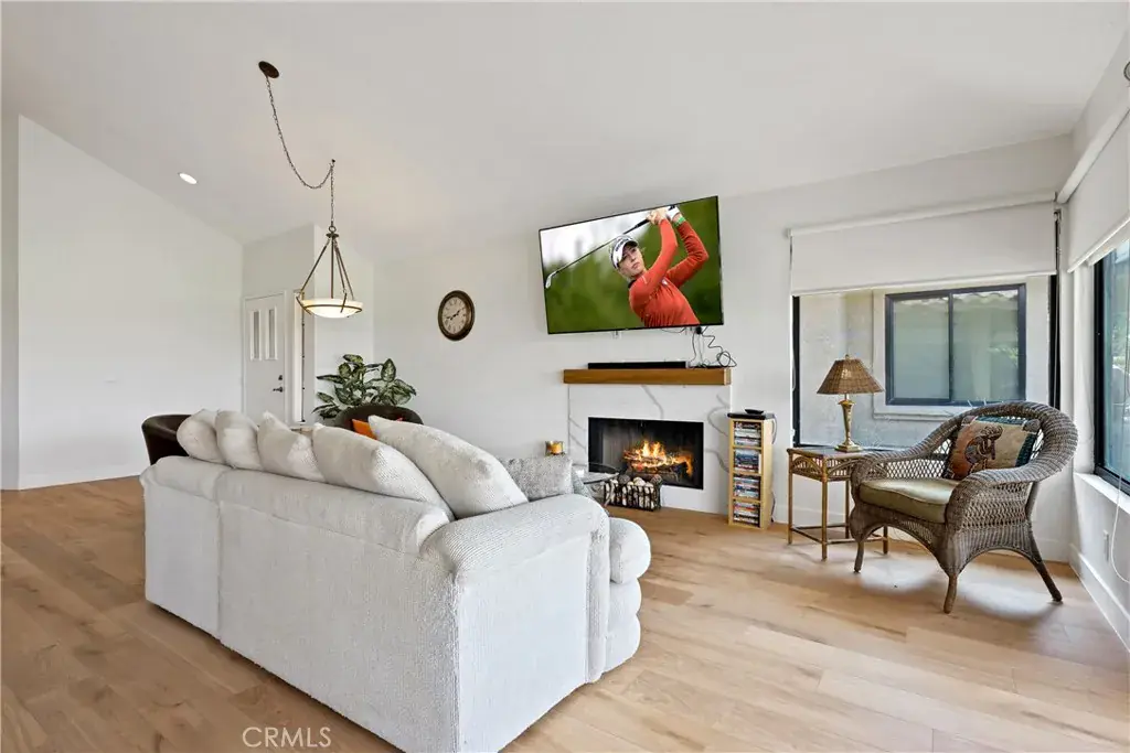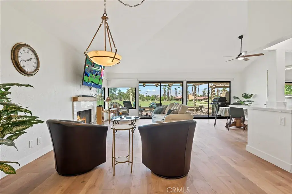 Discover this beautifully upgraded single-story end unit home with lots of privacy on the 7th fairway. Enjoy the view of the golf course and mountains as you relax on the huge north facing patio which includes a 10-piece patio set with brand new cushions. The included BBQ has a direct gas line – so no more propane tanks! Step inside to an open concept design featuring new Shaker style kitchen cabinets, and quartz countertops which seamlessly flow into the dining space. The wide plank luxury vinyl flooring adds warmth and durability, complemented by fresh paint, new recessed lighting in the kitchen, and an inviting quartz surround fireplace with a new mantle.