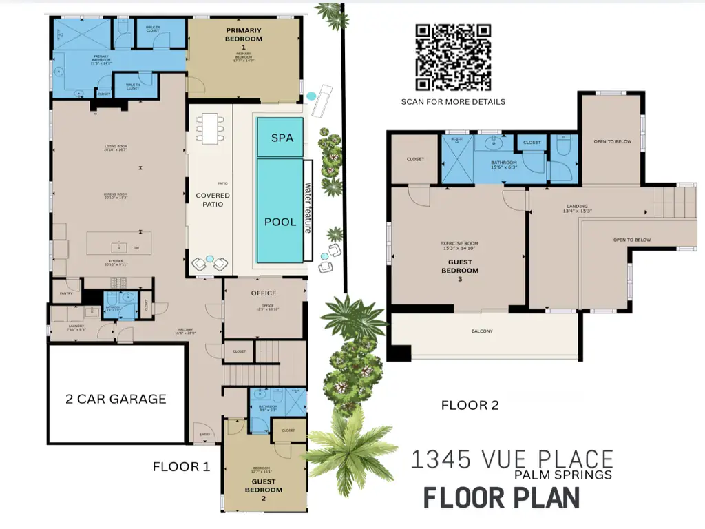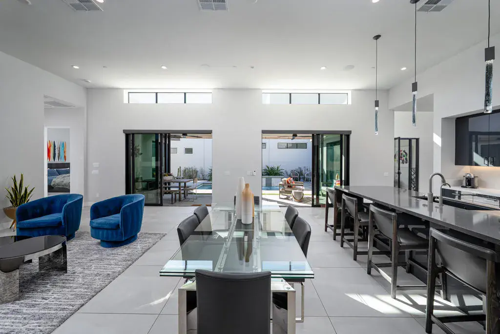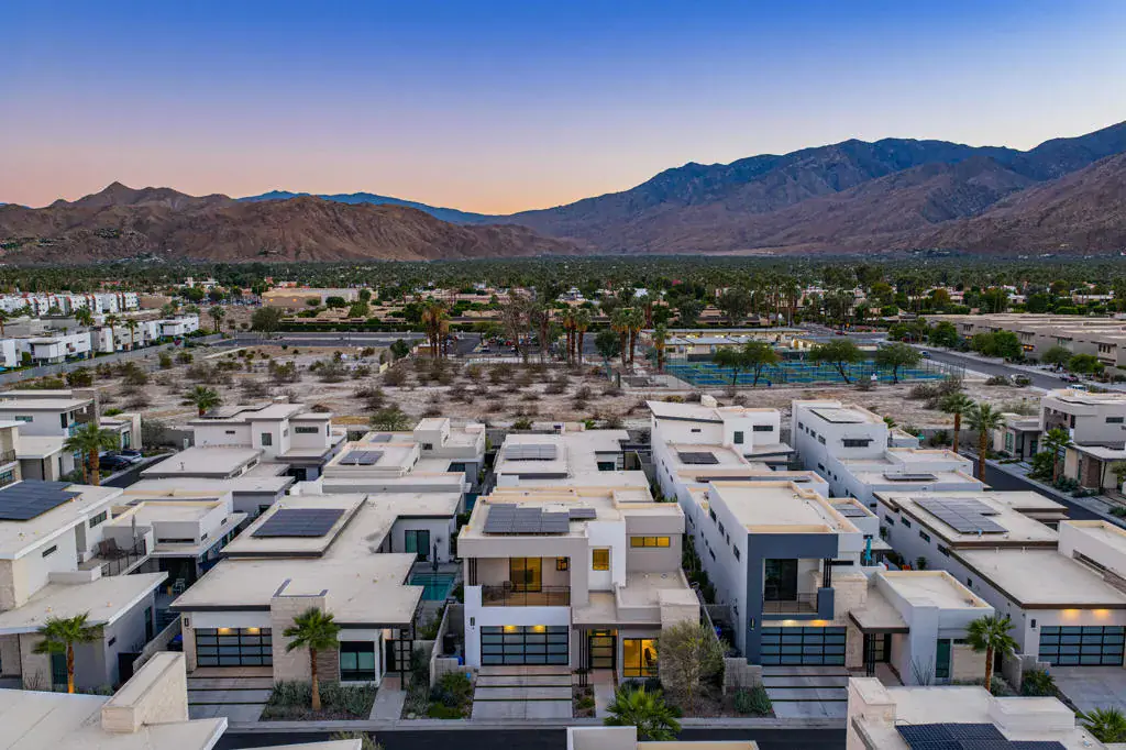 Take advantage of an all new price on an exceptional contemporary property in downtown Palm Springs. Thoroughly upgraded, find a three-bedroom+den (currently an office), three-bath home at VUE where design continuity is key. From the start, the oversized flooring tile and countertop finishes extend throughout, lending this property a serene harmony, and as you enter the home, a striking chandelier hovers high above the light dappled formal entry where first up is a main floor guest bedroom with ensuite bath, and a custom glass enclosed office that is easily converted to a 4th bedroom. The design opens seamlessly to a light-filled main living area and gourmet kitchen with entertaining in mind, a large island with ample bar seating, high-end Thermador appliances, and in service of meal preparation, fully filtered and softened water whole-house-wide. On the topic of entertaining, the adjacent dining area can accommodate a dinner party for 10, and then, dessert afterwards, in the attractive living area anchored by a modern fireplace tiled to the ceiling.The primary suite brings the outside in, with direct access to the sunny patio where you find a salt water pool and spa made deeper than the spec pool, and upgraded pebble-tec surfacing, lighting, and water feature. On the second floor, you find a penthouse bedroom/flex/gym room (BDR 3) with ensuite and walk in closet that enjoys a private balcony with view of the surrounding community and mountains beyond. In addition, the improvements made include 30 owned solar panels offering substantial energy savings.Experience this sleek and sophisticated 2023 property, superbly located within the gated VUE community, and minutes from the center of Palm Springs and all it has to offer.