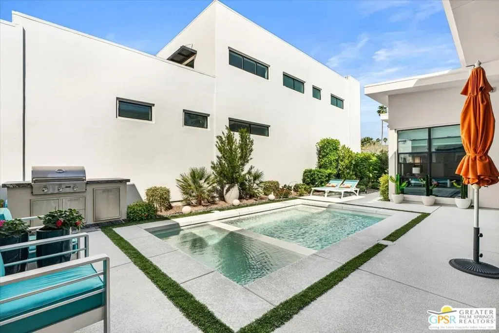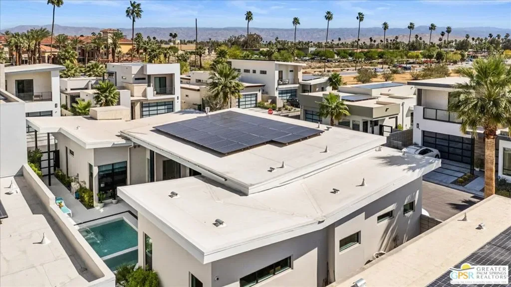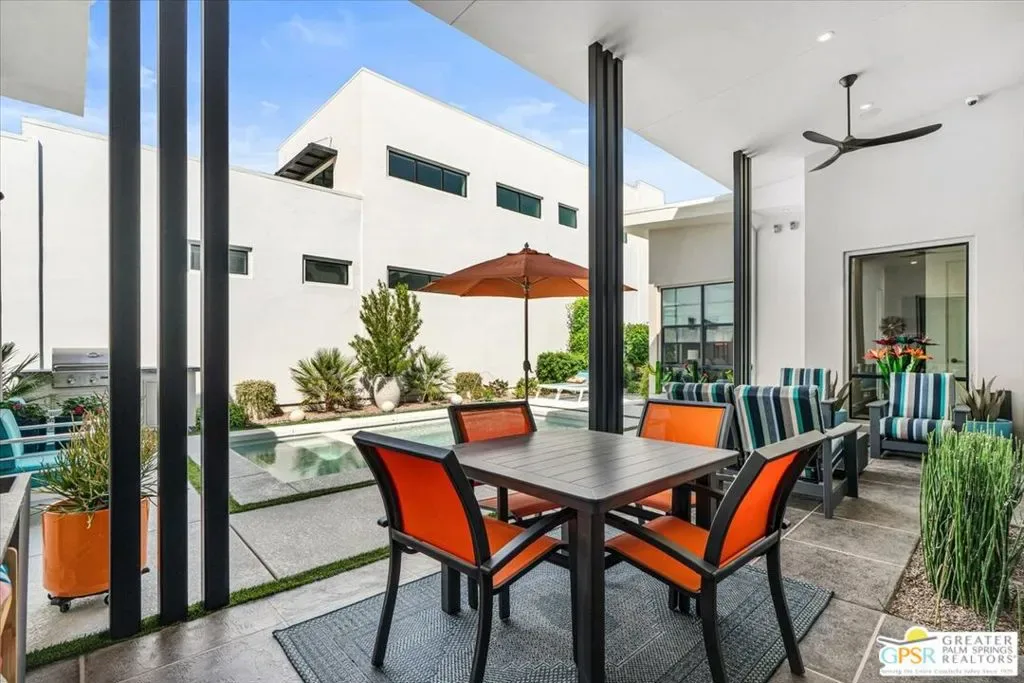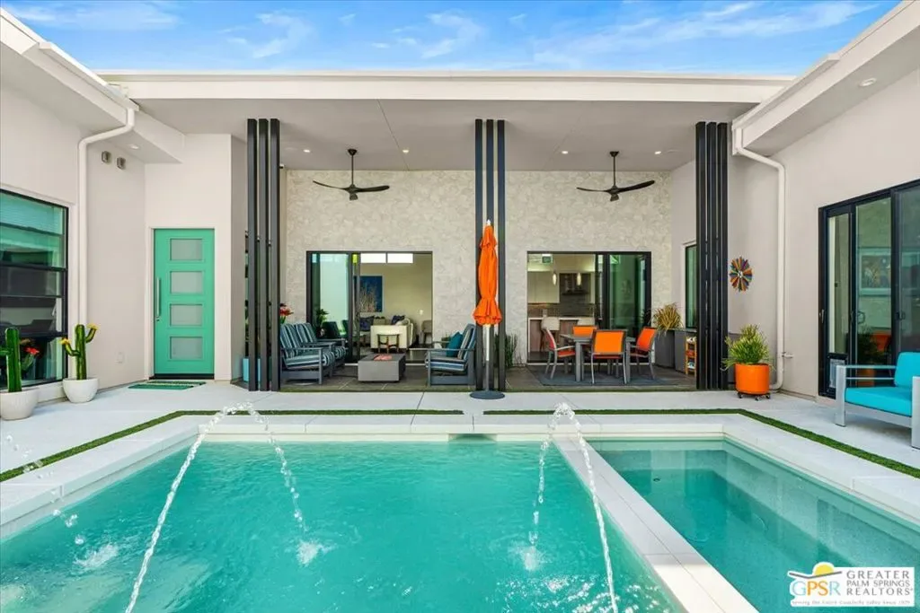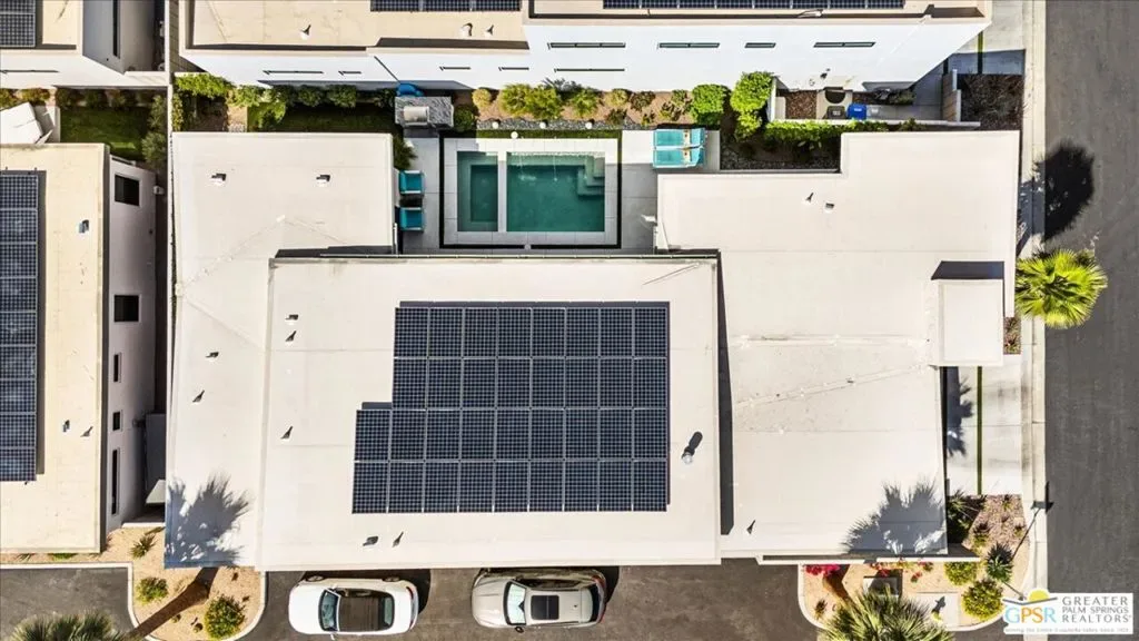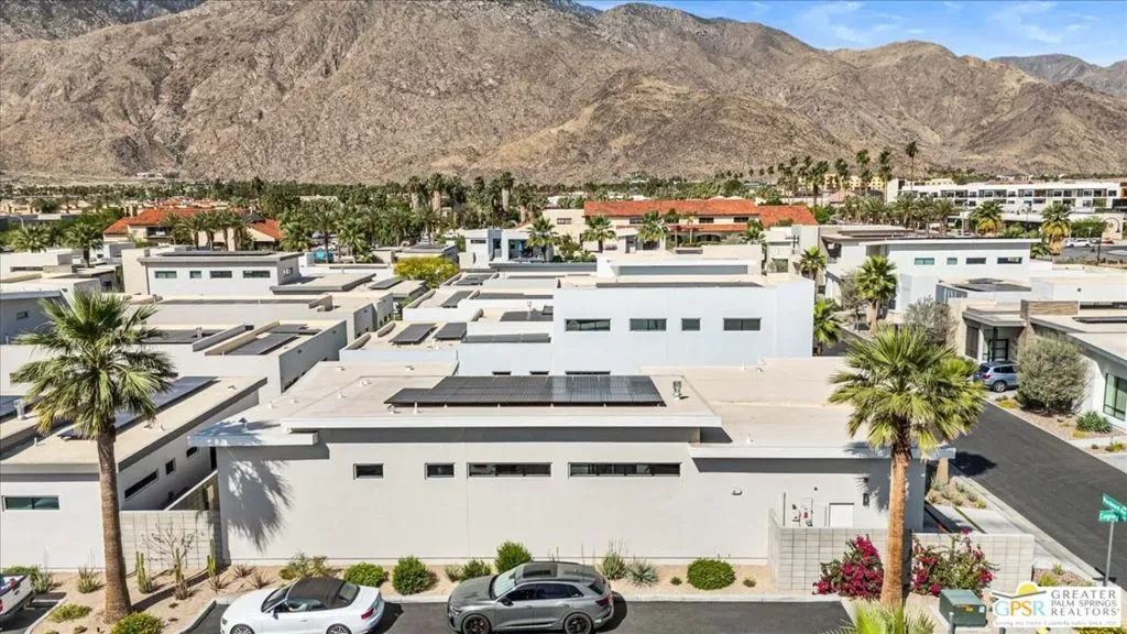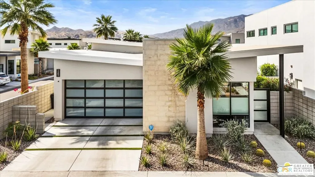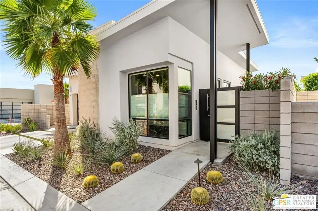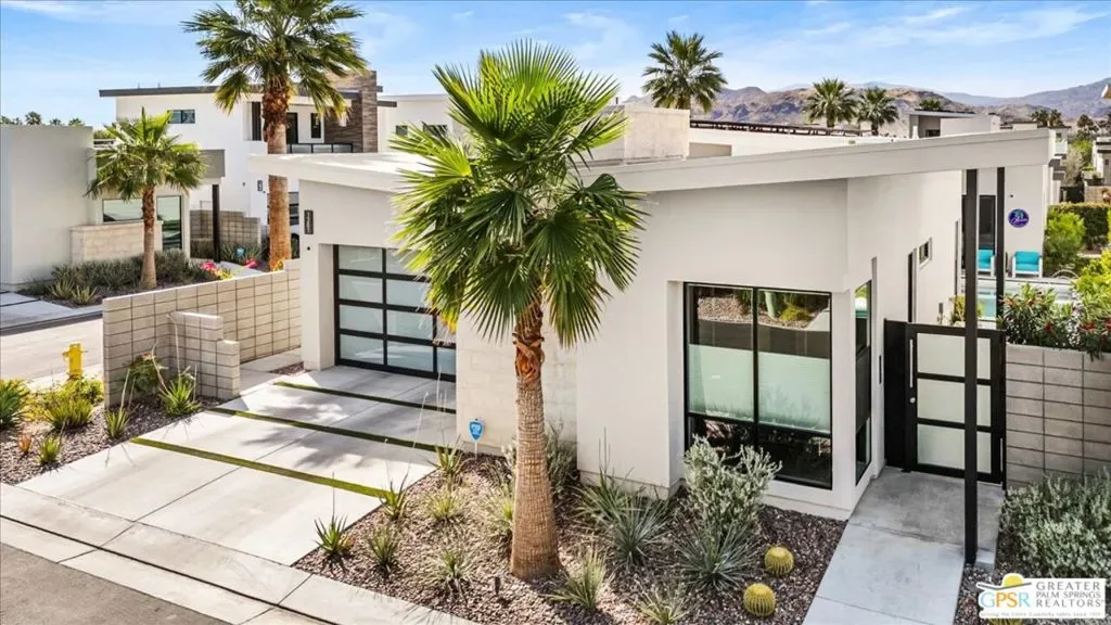 Located in the heart of vibrant Palm Springs, this modern home in the gated community of Vue is your perfect desert retreat. With 3 spacious bedrooms and 3 beautifully upgraded baths, this property is packed with luxurious features that elevate everyday living. Step inside to discover a sleek, open layout boasting a gourmet kitchen equipped with upgraded appliances, a gas fireplace for cozy evenings, and high-tech touches like electronic blinds, drapes, and a Sonos surround sound system. Ceiling fans throughout and a custom-built primary closet add both comfort and style. Outside, soak up the desert sunshine in your private oasis with dining, seating and lounging areas. The saltwater pool and spa, complete with water features and a pebble tech finish, are complemented by a Cool-Tech patio and a built-in BBQ station perfect for entertaining or unwinding under the stars. Additional perks include 34 owned solar panels with a backup battery, a full house water filtration and purification system, plus an air-conditioned, epoxy-floored 2-car garage. For added peace of mind, the home is equipped with an alarm system, cameras, a DoorBird entry system and whole house surge protection. This is more than just a home; it’s a lifestyle. Don’t miss your chance to own this stunning Palm Springs gem!