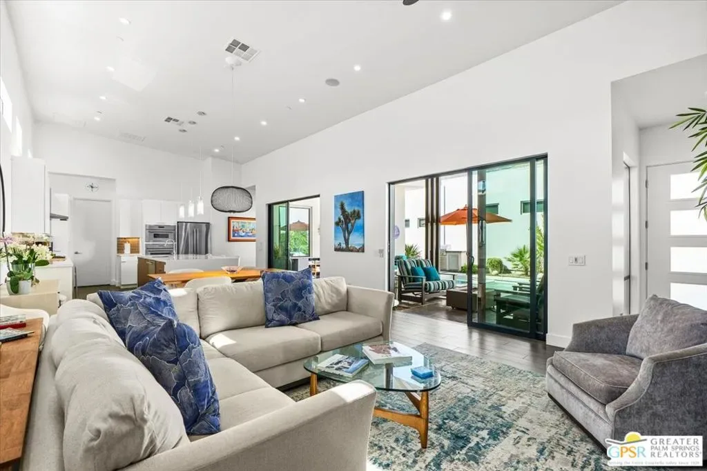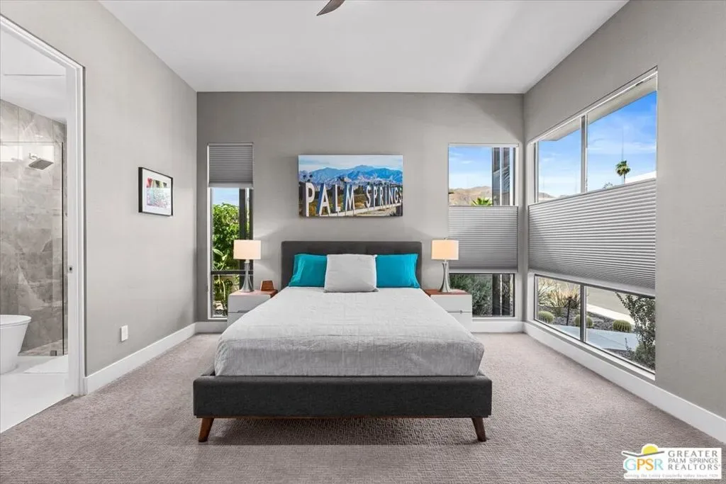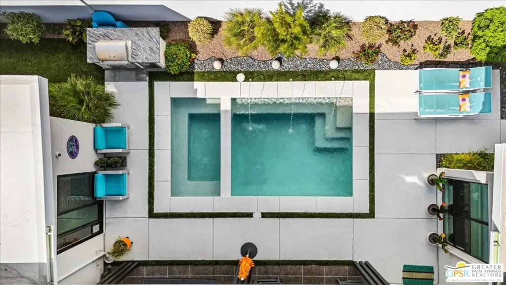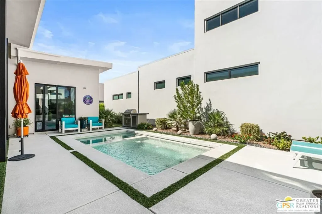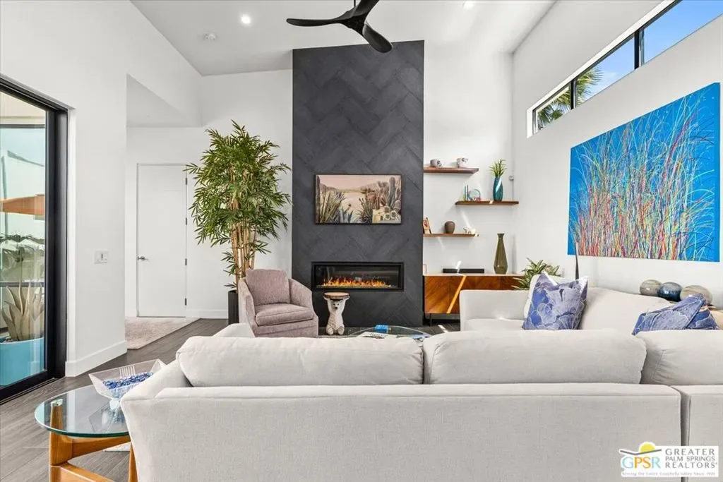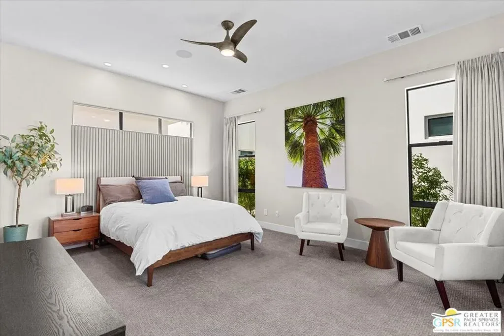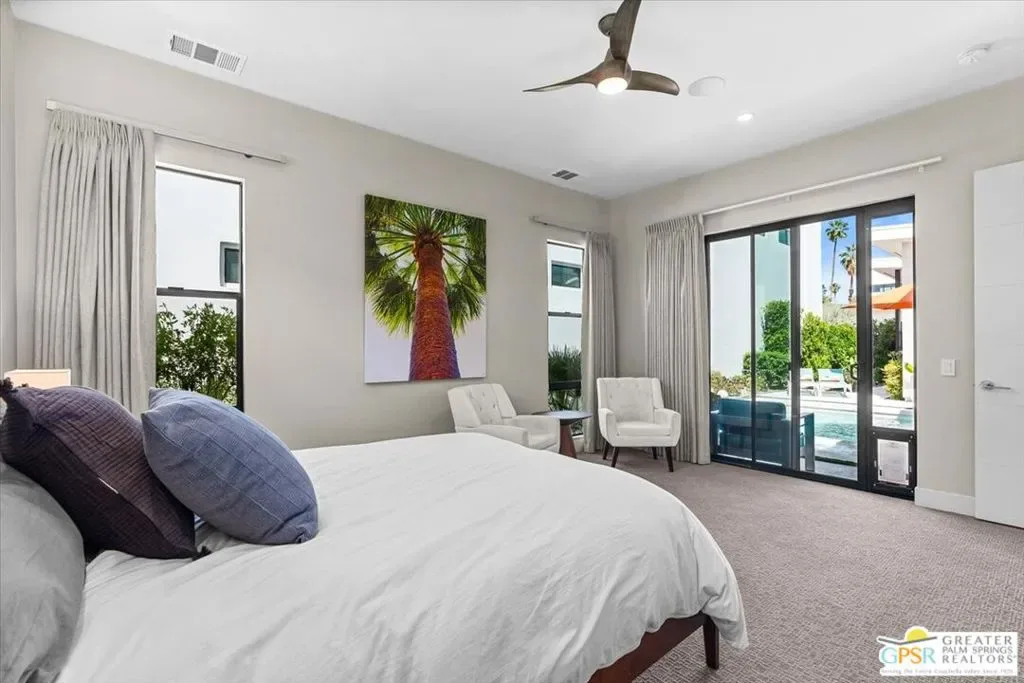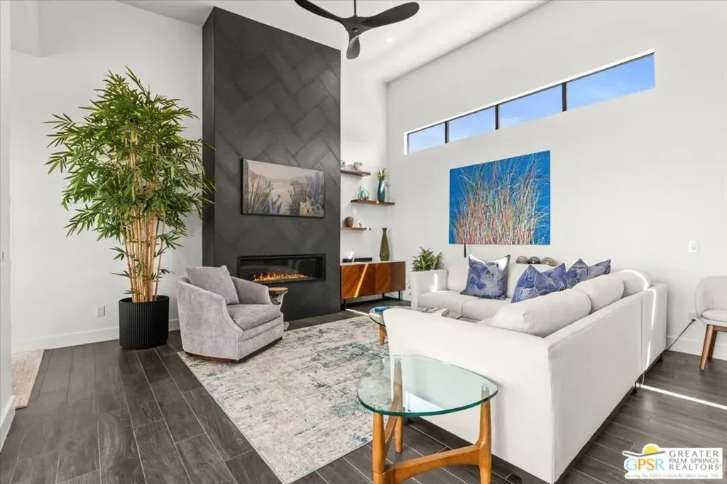Located in the heart of vibrant Palm Springs, this modern home in the gated community of Vue is your perfect desert retreat. With 3 spacious bedrooms and 3 beautifully upgraded baths, this property is packed with luxurious features that elevate everyday living. Step inside to discover a sleek, open layout boasting a gourmet kitchen equipped with upgraded appliances, a gas fireplace for cozy evenings, and high-tech touches like electronic blinds, drapes, and a Sonos surround sound system. Ceiling fans throughout and a custom-built primary closet add both comfort and style. Outside, soak up the desert sunshine in your private oasis with dining, seating and lounging areas. The saltwater pool and spa, complete with water features and a pebble tech finish, are complemented by a Cool-Tech patio and a built-in BBQ station perfect for entertaining or unwinding under the stars. Additional perks include 34 owned solar panels with a backup battery, a full house water filtration and purification system, plus an air-conditioned, epoxy-floored 2-car garage. For added peace of mind, the home is equipped with an alarm system, cameras, a DoorBird entry system and whole house surge protection. This is more than just a home; it’s a lifestyle. Don’t miss your chance to own this stunning Palm Springs gem!