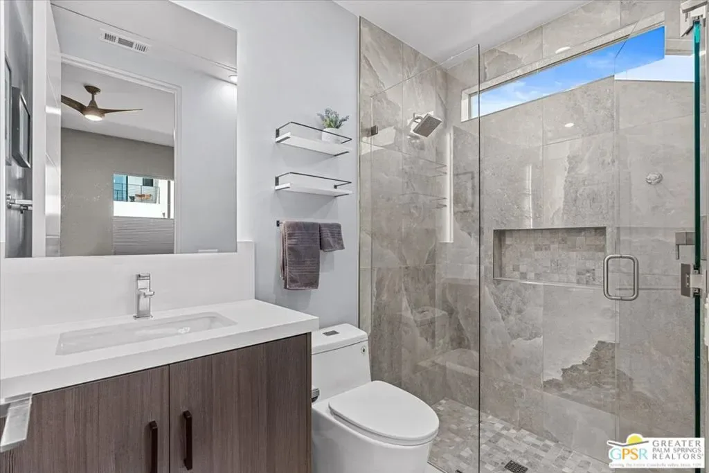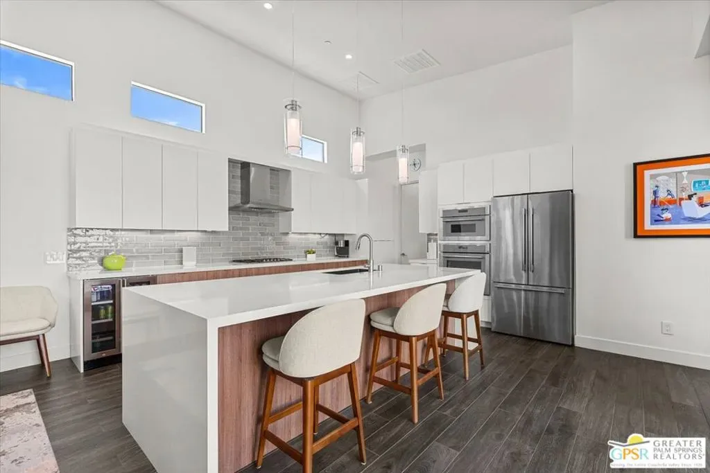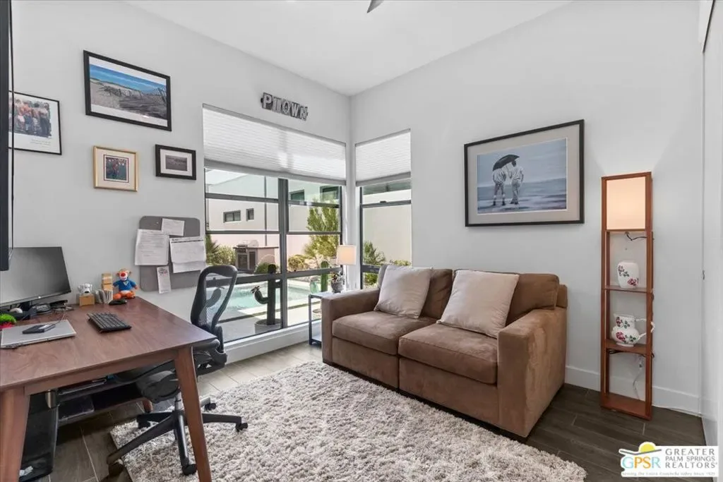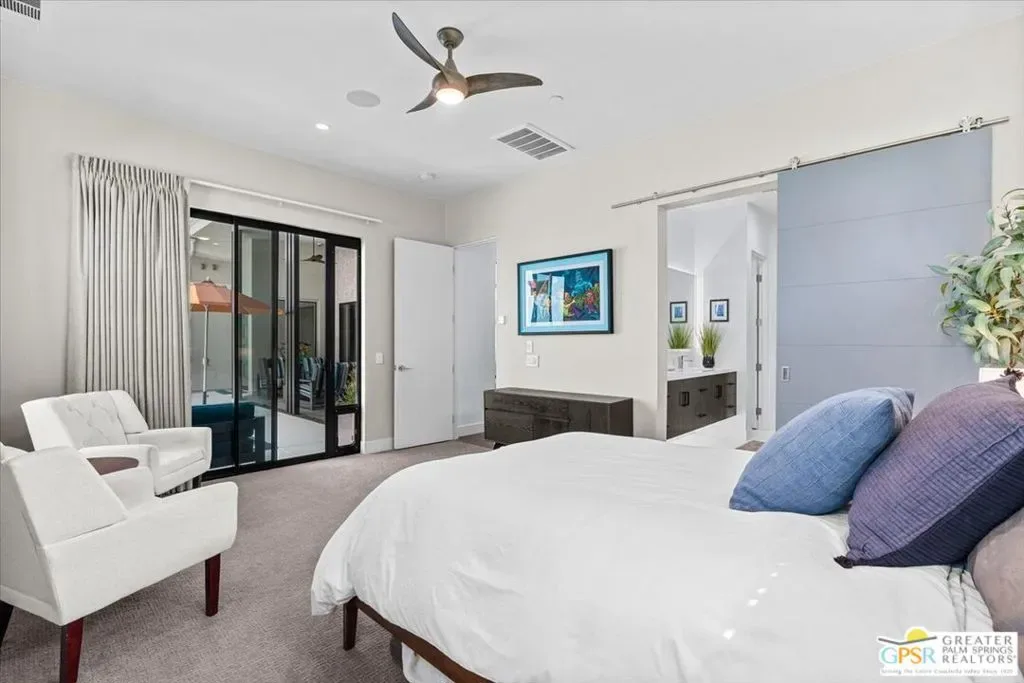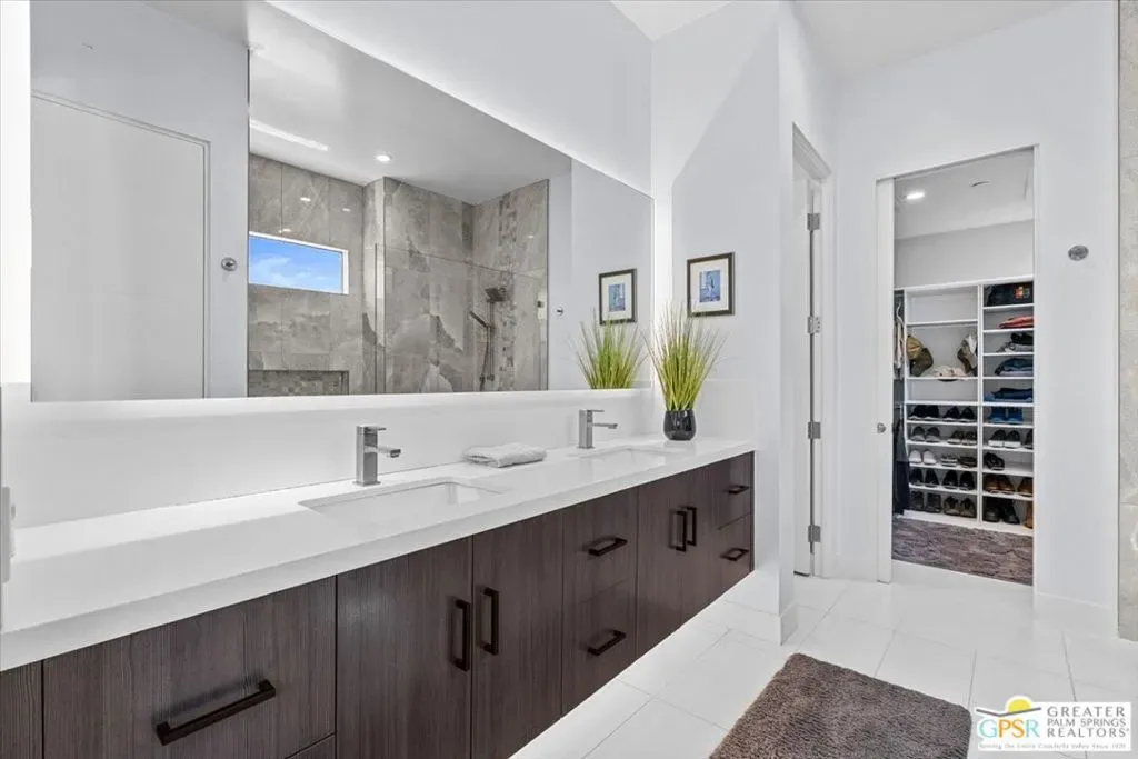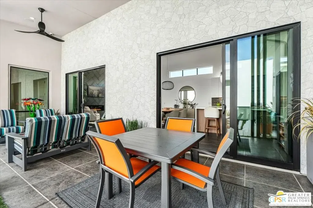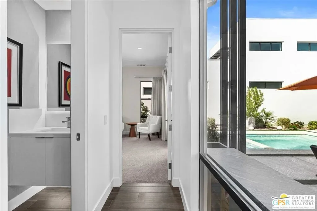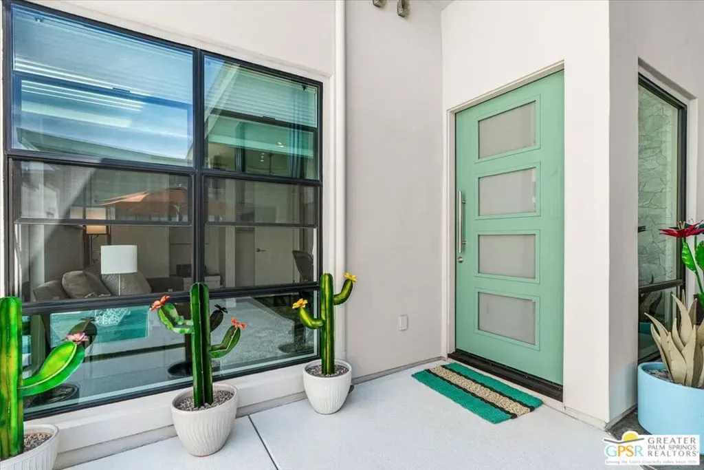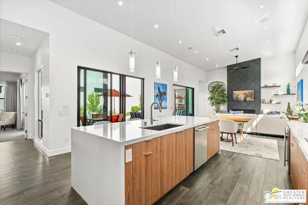 Located in the heart of vibrant Palm Springs, this modern home in the gated community of Vue is your perfect desert retreat. With 3 spacious bedrooms and 3 beautifully upgraded baths, this property is packed with luxurious features that elevate everyday living. Step inside to discover a sleek, open layout boasting a gourmet kitchen equipped with upgraded appliances, a gas fireplace for cozy evenings, and high-tech touches like electronic blinds, drapes, and a Sonos surround sound system. Ceiling fans throughout and a custom-built primary closet add both comfort and style. Outside, soak up the desert sunshine in your private oasis with dining, seating and lounging areas. The saltwater pool and spa, complete with water features and a pebble tech finish, are complemented by a Cool-Tech patio and a built-in BBQ station perfect for entertaining or unwinding under the stars. Additional perks include 34 owned solar panels with a backup battery, a full house water filtration and purification system, plus an air-conditioned, epoxy-floored 2-car garage. For added peace of mind, the home is equipped with an alarm system, cameras, a DoorBird entry system and whole house surge protection. This is more than just a home; it’s a lifestyle. Don’t miss your chance to own this stunning Palm Springs gem!