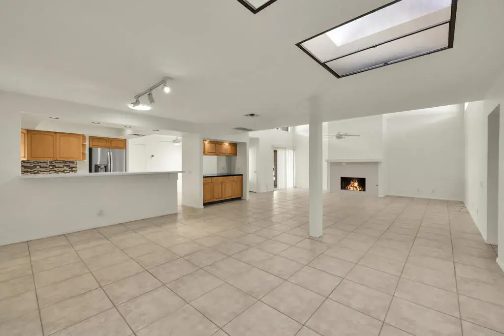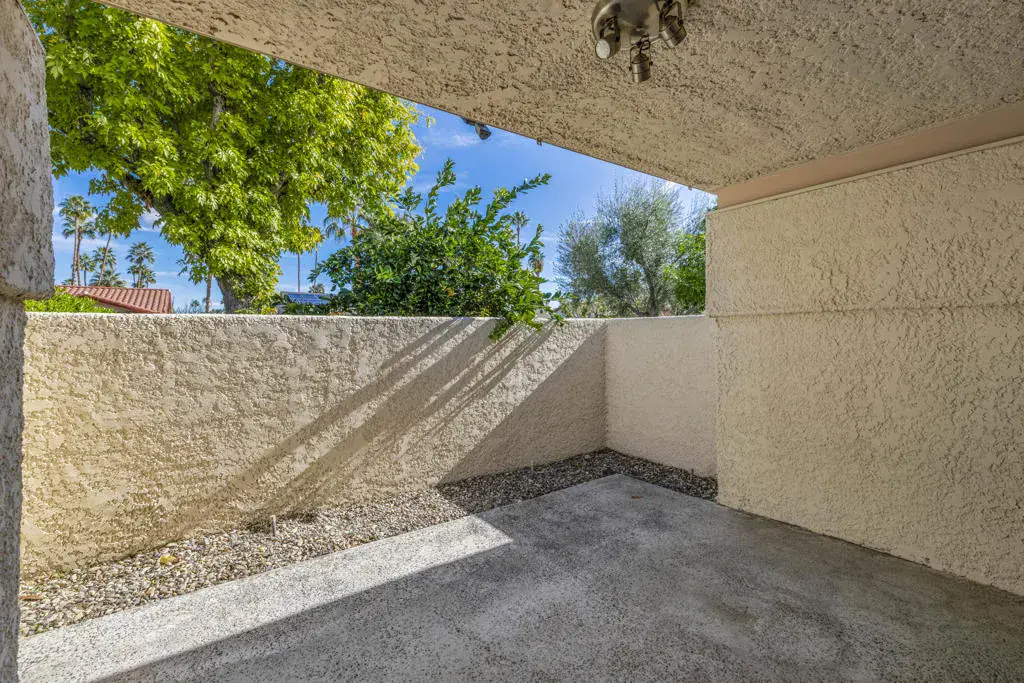 Location plus! FEE SIMPLE (not lease land) in desirable south Palm Springs. This rarely offered single story Plan D model is one of only four in the Versailles community, conveniently located across the street from Smoke Tree Village. As you enter the home, there is a private enclosed and tiled front courtyard patio; perfect for lovely Happy Hour views of Mt San Jacinto. Once inside the home you’ll notice the Open Floorplan with very high ceilings, recessed lighting, onyx granite fireplace, wet bar and clerestory windows, making it light & bright. The kitchen and breakfast bar has direct front courtyard access and with slab stone counters, maple cabinets and stainless steel appliances, it’s a great space to cook while entertaining. Nice separation of bedrooms with private patios off each one. Both of the bathrooms have been remodeled and feature stone counters, tiled tub enclosure in one bathroom and a tiled shower in the other, newer fixtures and glass enclosures. Two car garage with direct access to the home. Four community pools and spas plus two community tennis courts. The square footage may actually be larger to an earlier reported sale size showing 1,602 SqFt, which may have come from the expanded dining room (former atrium?).