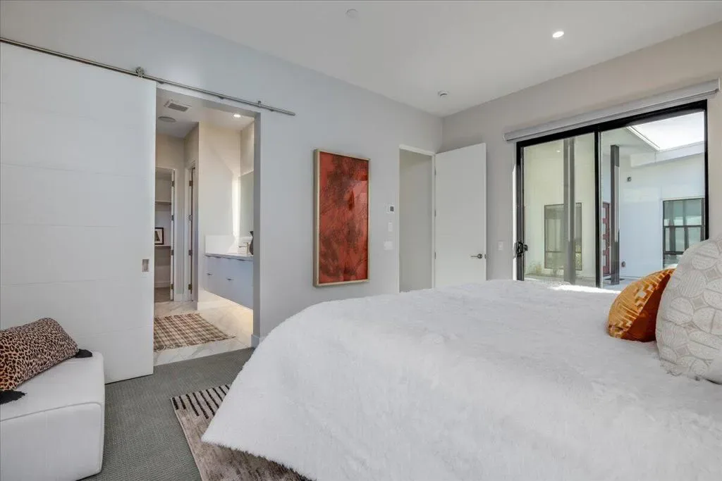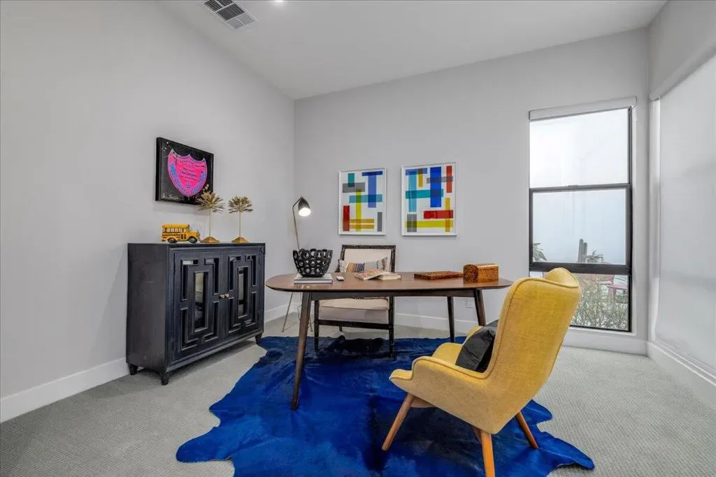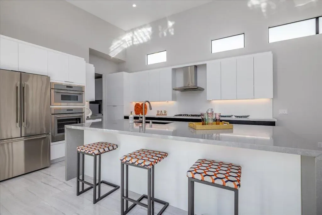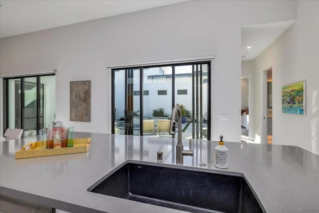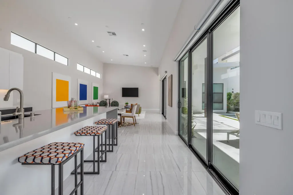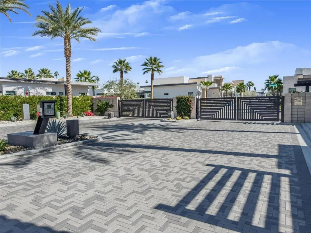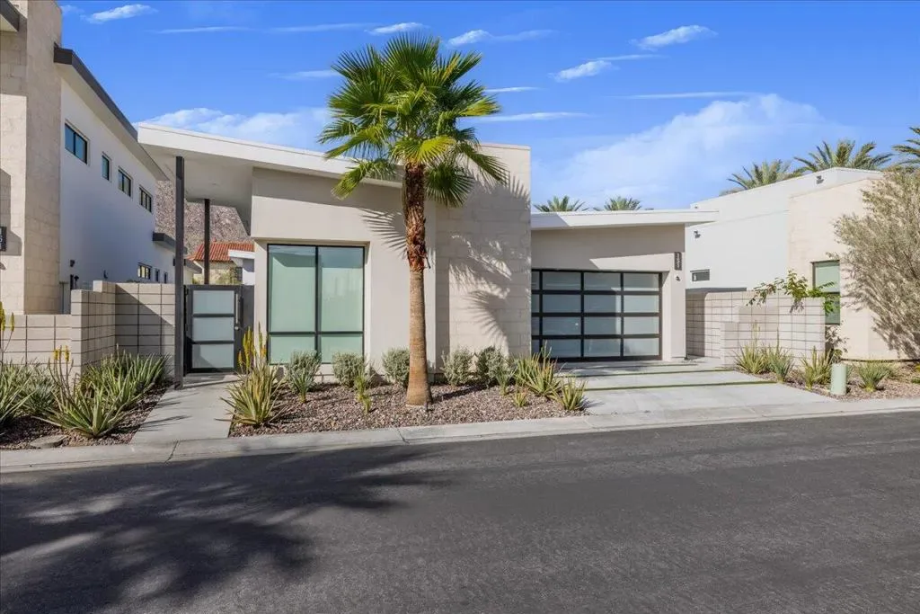Iconic mid-century design meets modern luxury in The Vue, a gated enclave in the heart of central Palm Springs. Completed in 2023, this single-story architectural residence offers refined design, seamless indoor-outdoor living, and timeless desert appeal. The home’s striking butterfly roof sets the tone, while an open-concept layout is flooded with natural light from expansive clerestory windows. Thoughtfully designed for both entertaining and everyday comfort, the residence features 2 spacious bedrooms, 2.5 bathrooms, and a versatile office/den.The chef’s kitchen commands attention with premium Thermador appliances, quartz countertops, and a dramatic waterfall island, flowing effortlessly into the living area for a clean, contemporary aesthetic. Dual multi-slide glass doors open to a private backyard retreat with a covered patio ideal for dining and relaxation. A south-facing cocktail pool with Pebble Tec finish and three cascading waterfalls delivers a true resort-style experience, complemented by stunning views of the San Jacinto Mountains. Notable upgrades include built-in speakers with Sonos system, custom electric blinds throughout, a hardwired alarm system, and owned solar panels, blending luxury with energy efficiency. Just minutes from Palm Springs’ top restaurants, shopping, and iconic hotels, this is a rare opportunity to own a nearly new architectural home in one of the city’s most desirable locations.