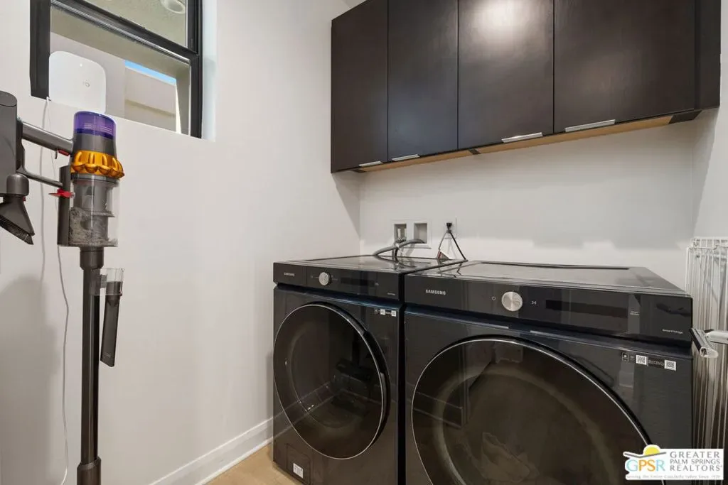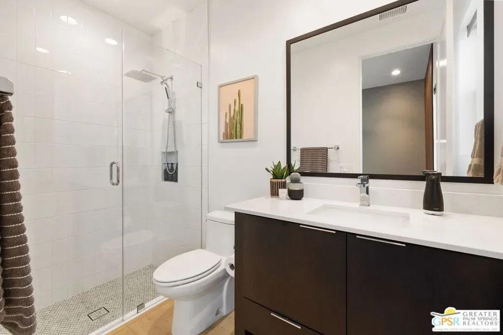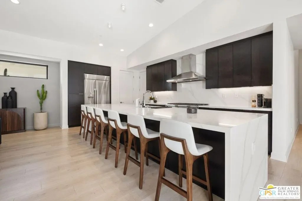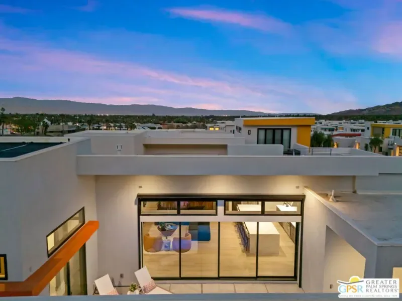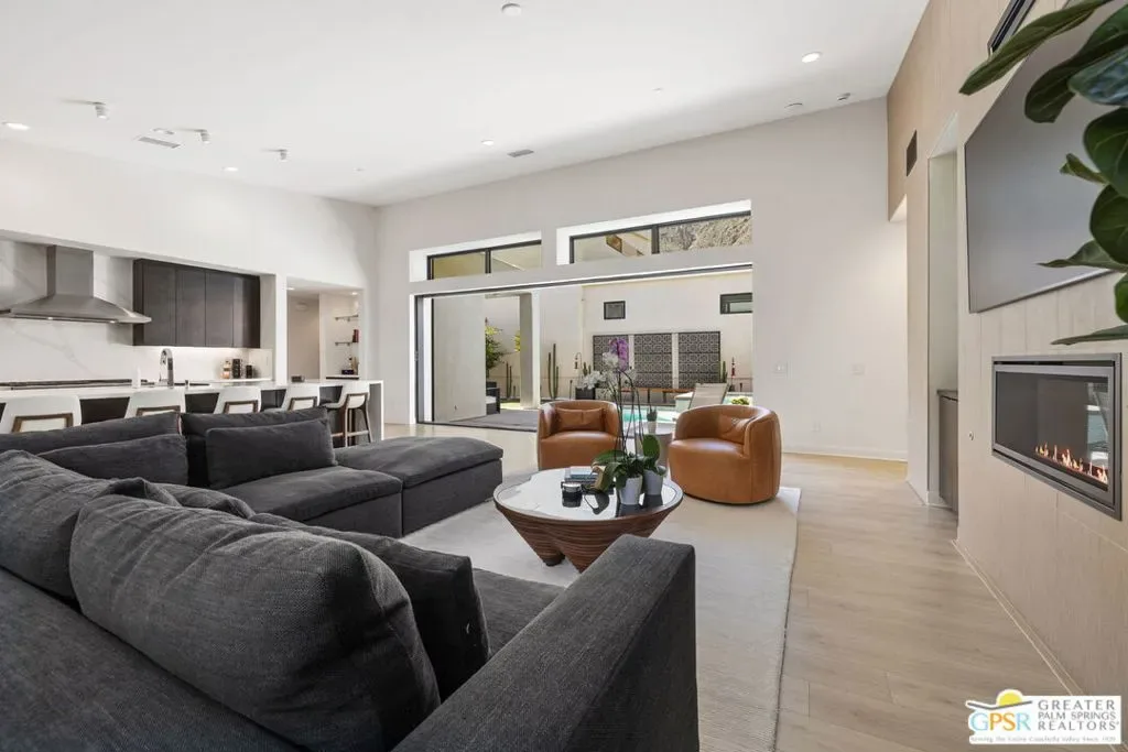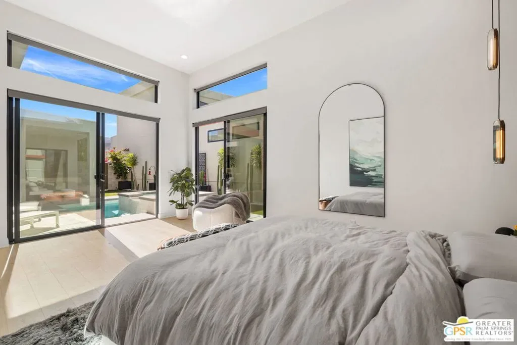 Light, volume, and mountain drama take center stage in this striking modern retreat just moments from downtown Palm Springs. Built for the Palm Springs good life and designed to entertain, thoughtful design and attention to detail shine throughout this highly upgraded 3 bedroom, 3.5 bath home. New construction circa 2022 on fee simple land with owned solar offers approximately 2,280 square feet of single level modern desert architecture. Mountain views steal the show through a dramatic series of clerestory windows, flooding the main living areas with natural light. Eighteen foot vaulted ceilings, a smartly designed floor plan with excellent bedroom separation, and expansive multi slide glass doors create seamless indoor outdoor flow to the patio. The solar heated pool and spa with waterfall set the scene, while a sleek fireplace anchors the living room for cozy desert nights. The chef’s kitchen brings the wow factor with Thermador appliances and an oversized waterfall edge quartz island seating six and made for gathering. The primary suite is a true retreat, framed by glass sliders opening directly to the pool and finished with a striking wood tile accent wall, while the light filled ensuite bath features dual vanities with illuminated mirrors, an oversized shower, and a generous walk in closet. Guest bedroom two is ensuite and enjoys its own private tiled patio with mountain views, and an attached casita with full bath overlooks the pool and offers direct access to the poolside sitting area, perfect for guests, a home office, or weekend visitors. Extras include a powder bath, utility room, direct access two car garage, exterior solar shades, automated window treatments, Alexa controlled dimmer switches, EV charging, a mini split system in the garage, and a side yard and garden with turf underfoot. Elan is a boutique community of modern homes featuring a community pool and spa, dog park, bocce court, and exceptional walkability to downtown Palm Springs dining, shopping, and nightlife. Easy, stylish, and unmistakably Palm Springs.