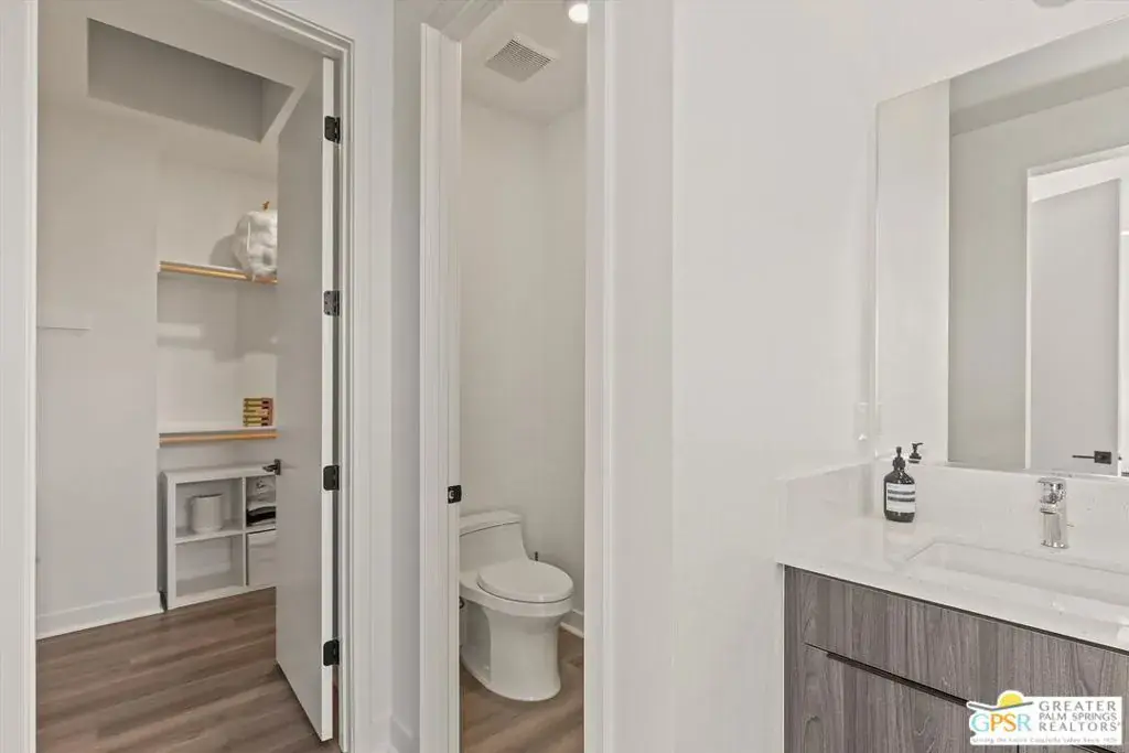 This stunning, highly upgraded condo in the desirable gated community of Cody Place offers the perfect blend of modern design and resort-style living; all framed by spectacular San Jacinto mountain views. As an end unit, this home is bathed in natural light with additional windows throughout, creating a bright, airy, and inviting atmosphere. The spacious great room and dining area are anchored by a gourmet kitchen featuring an oversized island, full-height cabinetry, stainless steel appliances, and quartz countertops with custom tile backsplash. Expansive sliding panel doors open to large covered balconies on both sides, seamlessly blending indoor and outdoor living and capturing breathtaking views from every angle. Upstairs, the primary suite serves as a private retreat with its own covered balcony and a spa-inspired bath with a generous walk-in closet. The upstairs den or office also opens to another covered balcony with unparalleled mountain and city views. The lower level features a private ensuite guest room with access to a secluded patio. Additional highlights include owned solar panels, porcelain tile and luxury vinyl plank flooring, and an attached two-car garage. Residents of Cody Place enjoy a beautifully designed clubhouse, two pools and spa, outdoor lounge and fire areas, BBQ, and a dog park; all within a secure, gated community that truly embodies Palm Springs resort living.