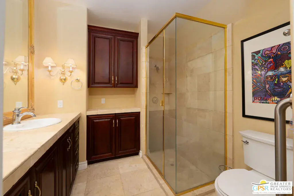 Investor Opportunity. Large Mediterranean estate in prestigious Andreas Palms. This 4 bedroom and 5 bathroom home spans 5,124 square feet of living space on ONE LEVEL, and has a 180 degree view from the backyard of southern and western mountains. Resting on a .65 acre lot, located in the south Palm Springs community of Andreas Palms, this intimate gated community is home to expansive homes, nice neighbors and UNOBSTRUCTED panoramic mountain views. The enormous kitchen includes two preparation and serving islands, granite counters, stainless steel appliances with gas cooking and walk-in pantry. Open to the dining area and living room, the heart of the home resides here with a one-of-a-kind stone fireplace/surround and French doors to the back patio and pool. The floor plan is wonderful with a complete separation of primary and guest bedrooms on opposite sides of the home. Two guest bedrooms with ensuite bathrooms and outdoor patio access sit adjacent to the living room. The extra large primary bedroom hosts a seating area, walk-in closet and a separate bonus room with sink & mini fridge great for an office or fitness area. The spacious primary bath includes individual water closets with dual sink vanities, a large walk-in shower and an separate soaking tub. The lush green outside area of this home is an entertainer’s dream with lavish pool & spa area surrounded by park like settings. The back yard boasts large covered sitting areas, mature landscaping, a private pool and spa that waterfalls into the pool. Capture unobstructed views from the upper spa patio with no one behind you. Additional features include a long driveway, 3-car garage, fee land you own, 32-panel solar system and 180 degree mountain views. Enjoy the peacefulness and inspiring mountain views with no one behind you. Your Palm Springs retreat home.
