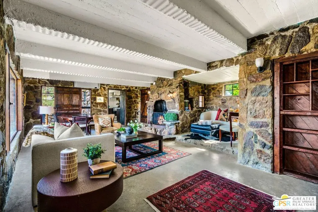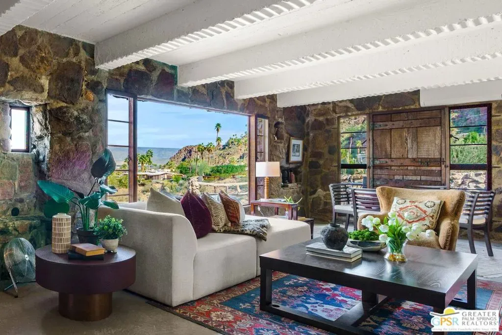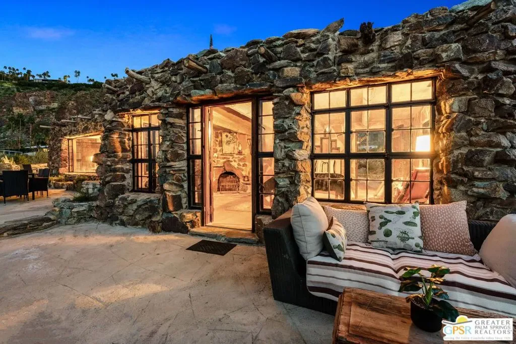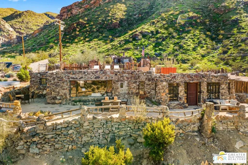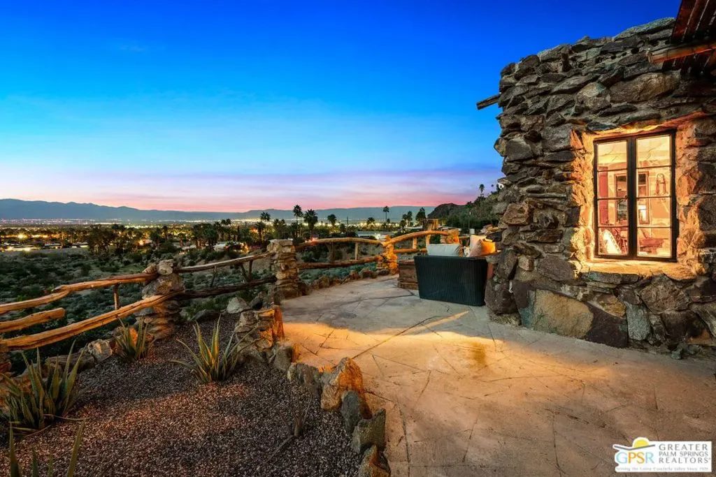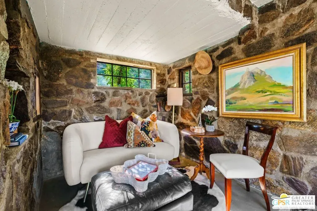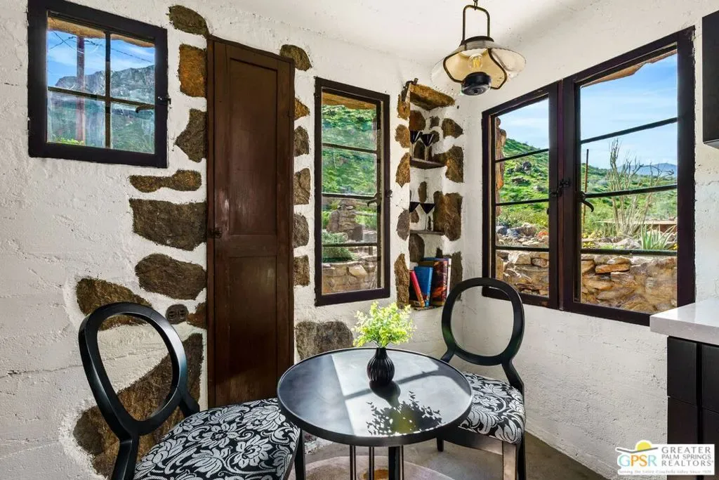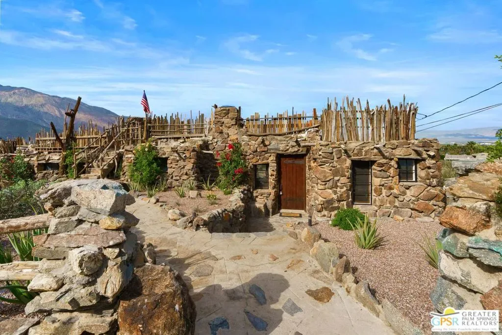 Perched high above Araby Cove, 2550 South Araby Road is a rare and storied treasure and one of Palm Springs iconic Rock Houses, originally built in 1929 by R. Lee Miller. This historic residence is a singular blend of architecture, history, and landscape, offering sweeping panoramic views across the desert floor and exceptional privacy. Access is provided via a private road with restricted entry. Designated a Class One Historic Landmark by the City of Palm Springs, the home showcases handcrafted artistry throughout. Stone walls rise organically from the mountainside, while original details remain beautifully intact, including hand carved doors and windows, custom shelving, exposed ceiling beams, ironwork door latches, handmade fireplace tools, and two original fireplaces, one of which includes a preserved stove pipe. A hidden room concealed behind a bookcase adds intrigue, and a deeply personal historical detail remains etched into the stone, as the original owner, Perle Martin Wheeler, carved her name into a nook in 1931. Respectfully honoring the home’s architectural legacy, the current owners acquired the property in late 2024 and completed a thoughtful transformation, bringing the residence into the modern era while preserving its soul. Extensive upgrades include updated plumbing, electrical, and HVAC systems, new appliances, an EV charger, and infrastructure improvements throughout the property. The roof was fully replaced in August 2022, providing long term durability. The main residence features one bedroom and two bathrooms, complemented by two detached studio casitas, each with its own en suite bathroom. These spaces offer exceptional flexibility and are ideal for guests, multigenerational living, creative use, or private retreats. Meandering pathways, updated irrigation, and curated desert landscaping create a serene environment where native wildlife and natural beauty take center stage. A morning walk along the northern path reveals the desert awakening from the rock garden below. The extensive desert landscaping was thoughtfully designed by renowned Palm Springs landscape consultant Paul Ortega, an expert in desert horticulture and water management, and President Emeritus and Co Founder of the Desert Horticultural Society of the Coachella Valley. This historic property allows short term rentals, a rare benefit for a Class One designation. In addition, Class One homes in Palm Springs may qualify for Mills Act contracts, which can offer potential property tax benefits. Buyer to verify. More than a home, 2550 South Araby Road is a living work of art where architectural significance, timeless craftsmanship, and some of the most breathtaking views in Palm Springs converge into a truly irreplaceable desert retreat.