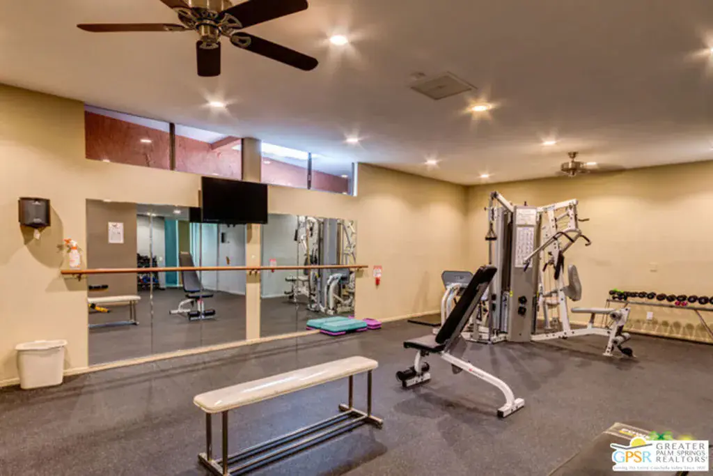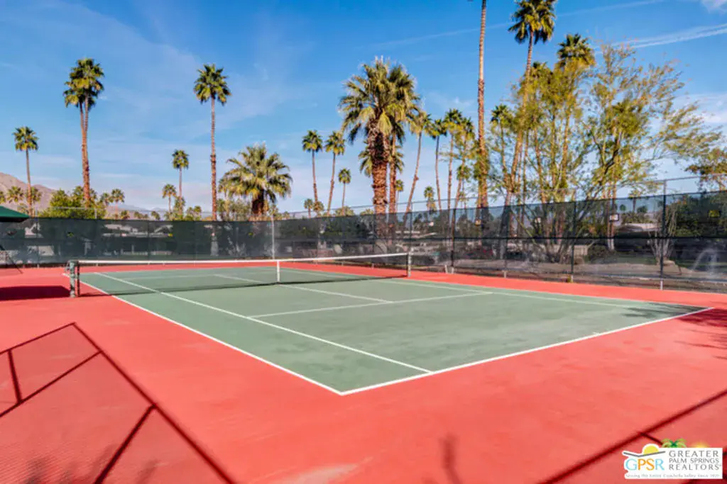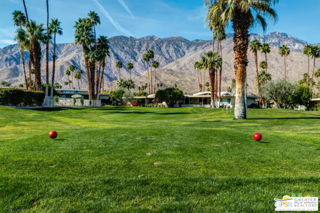 Experience Mid-Century Modern Living in Canyon Estates! Discover the hallmark of mid-century modern architecture in the sought-after Canyon Estates community, where acclaimed architect Charles E. Du Bois designed homes that blend timeless style, comfort, and sophistication – perfectly capturing the quintessential Palm Springs iconic lifestyle. Step through an elegant reeded glass double-door entry into a welcoming foyer that opens to a stunning living room, complete with a signature umbrella open beam style ceiling. Walls of glass and iconic clerestory windows frame dramatic east-facing mountain views and invite abundant natural light. The space flows seamlessly to a broad, covered patio overlooking a serene greenbelt with the mountains beyond – ideal for indoor-outdoor entertaining. A floor to ceiling stone-clad fireplace with white marble hearth and “Rat Pack” ready wet bar add to the authentic Palm Springs vibe. This thoughtfully upgraded, move-in-ready home is furnished in a warm neutral palette and features: 2 great ensuite primary bedrooms plus 2 additional bedrooms (currently used as a den and office), 3 well- appointed bathrooms, custom wood built-ins in the den, add functionality and elegance. Modern upgrades include all new Milgard windows, doors, and clerestory windows. A bonus eat-in breakfast area is perfect for morning coffee and extended views. This and much more in easy single level luxury living. Residents enjoy an array of amenities, including 15 pools, 12 spas, tennis and pickleball courts, a PAR-3 golf course, and a clubhouse with a newly upgraded fitness center. These offerings foster an active and social lifestyle in a resort-like environment. With its low-density layout, Canyon Estates provides generous open spaces, a peaceful setting, and a true sense of community.