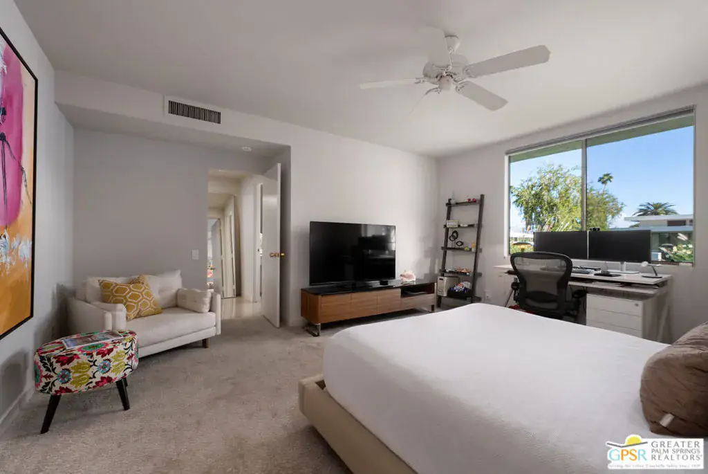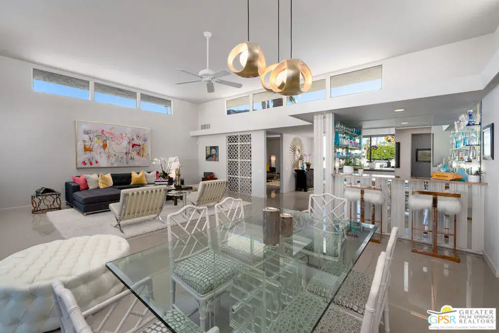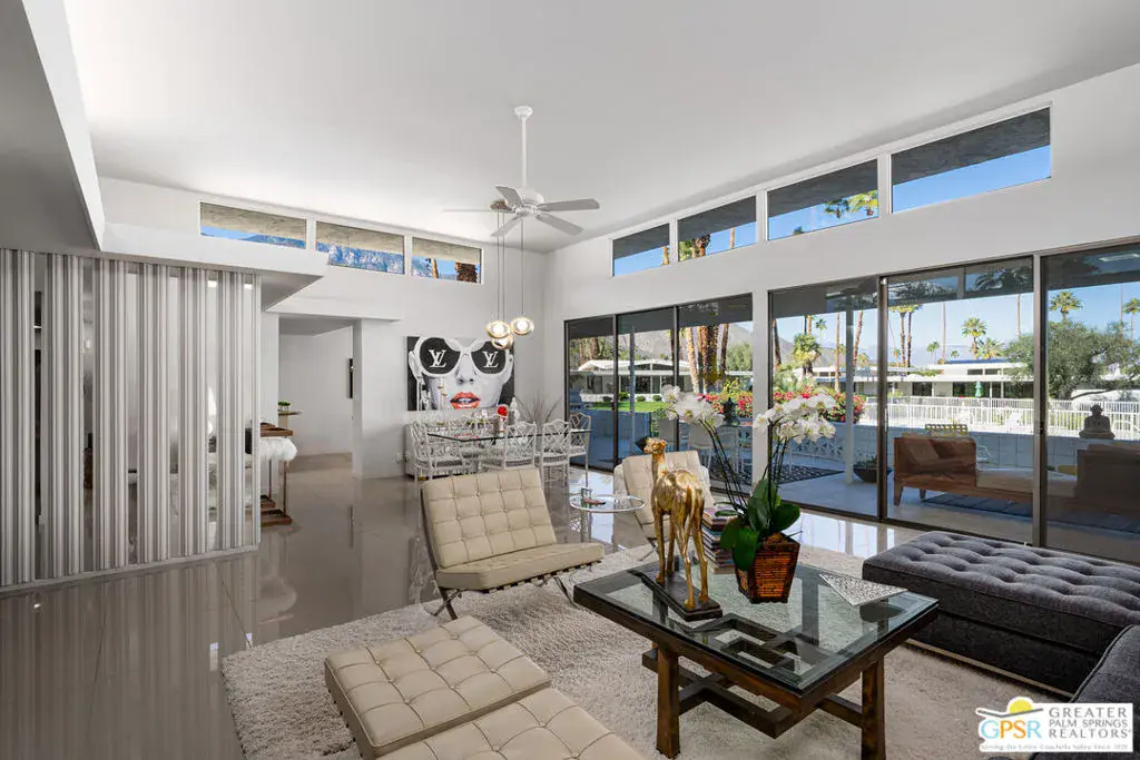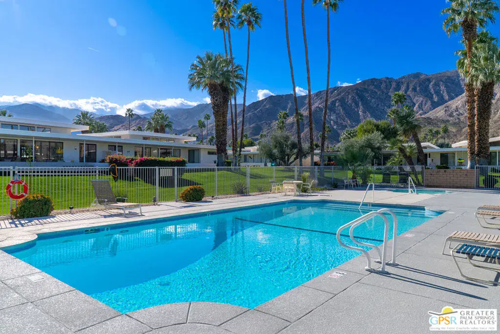 In the heart of South Palm Springs’ celebrated Canyon Estates, this Charles Du Bois designed residence stands apart for its rare scale, setting, and Fee Land location. Tucked at the end of a peaceful Cul-De-Sac, the home’s north-facing orientation delivers breathtaking, unobstructed views of the San Jacinto Mountains, best enjoyed from what is widely considered one of the largest private patios in Canyon Estates. The architecture is unmistakably desert modern: crisp lines, clerestory windows, and expansive glass walls that dissolve the boundary between indoors and out. Designed for both entertaining and everyday living, the home features two generous bedroom suites and a third bedroom, currently appointed as a refined den or private office, offering exceptional flexibility for modern lifestyles. The open-concept living area flows effortlessly from lounge to dining to a sophisticated wet bar, all opening directly to the patio – an ideal backdrop for hosting or quiet evenings under the mountains. The kitchen remains true to the original architectural vision while connecting seamlessly to outdoor dining. Residents of Canyon Estates enjoy a resort lifestyle with a nine-hole executive golf course, 15 pools, 12 spas, tennis courts, clubhouse, and fitness center. Minutes from Indian Canyons hiking, Andreas Hills, and downtown Palm Springs, this home offers a rare opportunity to own an architecturally significant residence.