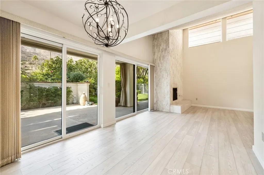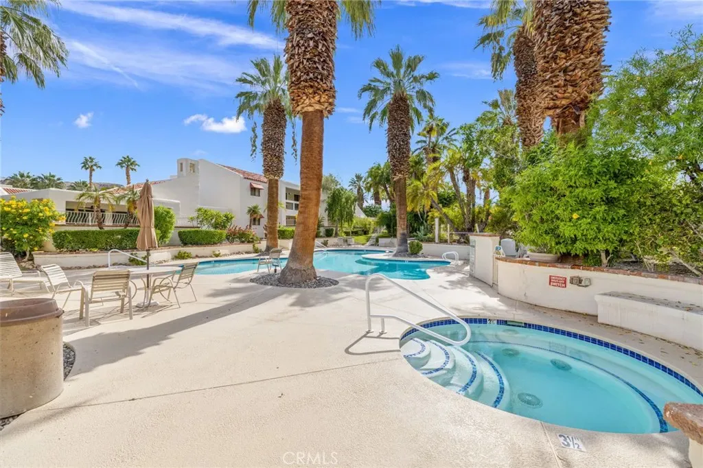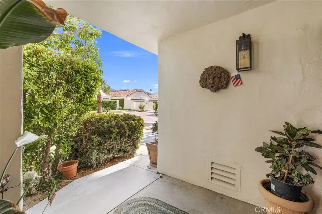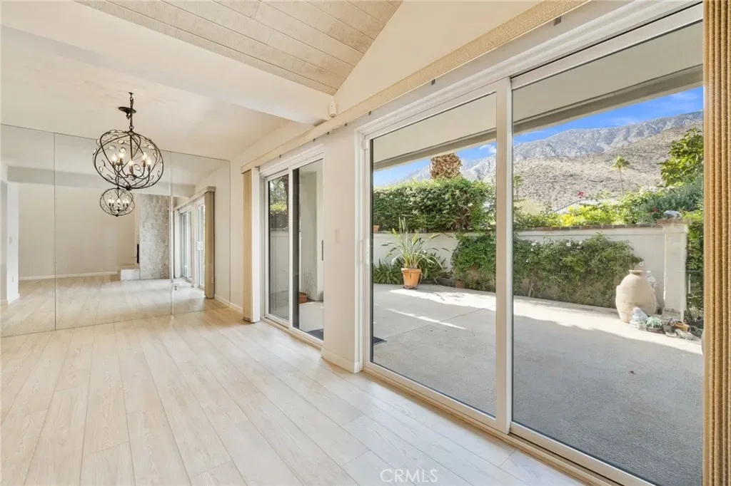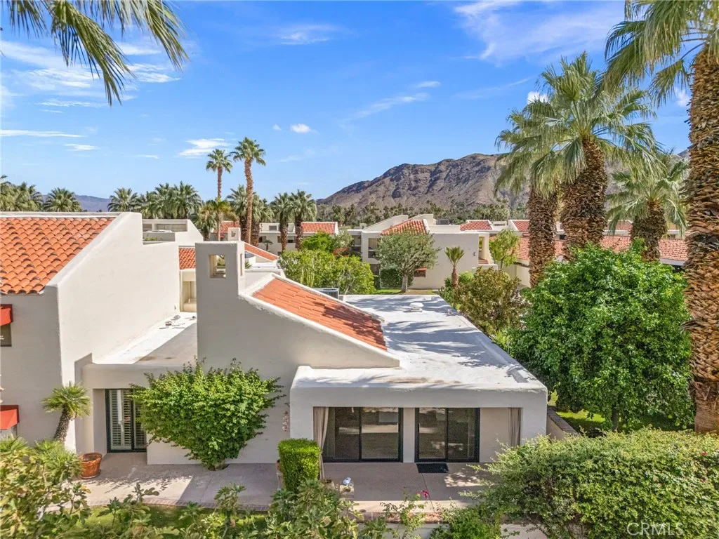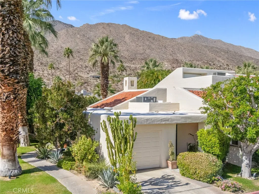 Discover this exceptional mid-century modern condo that offers the privacy and spacious feel of a single-family home. Situated in a gated community, this charming West-facing, end-unit, single-story home features brand new luxury vinyl floors, fresh paint throughout, and numerous upgrades including shutters, fridge, microwave, washer, dryer, and a brand-new water heater. In addition, there is NO LAND LEASE! providing long term value! The spacious living and dining areas feature stunning vaulted tongue-and-groove wood ceilings and a beautiful split marble fireplace, creating a light and airy ambiance complemented by breathtaking views of the San Jacinto Mountains. Step outside to the custom built front lanai; perfect for morning coffee surrounded by mature landscaped grounds. This home also offers custom shelving in the closets and garage, providing smart storage solutions. The back patio shares a yard with the community and has access to one of the pools. Resort-style amenities include two, tennis courts (one striped for pickleball!), pools and spas. Only one of several units to offer a convenient, attached one-car garage with direct access. Walk to downtown Palm Springs and enjoy the varied museums, unique shops, and incredible restaurants. Experience the perfect blend of classic mid-century design and elevated modern comfort in this beautifully maintained home. Don’t miss out on this chance to make it yours!