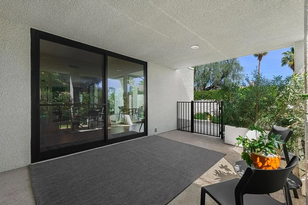 This exceptional 3-bedroom, 2.5-bath single-level contemporary condo in Canyon South 5 (Via Isla), South Palm Springs, offers an unparalleled blend of style, comfort, and convenience–all on fee-simple land. With high ceilings, sleek tile flooring throughout, and 21 owned solar panels, this home is as sophisticated as it is energy-efficient.The HOA provides an impressive array of amenities, including multiple community pools and spas, a tennis court, earthquake insurance, exterior maintenance and insurance, landscaping, and even interior and exterior water usage. Located just blocks from some of South Palm Springs’ finest dining and shopping, the location is as desirable as the property itself.One of the standout features of this home is its stunning private outdoor spaces. A gated yard with a firepit and breathtaking mountain views creates a serene retreat for relaxing evenings or entertaining under the stars. Two additional private patios further enhance the indoor-outdoor lifestyle, including a west-facing courtyard with direct mountain views and access to the main entrance, as well as an additional covered patio for lounging or dining.The contemporary kitchen is both functional and elegant, showcasing quartz countertops, a stone and glass backsplash, and stainless steel appliances, including a Dacor 36” Wi-Fi-enabled range. Two sliding glass doors connect the kitchen to the outdoor spaces, offering seamless transitions for alfresco dining or entertaining. The kitchen flows effortlessly into the dining area and living room, where tall ceilings, recessed lighting, a gas fireplace, and additional patio access elevate the living experience.The Primary Ensuite is a private sanctuary, complete with a spacious walk-in closet, a sliding glass door to a covered patio, and a spa-like bath featuring dual sinks, a walk-in shower, and a soaking tub. The Junior Ensuite offers mountain views, courtyard access, a walk-in closet, and a private bath with a walk-in shower. The third bedroom, currently set up as a media room, also boasts mountain views, courtyard access, and proximity to the powder bath.Additional conveniences include interior laundry and an attached two-car garage. With its impeccable design, thoughtful features, and prime location, this home represents a rare opportunity to own a truly extraordinary property in South Palm Springs.
