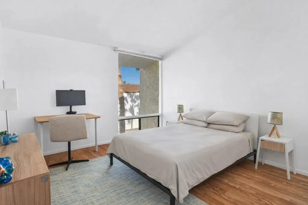 Welcome to Casa Canyon, an architecturally significant community designed by renowned modernist William F. Cody. Located in desirable South Palm Springs on fee land (you own the land), this spacious two-bedroom, two-bath condo features vaulted ceilings, an open layout, and a quiet location just minutes from downtown.Both bedrooms offer ensuite baths, with the primary suite featuring a walk-in closet and an energy-efficient ductless mini-split system. Recent updates include a newer water heater, updated kitchen appliances, and custom motorized window shades. Enjoy mountain views from the private balcony with a storage closet. Community amenities include three pools and spas. One covered parking space plus ample guest parking.