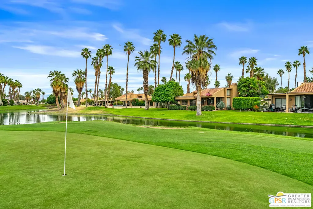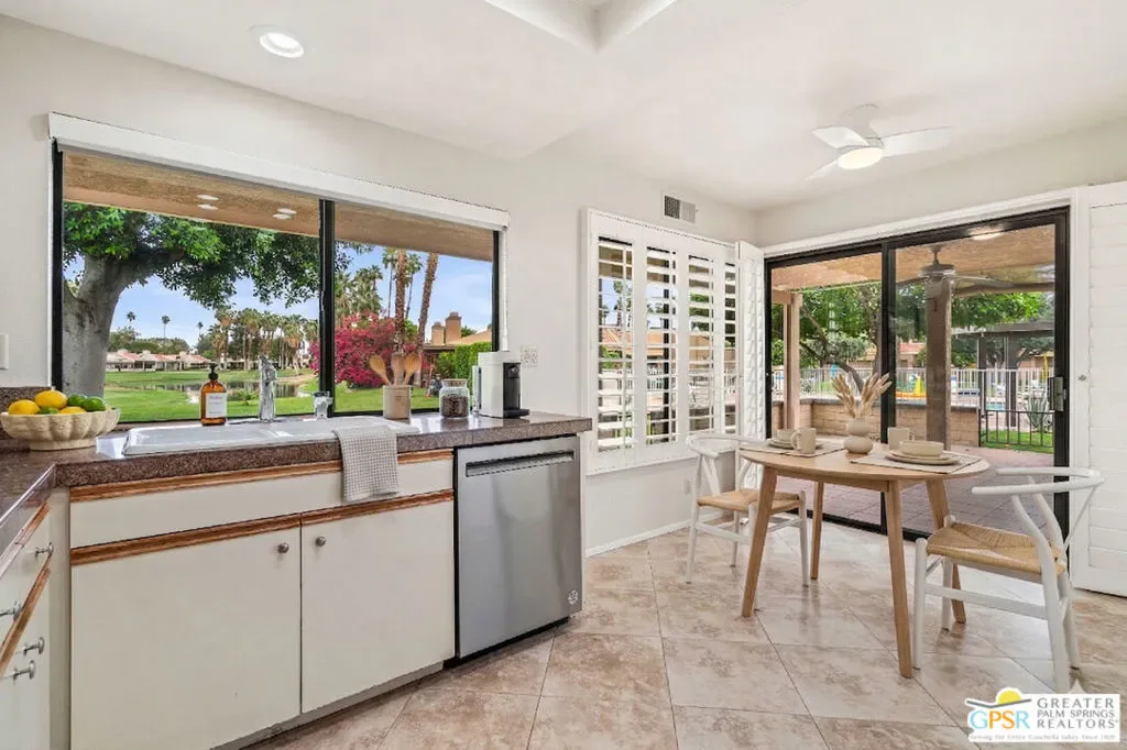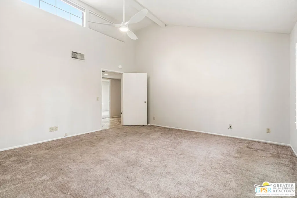 Palm Springs, 2,027-square-foot condominium located in the Cathedral Canyon Country Club in South Palm Springs. This is a single-level condo, with 2 Bedrooms, den/flex room, and 2 Bathrooms. Interior Features: Living room with vaulted ceilings (9ft+), and fireplace. Kitchen: granite countertops, updated appliances, breakfast room with direct access to the covered patio. Primary suite: with vaulted ceiling, walk in closet, shower and soaking tub, dual sink vanity. Upgraded window coverings throughout the home, ceramic tile floors in common areas, carpeted bedrooms and flex room, updated ceiling fans in all rooms. A two car attached garage with direct access and plenty of storage, inside laundry room, patio with pony wall and extended patio cover. This unit is conveniently located near a community pool and spa. The Cathedral Canyon Country Club offers controlled access, professional maintenance grounds, all this with a Palm Springs address!