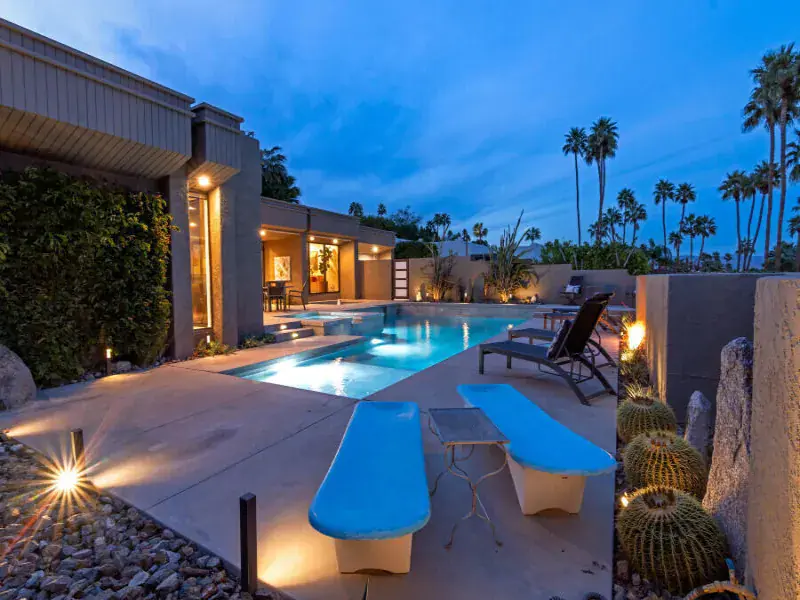 First time on the market 40 years! This modern residence in Chino Canyon’s coveted Little Tuscany enclave is a serene oasis of privacy, showcasing sweeping valley and mountain views. Beautifully maintained and thoughtfully updated, the home features high ceilings, recessed lighting, smartly remodeled bathrooms, and a chef’s kitchen designed for both daily living and effortless entertaining.Sleek porcelain tile floors flow seamlessly to expansive indoor-outdoor living and dining areas. Double doors open to a large covered patio and lushly landscaped west-facing yard, bask in the east-facing pool and spa and enjoy tranquil morning light and dramatic mountain backdrops. A generous Pebble Tec pool, spa, and gas fire pit create an inviting setting for relaxation and entertaining. Pool and spa feature newer equipment with both chlorine and optional saltwater filtration systems.The versatile floor plan offers two ensuite bedrooms, a third bedroom with adjacent bath, and a fourth office or bedroom with a built-in Murphy bed. The primary carpeted retreat is just steps from the pool and spa, enhancing the home’s effortless indoor-outdoor lifestyle.The gourmet kitchen is outfitted with black granite countertops, a new six-burner Wi-Fi-controlled JennAir range, Sub-Zero refrigerator, Miele dishwasher, and a bar with built-in ice maker. A secondary caterer’s kitchen located in the attached two-car garage further elevates the home’s entertainer appeal.Practical luxuries include 64 owned solar panels across two systems with a Tesla backup battery, water softener, two central A/C units, two evaporative coolers, a silicone-protected foam roof, intercom electric secured entry gate, and security cameras.Perfectly designed for relaxed Palm Springs living, this Chino Canyon gem blends modern comfort, timeless appeal, and exceptional views in one of the city’s most desirable neighborhoods.