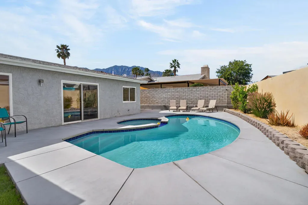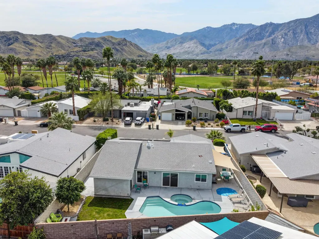 Modern Desert Perfection with Unobstructed Views! Welcome to your private sanctuary in the exclusive Arroyo/Nueva Vista enclave. This isn’t just a renovation; it’s a total transformation. Boasting Owned Solar and rare underground utilities, your breathtaking mountain views remain completely uncluttered and pristine. Inside, the home radiates ”Palm Springs Chic” with soaring cathedral ceilings and a seamless open-concept great room bathed in light. The smart floor plan offers maximum use of all living areas, with the primary suite perfectly tucked away from the three guest bedrooms and two guest baths. Step outside to your personal resort: a freshly replastered pool and spa, framed by majestic peaks and a cozy fire-pit lounge. From the new HVAC and ducting to the designer kitchen and windows, every detail is done, as shown in the attached improvement list. Pack your bags–your move-in-ready desert dream is here.