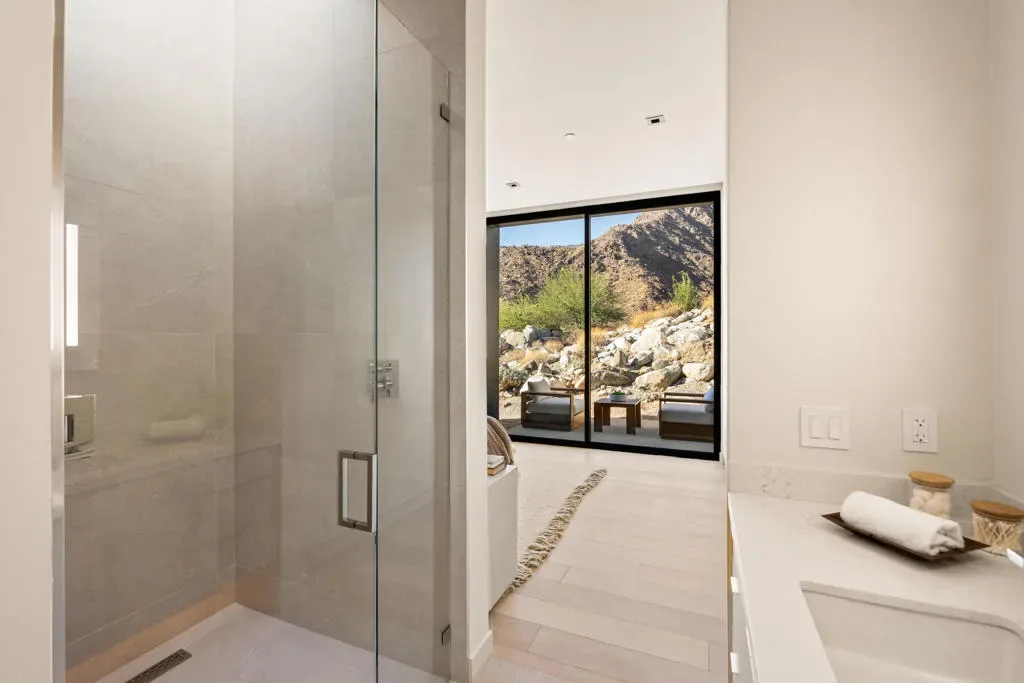 Welcome to the exclusive Desert Palisades enclave in Palm Springs, where world-renowned architects collaborate to create sustainable, cutting-edge homes. Embrace 360-degree mountain views with this newly constructed, architectural gem, surrounded by boulders and nestled in the hills at the base of the San Jacinto Mountains. Nearly 3800 sq.ft. of luxurious living space offering seamless indoor-outdoor living, a spacious open floor plan including living room and dining area, an expansive deck, meticulous landscaping, and a luxurious pool. As you enter the residence, clad in Japanese Sugi Ban wood, you are greeted with phenomenal mountain, desert and city views through floor to ceiling Monumental sliding glass doors and windows. The clear wood oak floors accent the hot rolled steel two-sided fireplace that extends from the living room to the family room/den. The gourmet Chef’s kitchen is outfitted with top-of-the-line Miele appliances, two dishwashers, wine refrigerator, Hans Grohe fixtures, Blanco farmhouse-style sink, designer lighting and European-style cabinetry. The primary bedroom suite is an opulent retreat, complete with sliding door access to the outdoor patio, pool & spa, a glass-enclosed shower, luxurious free-standing soaking tub, a hallway of expansive custom closets and its own stackable washer/dryer. There are two lovely, well-appointed guest bedrooms, each with uniquely designed en-suite bathrooms providing their own spectacular mountain and city views. Each bathroom includes beautiful walk-in showers, Robern lighted medicine cabinets, in-wall tank Toto toilets, and ample closet space. Other home features include Eastern European wood interior doors, seven skylights (2 being operable), Kohler bathroom sinks, under cabinet lighting, separate laundry/utility room, 6 state-of-the-art security cameras, owned solar for energy efficiency, 5 HVAC zones and a huge 4-car garage to accommodate both vehicle and storage needs. The expansive outdoor space is an entertainer’s dream featuring a built-in firepit and gorgeous custom Pebble-Tec pool with tanning shelf and separate raised spa. The spectacular 360-degree views enhance the beauty and serenity of this home’s outdoor living. Surrounded by mountains, this home’s design blends seamlessly with the desert landscape, embodying the architectural ethos of the Desert Palisades. Every aspect of this home has been meticulously curated to fashion an exquisite masterpiece of artful living!