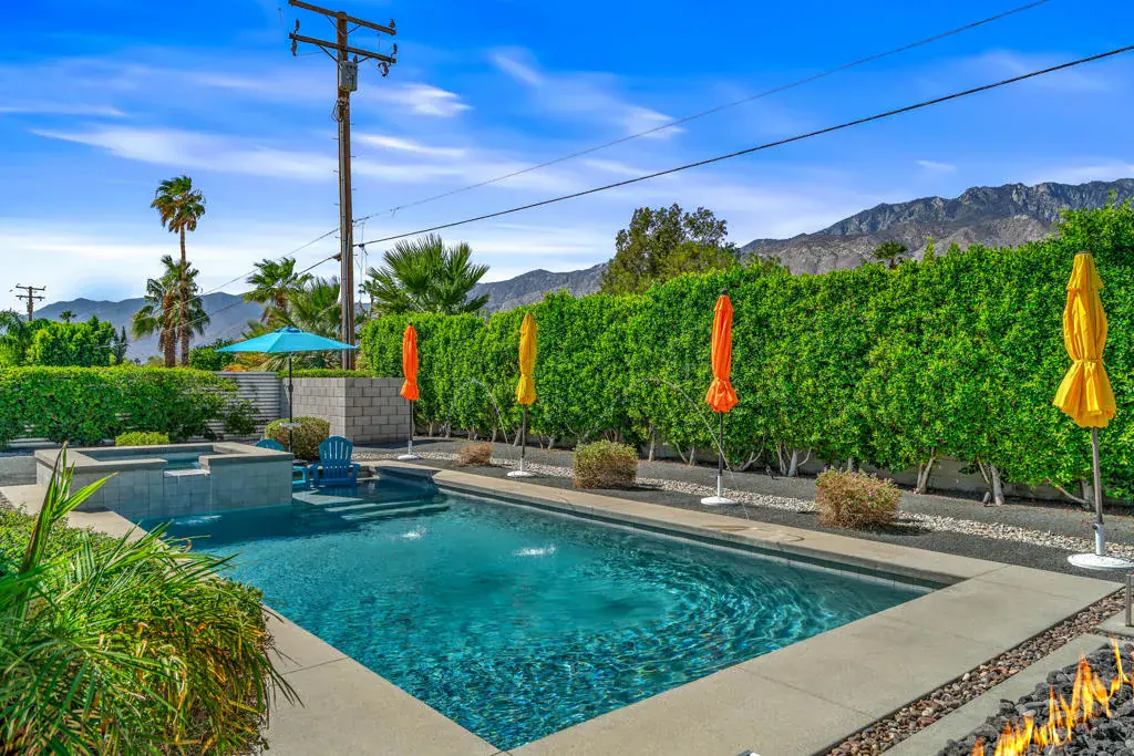 Welcome to 2077 E. Nicola, a stunning modern home, perfectly located in the heart of Palm Springs. Designed with clean lines, soaring ceilings and light filled living spaces, this residence offers both style and functionality. A 4 bedroom home includes a versatile casita with private washer/dryer hookups, ideal for guests or as a rentable unit for extra income. The seamless indoor-outdoor living is enhanced by walls of glass that open out to the pool side retreat and a covered patio with rich tongue and groove wood detail, creating an inviting lounge area overlooking the sparkling pool, spa and sweeping mountain views. Set on a large, low maintenance lot with block wall for privacy, private courtyard entry , Brilliant auto controls for turning on lights, pool, etc, this property is perfect for entertaining or simply relaxing in your desert oasis. The home’s sleek concrete floors, automated smart features for lighting and pool, and open-concept design add to its modern appeal. Whether your seeking a full time residence, a luxurious second home, or an income producing property, this Palm Springs gem delivers it all-style, comfort and endless potential.