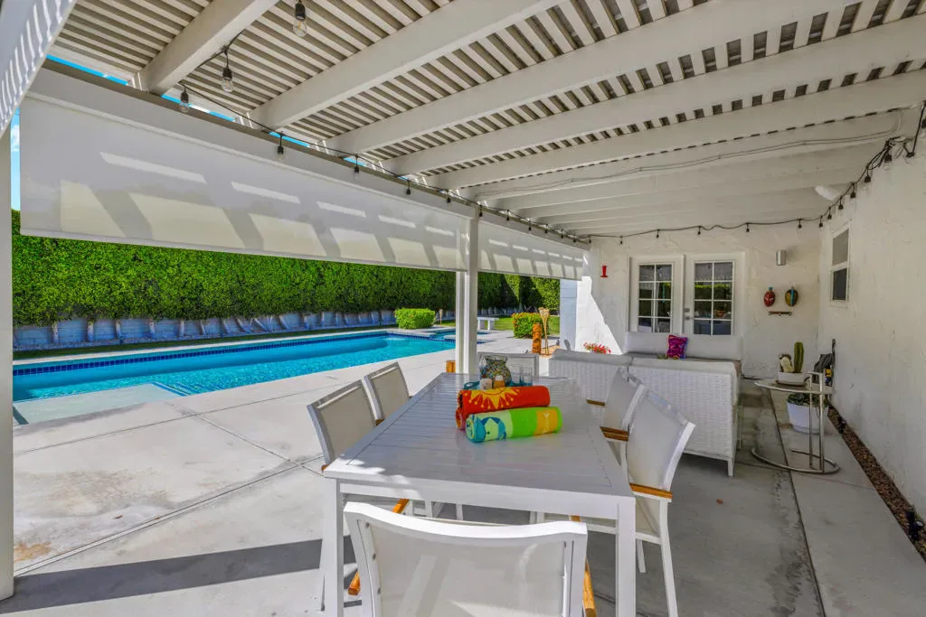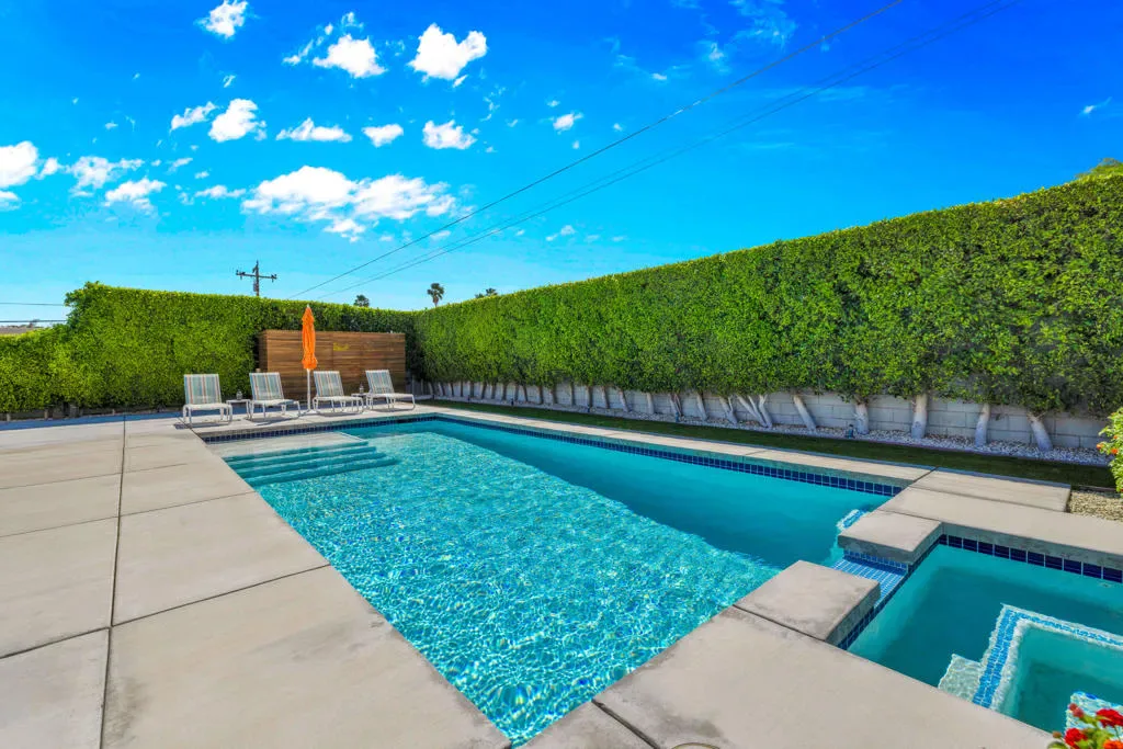 Beautifully upgraded 3-bedroom, 2-bath home featuring a private, resort-style backyard with pool and spa, mountain views, fruit trees, and multiple outdoor living spaces designed for relaxation and entertaining. Enjoy automated landscape lighting, Alumawood(r) patio covers, and immersive Sonos(r) audio that make outdoor living effortless.Inside, the home showcases extensive improvements including whole-house insulation, solid-core interior doors, updated electrical outlets, switches, and air ducts throughout, plus a fully renovated hall bathroom, and custom, birch utility and linen closet doors. The updated kitchen offers quality Samsung appliances including a dual-fuel convection range, microwave/vent, Bespoke counter-depth refrigerator (2025), as well as a brand-new Miele dishwasher (2026).Technology-forward features include a Crestron Home(r), whole-house automation system controlling lighting, patio shades, front door lock, and outdoor audio, along with a professional-grade WiFi and LAN network with CAT6 wiring in every room and connectivity for both Frontier fiber and Spectrum.Major system upgrades provide comfort and efficiency, including a Lennox Signature Series HVAC system, newer roof (2015) with elastomer recoating completed in 2024, REEM 50-gallon water heater, water softener connection, and Google/Nest smoke and carbon monoxide detection.Additional highlights include a fully insulated garage with its own heating and cooling system, LG washer and dryer, and epoxy floor. A concrete driveway and gated area for an RV offer many parking options. The neighborhood is currently capped for short term rental permits, but a Jr. Vacation Rental Certificate could be available. Check with the City of Palm Springs for details. On land you own.