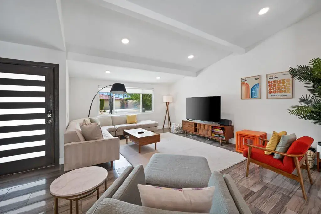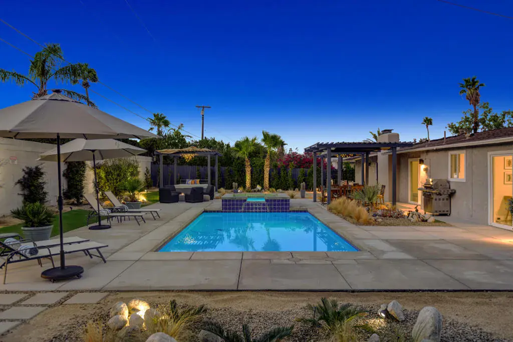 Experience modern Palm Springs living in this beautifully updated 4-bedroom, 2-bath home designed for seamless indoor-outdoor living. The open-concept layout highlights a sleek chef’s kitchen with Quartz countertops, Italian cabinetry, and effortless flow into the dining and living areas, ideal for entertaining or everyday comfort. Porcelain tile flooring extends throughout, and the dining room fireplace adds warmth and ambiance.Energy-efficient features include dual-pane windows and sliders that welcome natural light while maintaining year-round comfort. The primary suite offers an ensuite and direct access to the backyard.The west-facing outdoor oasis captures panoramic mountain views and features a private pool and spa, custom desert landscaping, and three distinct lounge and entertainment areas.Located on FEE land (land you own) with no HOA, this property offers excellent flexibility as a full-time residence, vacation home, or investment opportunity. Furniture available outside of escrow.