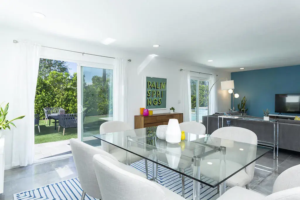 Experience luxury desert living at its finest with this fully updated and stylish 3-bedroom, 2-bathroom home offering a resort-style backyard and beautiful mountain views. Situated on a generous corner lot, this immaculate property is perfect for both entertaining and relaxing in true Palm Springs style.From the moment you enter, modern design and comfort greet you. Updated windows and doors fill the home with natural light while showcasing the gleaming tile flooring, designer color palettes, and surrounding mountain scenery. The flexible layout includes a spacious living area and a secondary sitting area ideal for lounging or reading.The open kitchen features light wood cabinetry, a full suite of stainless-steel appliances, a sleek tile backsplash, and a dining counter with a waterfall edge. Adjacent to the kitchen is a welcoming space with a fireplace currently serving as the dining area, which is ideal for gatherings and conversation. From here, sliding glass doors connect the interior to a private resort-inspired backyard complete with a sparkling pool, raised spa, and multiple seating areas. Several lounging zones feature low-maintenance artificial turf and there is a cozy gas firepit for evening enjoyment. A stylish dining pergola with bistro string lighting adds a touch of romance to outdoor entertaining.The primary suite opens directly to the backyard and offers a tranquil retreat with mountain views, ample closet space, and a beautifully updated en-suite bathroom. Two additional bedrooms are located at the front of the home with bright eastern exposure, accompanied by a designer hall bath featuring modern tile and fixtures.Additionally, there is an attached two-car garage with stacked laundry. The side yard provides RV parking in case your Airstream needs a home. For buyers seeking economic flexibility, this property qualifies for a junior rental permit through the City of Palm Springs, allowing up to six short-term rentals annually and unlimited stays of 30 days or longer–making it a perfect option for those wishing to offset living expenses with rental income.