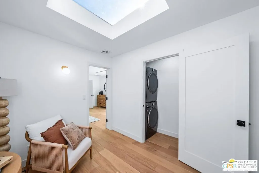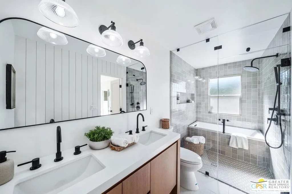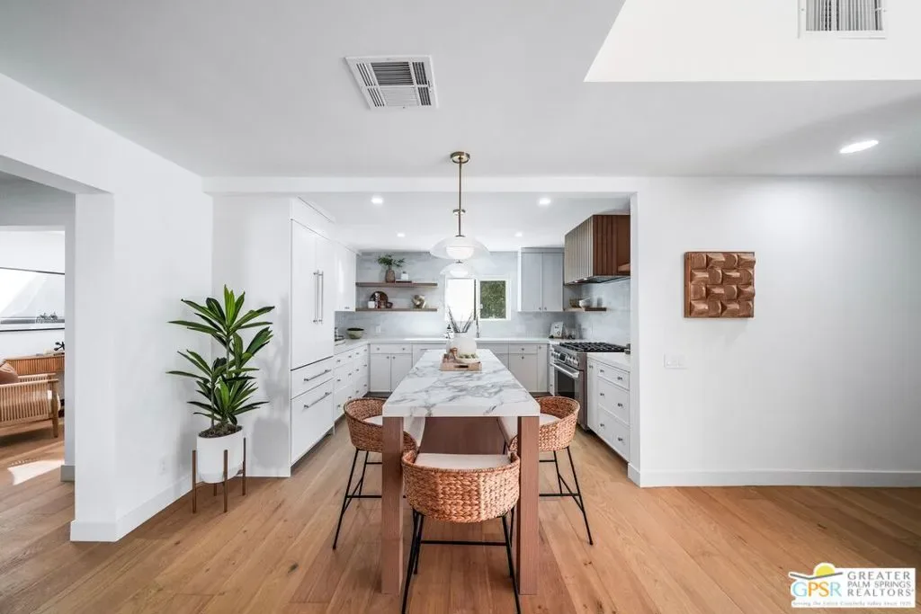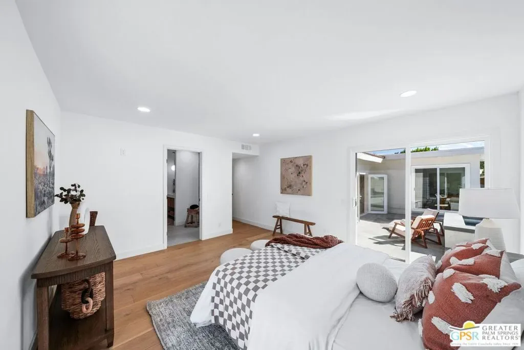Set against a panoramic backdrop of Mount San Jacinto, this beautifully reimagined Palm Springs luxury retreat delivers the desert’s most sought-after combination: a true private resort setting, dramatic sit-down views, and a rare double-lot opportunity approximately .45 acre of outdoor living, entertaining, and future potential. Renovated from top to bottom with a refined, design-forward palette, the home features engineered white oak flooring and a showpiece great room with soaring vaulted ceilings and white-oak wrapped beams, anchored by a striking fireplace. Oversized picture windows and French doors create an effortless connection to the outdoors, with pool, spa, and mountain views enjoyed right from the living room the quintessential “view-side” experience. At the heart of the home, the chef’s kitchen impresses with custom cabinetry, built-in Signature appliances, and an expansive island designed for gathering. A separate dining area and wine bar complete the entertaining flow, all finished with clean lines, warm wood accents, and elevated hardware/lighting. Designed for comfort and privacy, the residence offers three luxe suites plus a fourth bathroom, each finished with spa-level style and designer tile from Bedrosians Tile & Stone. One suite features a true resort-inspired bath with a dedicated shower-and-soaking-tub room, while the remaining baths showcase beautiful walk-in showers crisp, modern, and impeccably detailed. Two suites open directly to the pool deck for seamless indoor-outdoor living; the third suite opens to its own private patio with easy access to the resort yard. Step outside to your own desert oasis: a sparkling heated pool and spa (fully renovated with Pebble Tec finish and new equipment), a bocce ball court, and expansive grounds framed by fresh hardscape and landscape improvements ideal for sun, stars, and unforgettable gatherings. Additional upgrades include multi-zone air conditioning, a custom courtyard entry, custom garage door, EV charging in the garage, and owned solar paid in full (not leased) for modern efficiency. Rare double-lot offering: Two residential lots sold as one offering exceptional flexibility for a future second residence or potential lot split. And for year-round livability, the home’s orientation captures the magic of desert light winter sun and bright interiors while keeping the summer months comfortable.