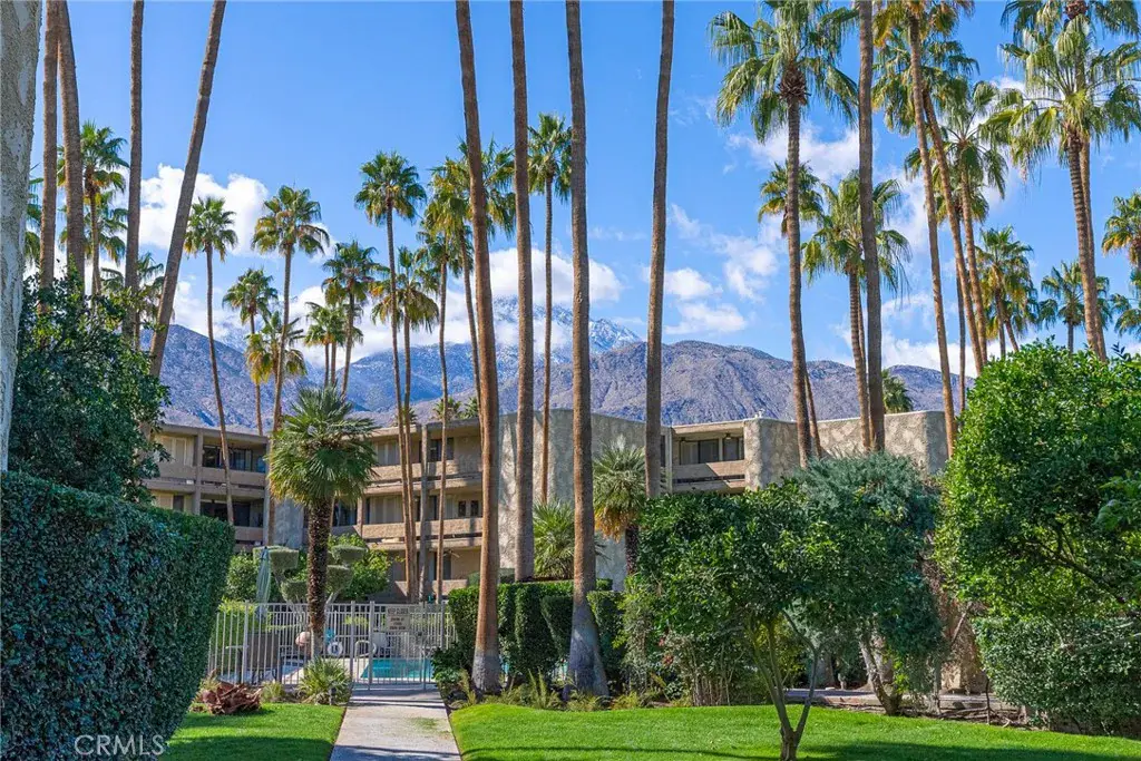 Welcome to The Diplomat—an iconic South Palm Springs address—where double doors open to a spacious two-bedroom home designed for effortless desert living. Floor-to-ceiling windows showcase incredible mountain and palm views, bathing the space in natural light and creating an inviting indoor-outdoor atmosphere. The extended galley kitchen is functional, featuring dual French-door stainless refrigerators, ample cabinetry, and a built-in office nook ideal for remote work or everyday planning. A mirrored wet bar connects seamlessly to the open living and dining area, where upgraded lighting sets the perfect mood for relaxing evenings or entertaining guests.The primary suite is a true retreat with double sinks, a walk-in closet plus an additional slider closet, and peaceful views. A well-positioned guest bedroom and nearby three-quarter bath add flexibility for visitors, hobbies, or a home office. Enjoy the ease of secure underground parking with elevator access, just steps from your front door. Developed by renowned builder Robert Grundt, The Diplomat is admired for its striking sculptural architecture, lush landscaped open space, and resort-style amenities including a sparkling pool and spa. The HOA includes Spectrum TV with premium channels, Wi-Fi internet, water, and trash, making ownership refreshingly low-maintenance. Just across the street from Smoke Tree Village, you’ll have markets, boutique shops, a pharmacy, and local restaurants right at your fingertips. Renovated, move-in ready, and thoughtfully designed—this is Palm Springs living at its finest.