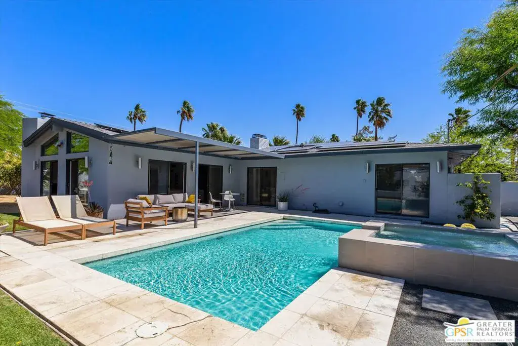 Located in the historic El Mirador neighborhood of Palm Springs on a secluded cul-de-sac, this expanded mid-century home offers a refined blend of classic design and modern comfort. Once the site of the legendary El Mirador Hotel, an iconic desert retreat for Hollywood stars and dignitaries, the neighborhood retains a sense of quiet glamour and architectural significance. Inside, the home celebrates gracious indoor-outdoor living with a spacious living room addition that captures dramatic mountain views through clerestory windows and a striking pitched wood ceiling. These thoughtful architectural elements create a rare connection to the surrounding landscape, elevating the classic ranch-style design. The large, industrial-style chef’s kitchen features stainless steel countertops, extensive workspace, and storage. Two distinct living areas, each with its own fireplace, offer ideal zones for relaxation or entertaining, allowing for effortless flow between social and private spaces. Travertine floors run seamlessly from the interiors out to the expansive pool deck, reinforcing the home’s easy desert lifestyle. The newly added spa spills gracefully into the pool, surrounded by southern and western exposures that ensure sun-drenched winter days and golden evening light. Two bedrooms are thoughtfully positioned for privacy, making this retreat as practical as it is serene. With timeless design, sweeping mountain vistas, and an unbeatable location steeped in Palm Springs history, this home is a true desert gem.