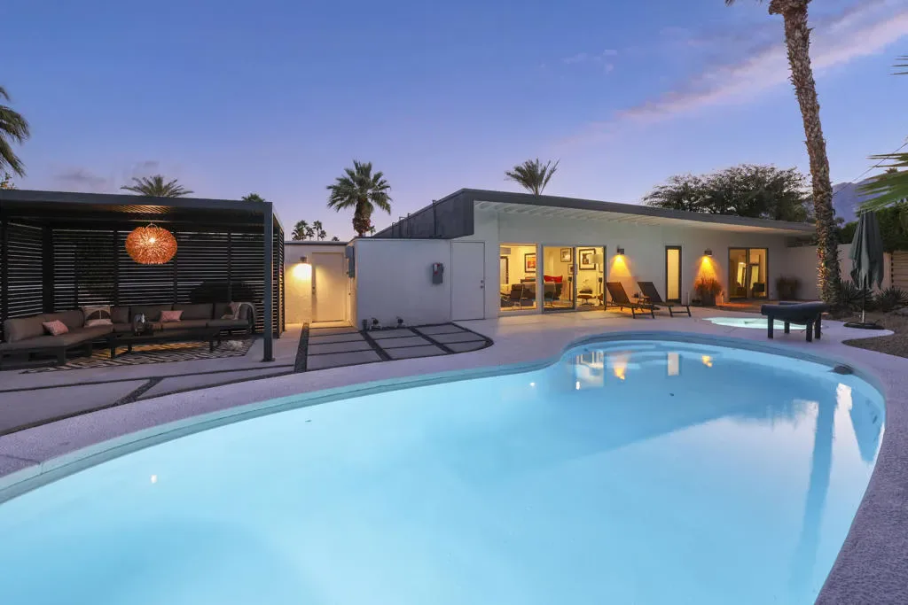 Palm Springs is renowned worldwide for its incomparable portfolio of stunning Mid-Century Modern homes, with tourists visiting throughout each year to see these unique, rare and coveted residences in person. Located on a premium corner homesite with breathtaking views of Mount San Jacinto, this newly upgraded 1961 Wexler & Harrison offers an exceptional opportunity for MCM aficionados to live their dream every day in the desirable neighborhood of El Rancho Vistas Estates. The home reveals an enviably private interior that extends approximately 1,809 square feet and includes three bedrooms and two baths. A frosted-glass entry door with transom window above opens to a seamless and light space that effortlessly combines living, dining and kitchen areas. Bathed in natural light that streams through a sliding-glass door and large picture window, the living room offers generous space for parties, celebrations and carefree relaxation. Clerestory windows allow mountain views to be enjoyed in the dining room, which flows directly to a new fully remodeled high-end kitchen. Anchored by a dual-waterfall island with quartz countertop and seating, the designer kitchen showcases European-style custom wood cabinetry, a trio of sleek pendent lights and a full tile backsplash. A suite of top-tier Thermador appliances includes a six-burner range, dishwasher, under-counter drawer microwave, and a full-height beverage cooler flanked by a custom built-in refrigerator on the left and matching freezer on the right. A hidden cabinet-matched door provides discreet access to the attached two-car garage with glass roll-up door and a laundry room with quartz countertop, cabinetry and brand-new LG washer and dryer set. All bedrooms open to the outdoors, with one offering extra room for an office or sitting area, and the primary suite opening to the backyard from the bedroom and the bath. Polished concrete flooring is featured throughout, and beamed ceilings and recessed LED lighting are on display. Behind-the-scenes systems are led by solar power with Tesla battery, an EV charger, brand-new Lennox and Mitsubishi AC systems, new pool equipment and a new roof. Steel fencing, new landscaping and custom lighting enrich outdoor spaces that host a pool, spa and custom resort-style pergola. Gas lines are pre-plumbed for a fire pit and BBQ, and the oversized driveway accommodates three or more cars.