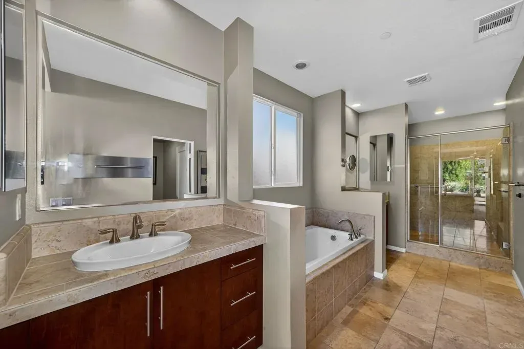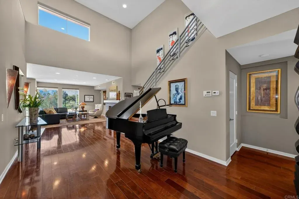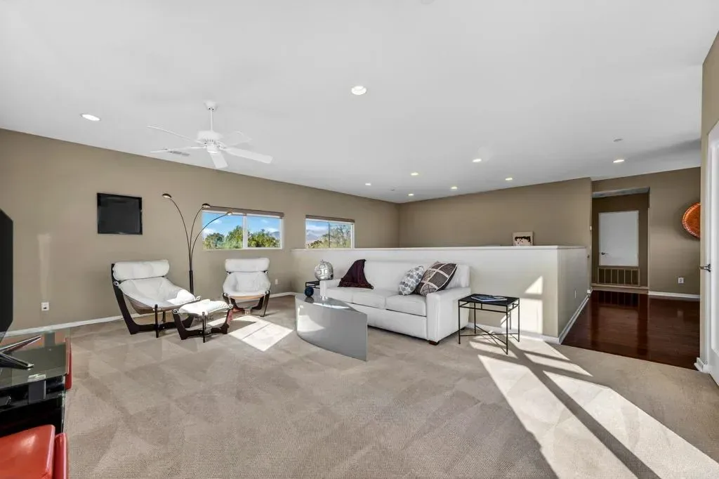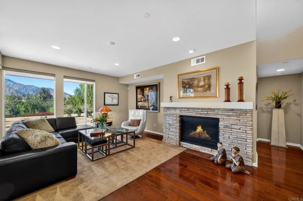 Panoramic views of the San Jacinto Mountains, among the best in the valley. This modern masterpiece, on the 18th hole at Escena, is finally available. A tranquil water feature, walking paths and biking trails are all included—an exceptional setting not to be missed An optional third bedroom upstairs is currently used as a media room and features its own balcony. Additional highlights include a built-in office area, a spacious media center room, a large rear patio with a gas grill, a spacious living room with gas fireplace, an adjacent formal dining room and a breakfast nook in the kitchen. Majestic mountain and golf course views can be enjoyed from every west-facing door and window. Solar provides low cost energy and the 220 car charger in the garage is an added bonus. The Escena community offers a rare blend of scenery, style, location, and accessibility. Escena Golf Club and the Escena Grill are just a short walk away via the golf path from the residence. Open to the public, the Escena Grill and Golf Course are among Palm Springs most popular destinations for relaxation, sweeping views, and outstanding dining. Featuring a Nicklaus-designed championship golf course and an iconic Mid-Century Modern clubhouse, this home listing represents one of the finest opportunities currently available in Palm Springs.