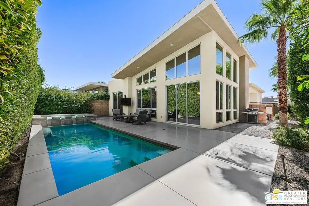 Set within the gated community of Escena, this Toll Brothers Brizo model blends architectural intent with everyday livability. Designed with mid-century influence and a modern sensibility, it features clean lines, ceilings rising to 16 feet, and walls of glass that bring light deep into the home. The open layout connects the kitchen, dining, and living areas in one effortless flow. Generous volume, natural light, and simple detailing create a sense of calm and clarity throughout. A true three-bedroom plan offers flexibility rare for the neighborhood, with the third bedroom suited for guests or a home office. Lush, established landscaping surrounds the home, where tall hedges frame a 30-foot saltwater pool and integrated spa with cascading water feature. Mountain glimpses, a mounted outdoor TV, and thoughtful outdoor design make the backyard ideal for quiet mornings or evening entertaining. The primary suite opens directly to the pool and spa, while a private entry courtyard frames striking western mountain views. Residents of Escena enjoy a gated environment of desert-modern architecture with low HOA fees, a newly remodeled clubhouse and grill, walkable streets, a community “Bark Park,” and access to some of Palm Springs’ most admired mountain and golf course views.