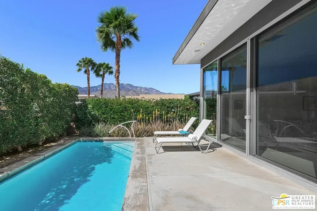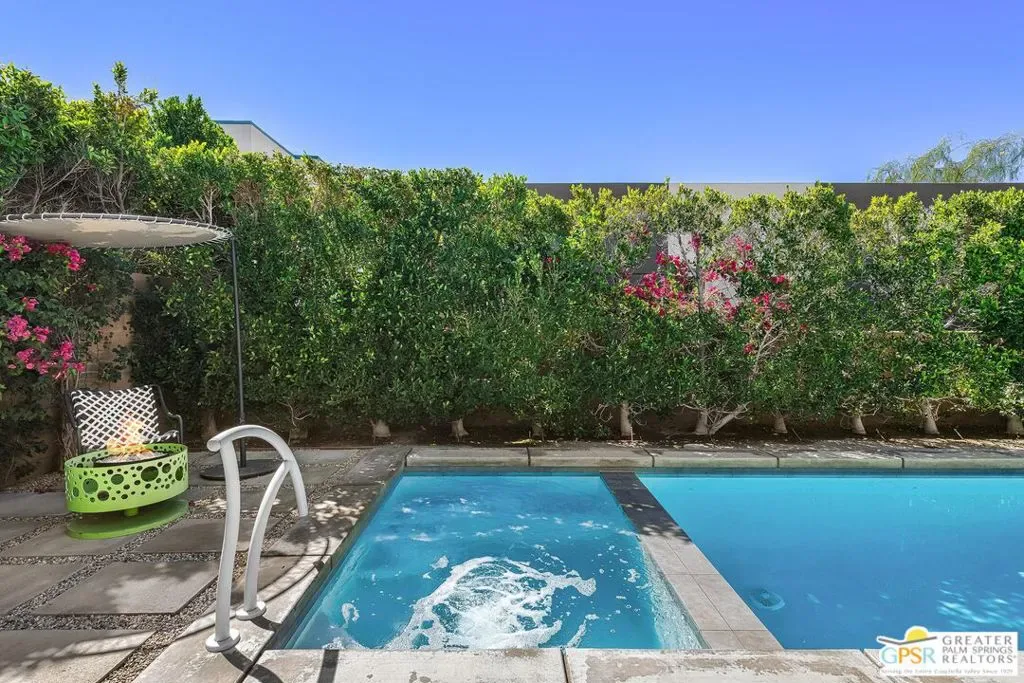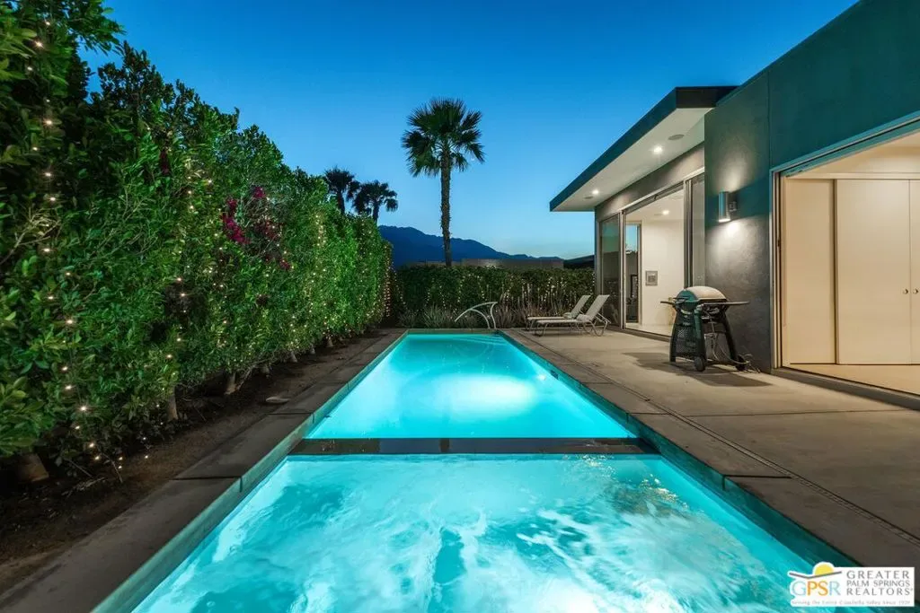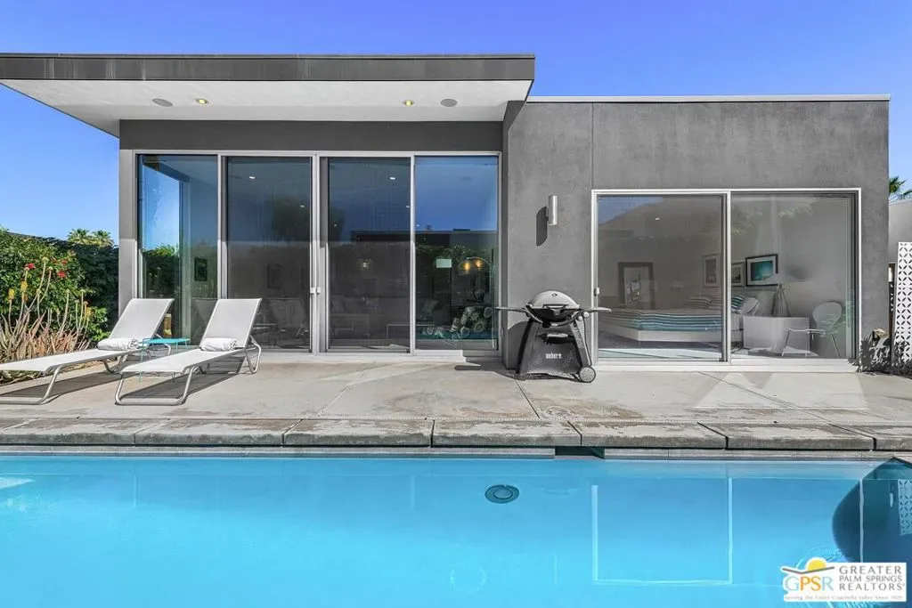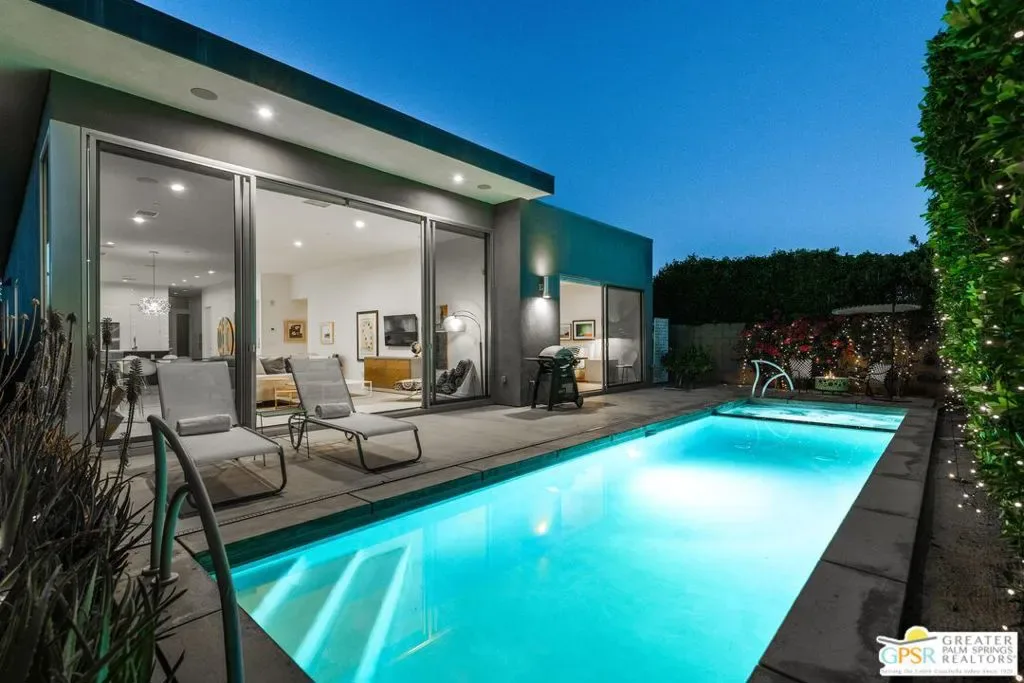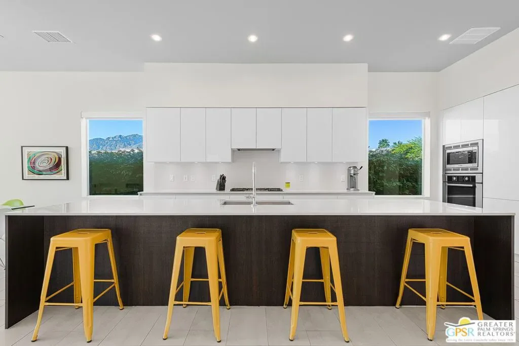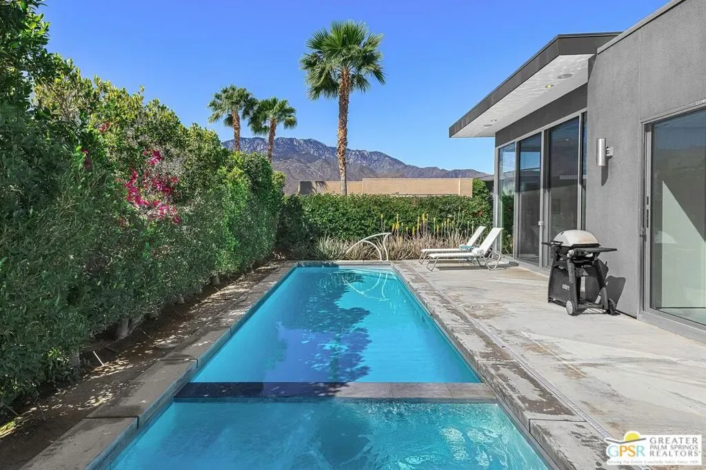 Modern desert living in the sought-after guard gated community of Escena. This contemporary single-level residence, built in 2014 by Alta Verde Group, by award winning designer, Anthony Poon. The home offers 3 bedrooms, 3.5 bathrooms, and approximately 2,192 square feet of thoughtfully designed living space. The open-concept floor plan is filled with natural light and features tile flooring, a spacious great room, and seamless indoor-outdoor flow ideal for entertaining. The chef’s kitchen is equipped with stone countertops, a large island with breakfast bar seating, and stainless steel appliances perfect for both everyday living and hosting. Step outside to your private Palm Springs retreat, complete with a heated in-ground pool, block wall privacy, and stunning mountain views. Additional features include on-demand hot water, a soft water system, 9-panel owned solar with gas connected BBQ and fire pit. Situated on a desirable corner lot, this home offers both privacy and efficiency. Escena provides resort-style amenities including a championship golf course, clubhouse, fitness center, and guard-gated entry. Located just minutes from downtown Palm Springs, the airport, dining, and shopping, this home embodies the best of modern desert living. Furniture is available for purchase outside of escrow, per the inventory.