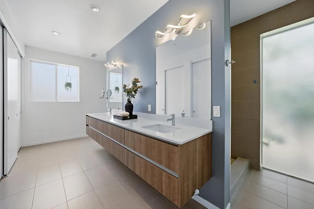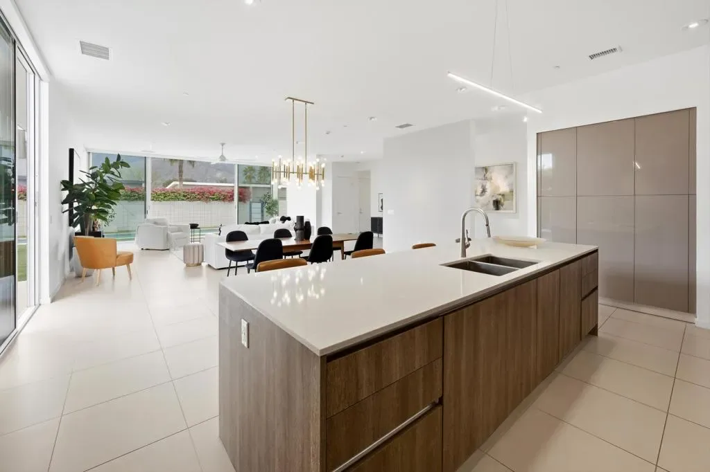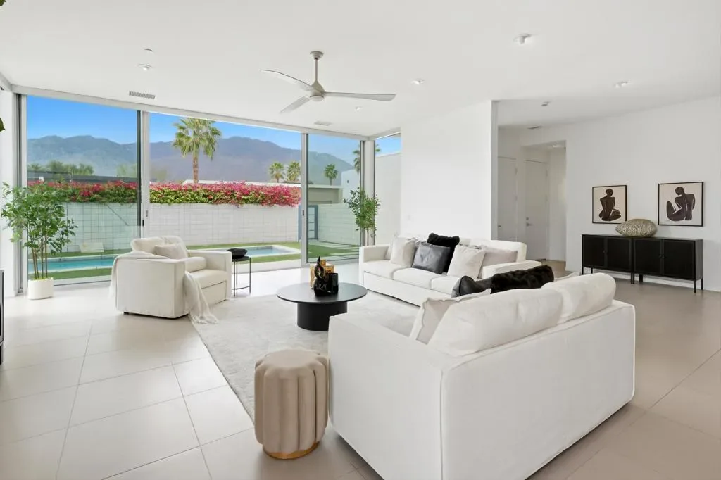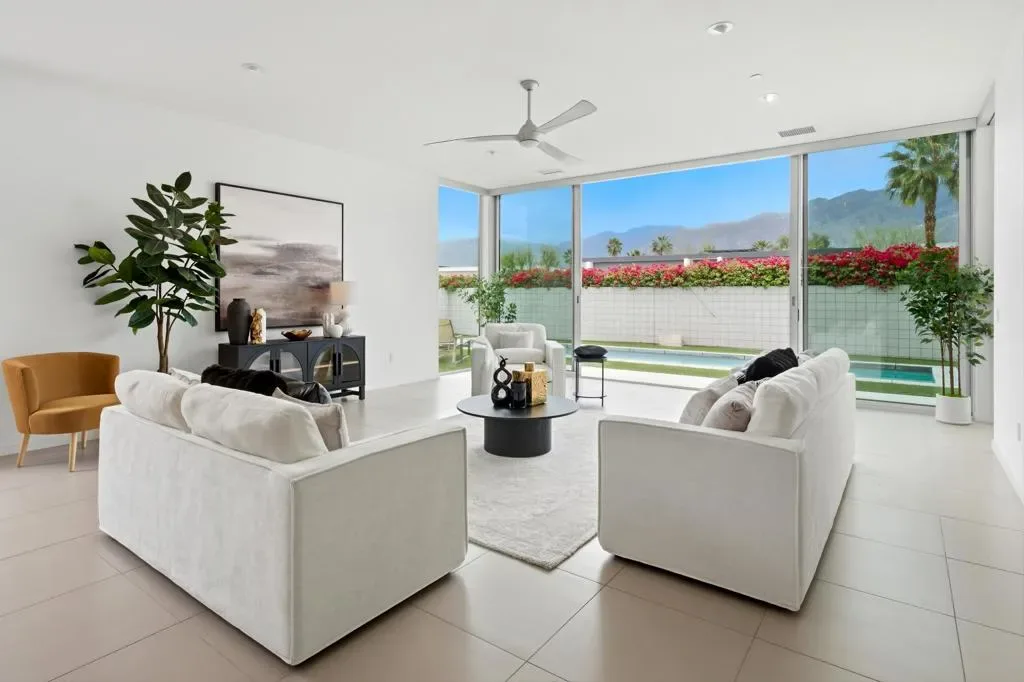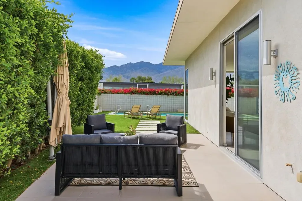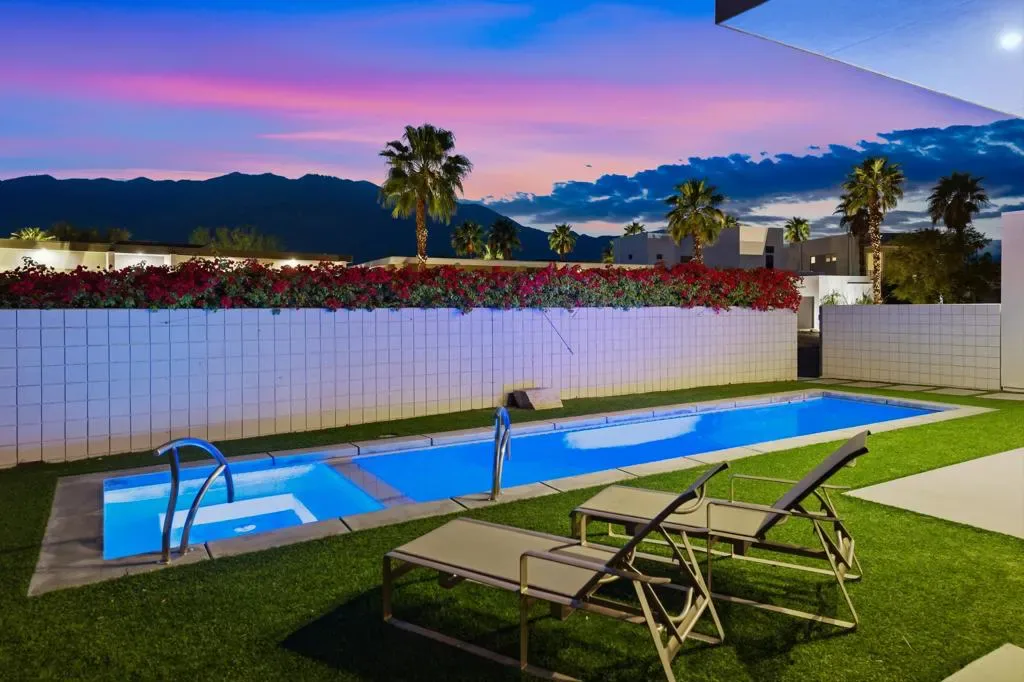 Welcome to Escena, where luxury meets contemporary elegance in this highly desired Anthony Poon designed home. This beautiful Alta Verde home showcases a front-loaded pool and spa with PHENOMENAL views of the San Jacinto mountains. One of the larger homes in Escena, this home offers 2649 sq. ft. of luxurious living space with 3 bedrooms and 3 bathrooms. A chef’s kitchen is a culinary delight with quartz countertops & backsplash, Italian designed cabinetry, stainless-steel Bosch appliances, a newer Samsung Smart refrigerator, and an oversized island. The spacious open floor plan consists of the kitchen, living and dining areas, 10’+ high ceilings, porcelain tile flooring, custom lighting, and mountain views from the home’s great room and pool area. The expansive primary bedroom suite has cornered Fleetwood sliding door access to a private back patio, a huge double-headed walk-in shower, dual vanities, and an extra amount of closet space. The two guest bedrooms share a Jack & Jill bathroom, with good separation from the primary bedroom. Enjoy Palm Springs indoor/outdoor living at its finest with a floor to ceiling wall of Fleetwood sliding doors opening from the great room to the outdoor patio and pool, perfect for entertaining or just relaxing in the sun as you revel in the amazing mountain views. Another Fleetwood sliding door opens from the kitchen to a lovely, spacious side yard/patio of pavers and artificial turf, perfect for relaxing or cooking on the outdoor BBQ. Lighting and landscaping surround the property, adding to the privacy of the outdoor space and its alluring night-time beauty. Additional highlights include motorized blinds in the great room and primary bedroom, a powder room for guests, a separate laundry room with cabinetry and a sink, and 26 owned solar panels for energy efficiency. The 2-car garage has epoxy floor finish, a whole house water filtration system, and EV charger, extra storage space and an A/C split for added comfort on those hot summer Palm Springs days. Recent upgrades include a newer pool pump, newer washer/dryer, added sink to laundry room, newer tankless water heater, and a circulator for quicker hot water. Escena is a highly sought after guard-gated golf course community with low HOA dues and resides on fee simple land (you own it). Do not miss this beautiful Palm Springs contemporary home, offering luxury, unparalleled comfort, style, indoor-outdoor living, and some of the best views in Escena!