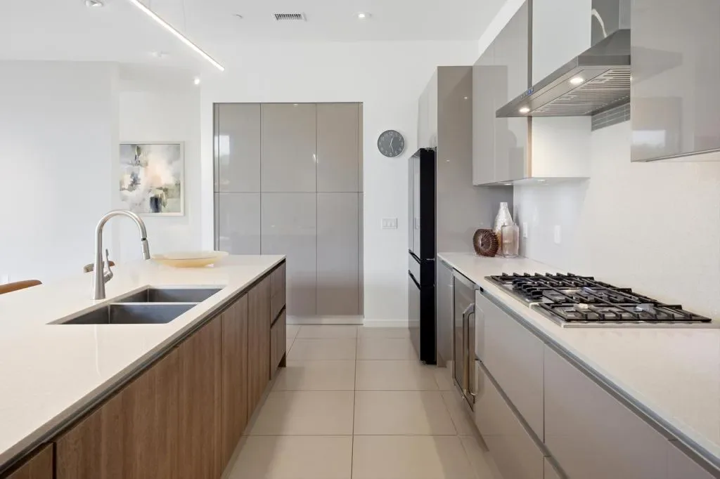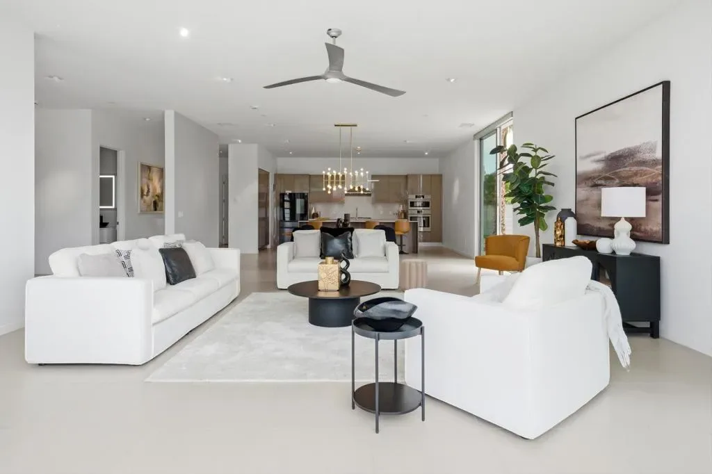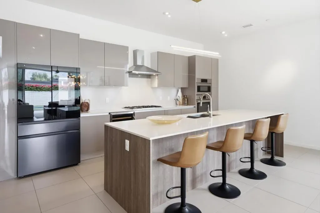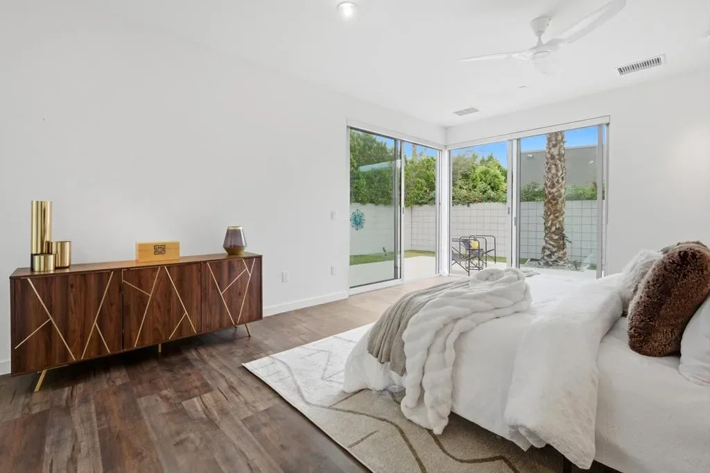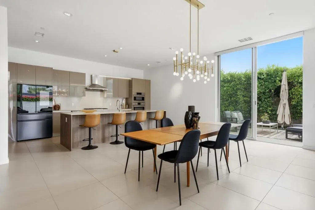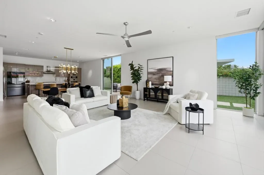 Welcome to Escena, where luxury meets contemporary elegance in this highly desired Anthony Poon designed home. This beautiful Alta Verde home showcases a front-loaded pool and spa with PHENOMENAL views of the San Jacinto mountains. One of the larger homes in Escena, this home offers 2649 sq. ft. of luxurious living space with 3 bedrooms and 3 bathrooms. A chef’s kitchen is a culinary delight with quartz countertops & backsplash, Italian designed cabinetry, stainless-steel Bosch appliances, a newer Samsung Smart refrigerator, and an oversized island. The spacious open floor plan consists of the kitchen, living and dining areas, 10’+ high ceilings, porcelain tile flooring, custom lighting, and mountain views from the home’s great room and pool area. The expansive primary bedroom suite has cornered Fleetwood sliding door access to a private back patio, a huge double-headed walk-in shower, dual vanities, and an extra amount of closet space. The two guest bedrooms share a Jack & Jill bathroom, with good separation from the primary bedroom. Enjoy Palm Springs indoor/outdoor living at its finest with a floor to ceiling wall of Fleetwood sliding doors opening from the great room to the outdoor patio and pool, perfect for entertaining or just relaxing in the sun as you revel in the amazing mountain views. Another Fleetwood sliding door opens from the kitchen to a lovely, spacious side yard/patio of pavers and artificial turf, perfect for relaxing or cooking on the outdoor BBQ. Lighting and landscaping surround the property, adding to the privacy of the outdoor space and its alluring night-time beauty. Additional highlights include motorized blinds in the great room and primary bedroom, a powder room for guests, a separate laundry room with cabinetry and a sink, and 26 owned solar panels for energy efficiency. The 2-car garage has epoxy floor finish, a whole house water filtration system, and EV charger, extra storage space and an A/C split for added comfort on those hot summer Palm Springs days. Recent upgrades include a newer pool pump, newer washer/dryer, added sink to laundry room, newer tankless water heater, and a circulator for quicker hot water. Escena is a highly sought after guard-gated golf course community with low HOA dues and resides on fee simple land (you own it). Do not miss this beautiful Palm Springs contemporary home, offering luxury, unparalleled comfort, style, indoor-outdoor living, and some of the best views in Escena!