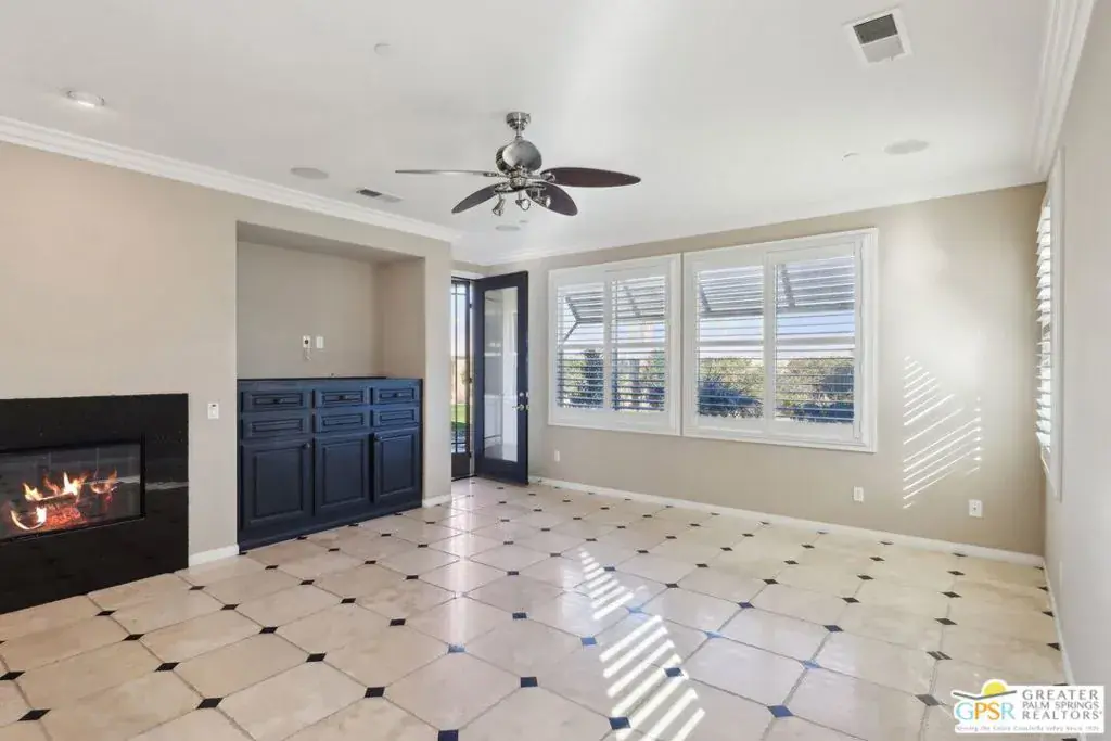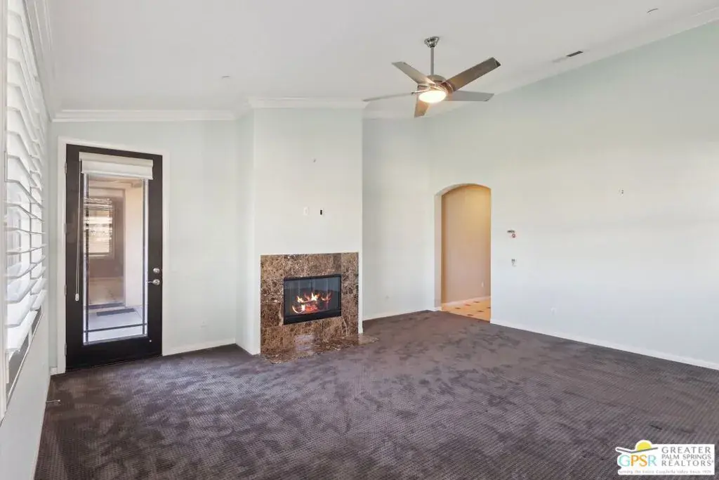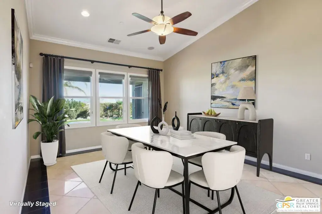 This well-appointed home – located at the end of a cul-du-sac – is the highly-upgraded Canyon 3 model, with 2,825 square feet of living space. It’s the largest floor design within the community, and it’s perfect for an elegant but relaxed lifestyle. Located on the west side of Four Seasons, a gated active 55+ community, this home offers a large lot with even more potential for an owner’s added touches (including ample still room for its own private pool and spa). The home is surrounded by natural desert scenery – including the backdrop of the Chocolate Mountains, the San Jacinto Mountains and the Little San Gorgonio Mountains – within a sweeping,180-degree view from the backyard. Other touches include wired flush-mount ceiling speakers; a central vacuum system; 2 (two) electric-start gas fireplaces; and tons of storage space. There is much upgraded interior finish work throughout, including travertine, granite, and marble flooring, marble countertops, wainscoting, marble fireplace surrounds, and counter, vanity, and shower backsplashes with tile inlays. There are also vaulted ceilings in the living, dining, and master bedroom, and high ceilings with crown moldings throughout the home. The rear facade has a covered veranda for outdoor lounging or dining, featuring a well-placed fire pit to sit around and enjoy beautiful Palm Springs nights. The community of Four Seasons is gated for both security and privacy, and offers many activities for its homeowners, including walking and biking trails, sport courts, tennis courts, pools and spas, and a large community center lodge with exercise rooms and fitness equipment, library, meeting rooms, and a well-knowledged staff. This home – and Four Seasons, in Palm Springs – is a great place to call home.
