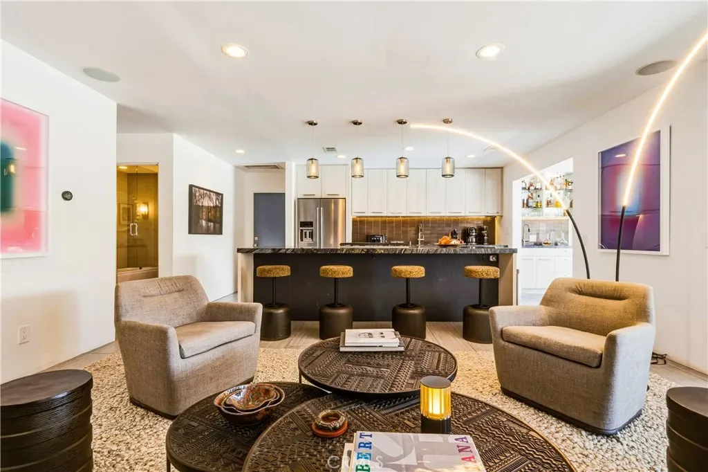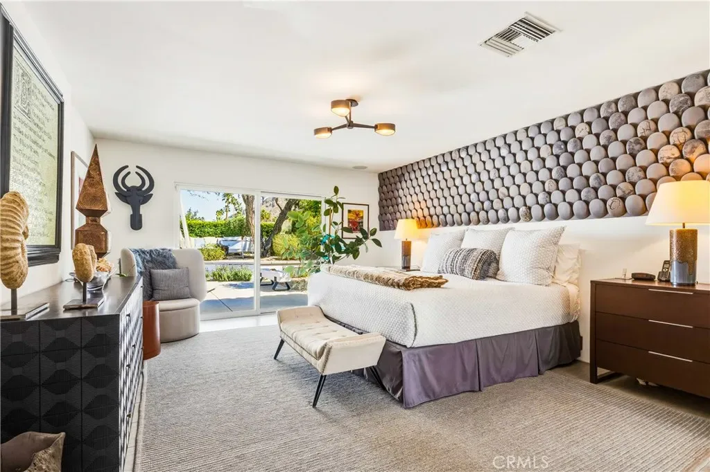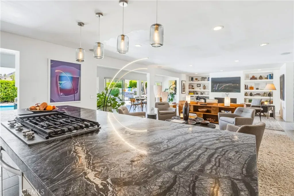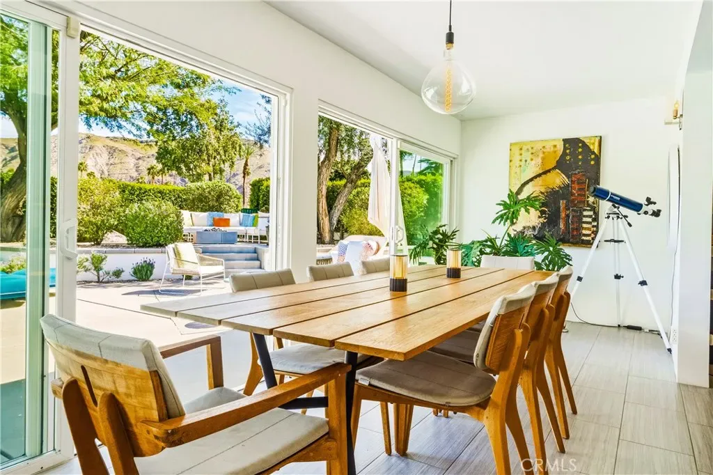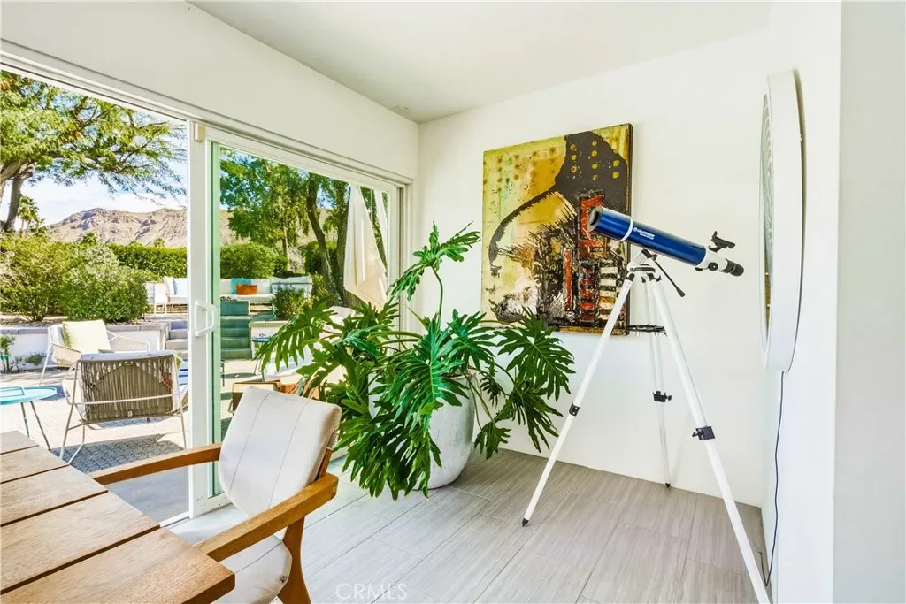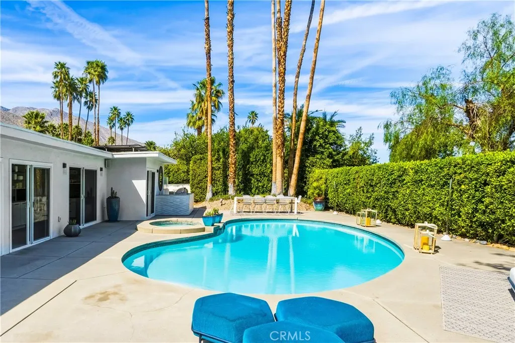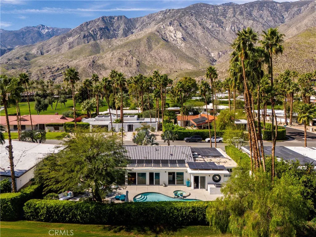 This stunning **mid-century designer home** in the coveted **Indian Canyons** neighborhood of **Palm Springs** backs up to the prestigious **Indian Canyons Golf Resort**, perfectly positioned along the **2nd fairway of the North Course** for exceptional privacy and scenic golf course views. Guests are welcomed through an **Albert Frey–inspired concrete and stone entry with portico**, where floor-to-ceiling glass floods the home with natural light and creates a seamless indoor-outdoor connection. Inside, the thoughtfully designed interior features **smooth-texture drywall, frameless solid-core doors, and sleek Intek door hardware**, creating a refined and modern aesthetic throughout. The **gourmet kitchen** showcases striking black Nike marble countertops, European-style cabinetry, and **all stainless steel appliances**, complemented by a spacious **butler’s pantry** for added storage and prep space. A stylish wet bar enhances the home’s entertaining appeal. Luxurious finishes elevate every space. 3D ceramic tile from Ukraine accents the front entry and select bedrooms, while premium Ann Sacks tile highlights the bathrooms. The primary suite bathroom offers illuminated LED mirrors and breathtaking views of the snow-capped San Gorgonio Mountains. Designed for both relaxation and entertainment, the home features Polk Audio ceiling speakers throughout, with pre-wiring for a 9.2 theater audio system, as well as outdoor and primary bedroom speakers. A spacious laundry room/pantry with skylight brings additional natural light into the home. Step outside to a private resort-style backyard framed by mature shade trees, lush palms—including striking Bismarck palms in the front yard—and privacy hedges. With no overhead power lines, the setting feels peaceful and uninterrupted. A dramatic wall of windows across the rear of the home** creates a remarkable sightline from the front yard straight through to the backyard. The outdoor space features a **saltwater pool and spa with solar heating (9 panels)**, a **fire pit**, and an **elevated seating area** overlooking the yard with panoramic views of the **San Gorgonio Mountains** and **Indian Canyons**. This exceptional 4-bedroom, 3-bathroom residence blends iconic **mid-century modern architecture** with sophisticated contemporary upgrades, all in one of Palm Springs’ most desirable golf-course communities.