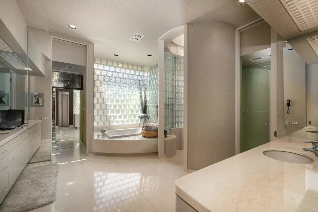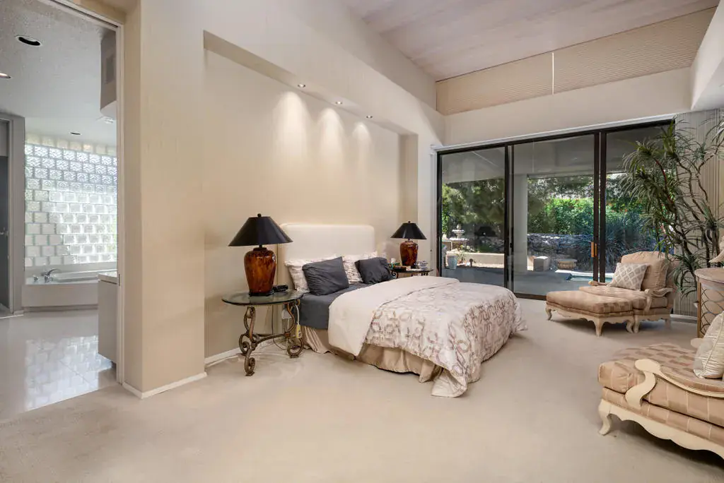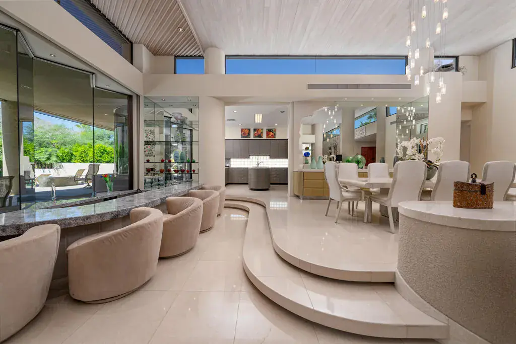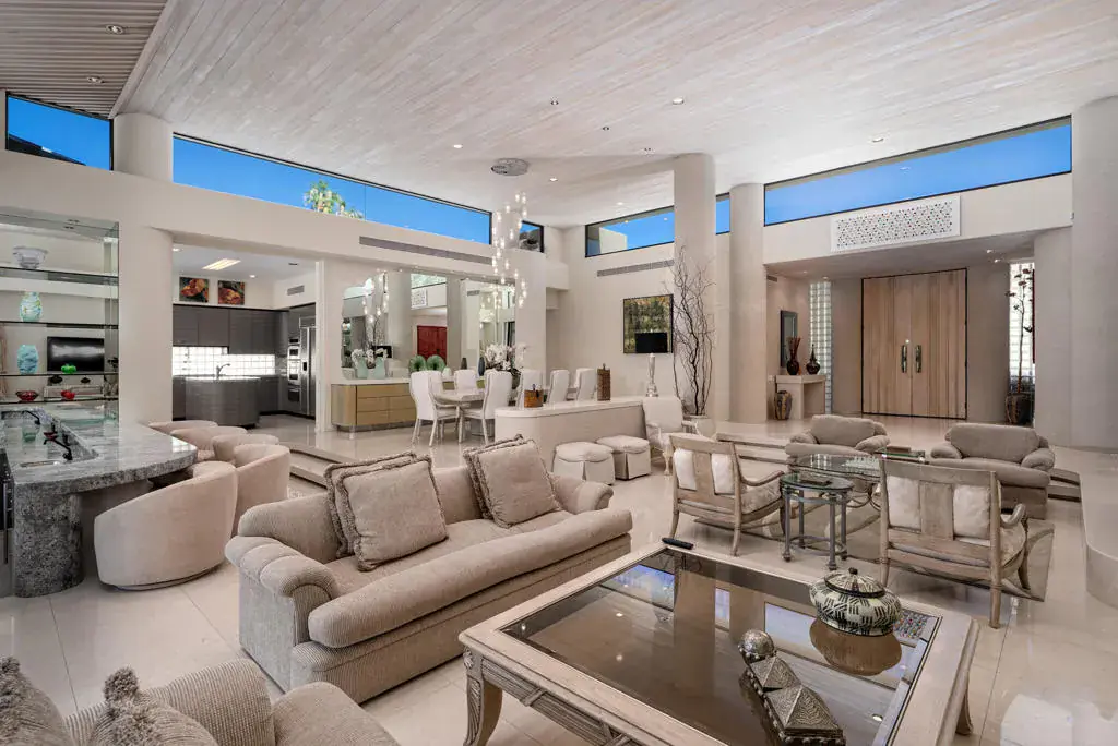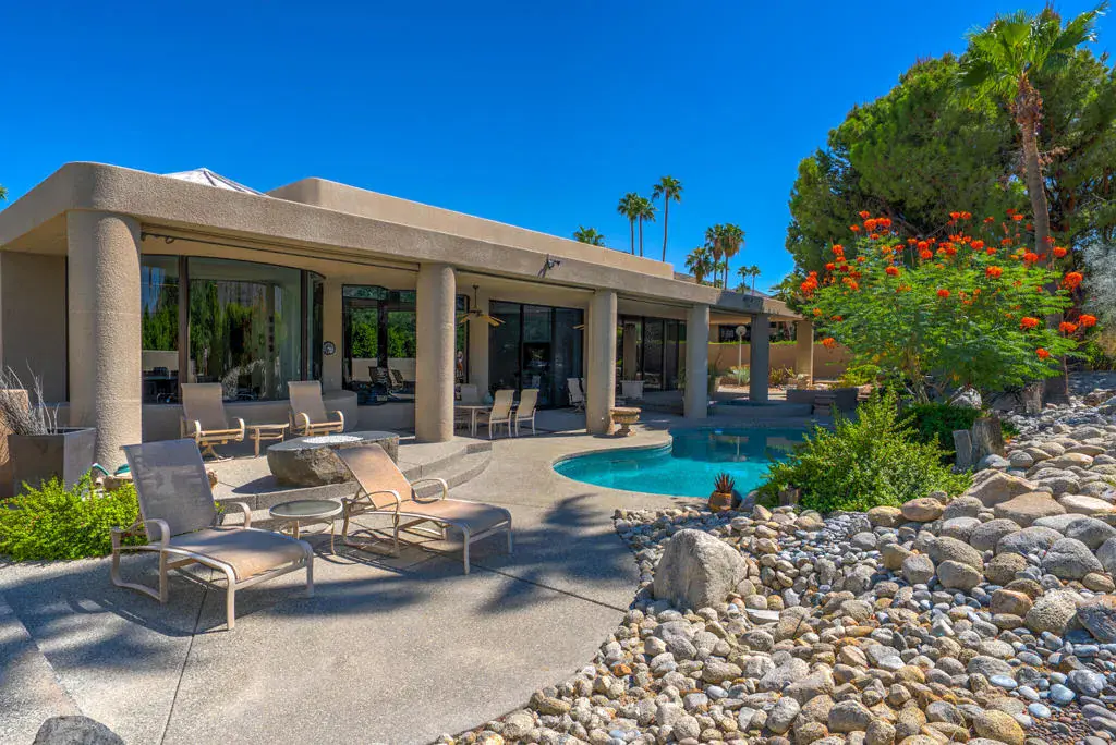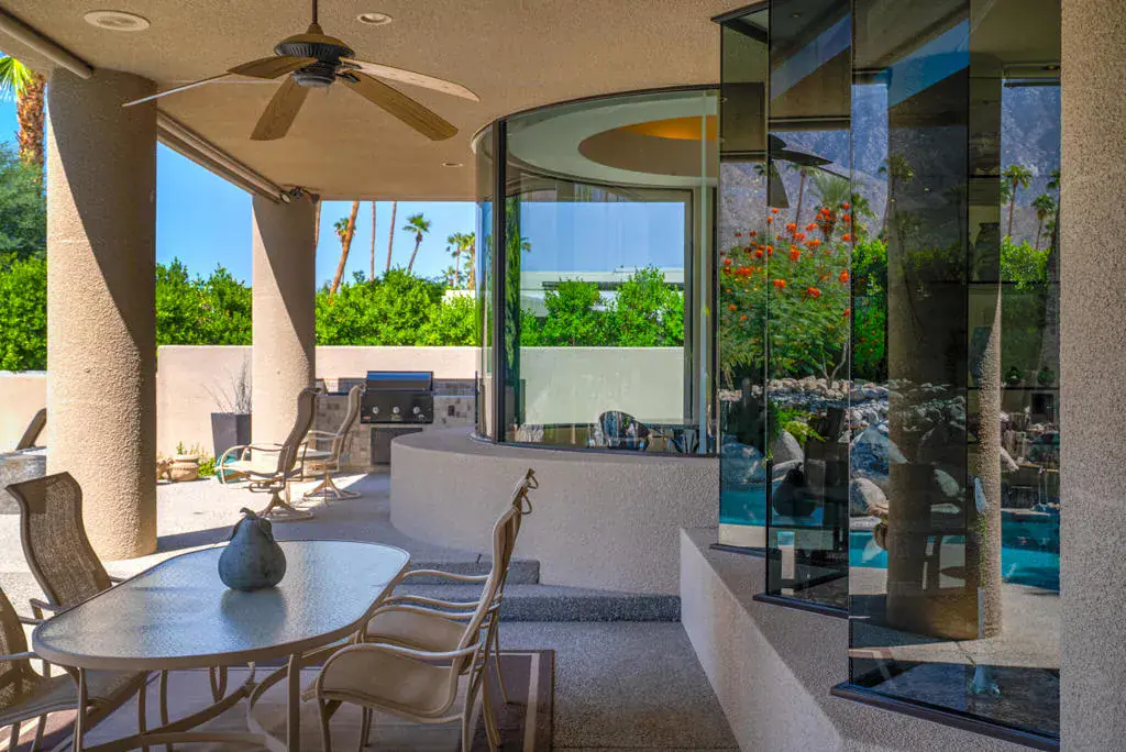 One of the ONLY true architectural, custom homes in Indian Canyons. A step above the rest. There are grand proportions throughout this 3,687 sq ft 4 bedroom/5 bath home. The view and orientation are perfect. With a fabulous pedigree, designed by Holden & Johnson Architects and built by Stoker Construction in 1993. Plate glass and steel reinforcements were used throughout to create expanses which soar across large open volumes with exceptional, uninterrupted views. Other custom design features include textured wall treatments, tongue and groove ceilings with unique details, monumental solid slab fireplace, and a dramatic wet bar which delivers front row seats to an unobstructed view of Mt. San Jacinto. The layout is ideal. The entertaining areas and the master suite all are on the pool side with sliders and good indoor/outdoor flow. The leisure area features several patio areas, a lagoon style pool surfaced with blue tile, a separate spa, as well as a fire feature area and an outdoor barbecue. The house sits on the 13th fairway of the Indian Canyons north golf course, and yet is entirely private and shielded from view thanks to a hedge of ficus along the perimeter. Solar is owned. 3 car garage is attached. No HOA. Short term rentals are allowed (currently the neighborhood is below the city-regulated quota). Land lease runs through 2063 and is $5,996 per year. Offered furnished with artwork excluded, per seller inventory.