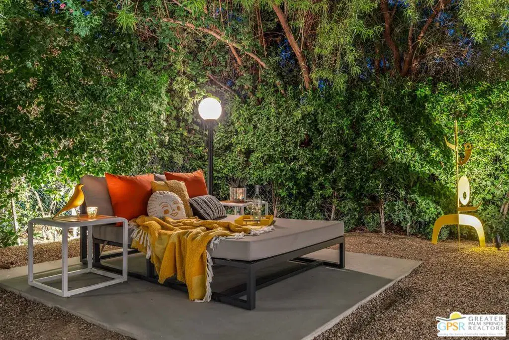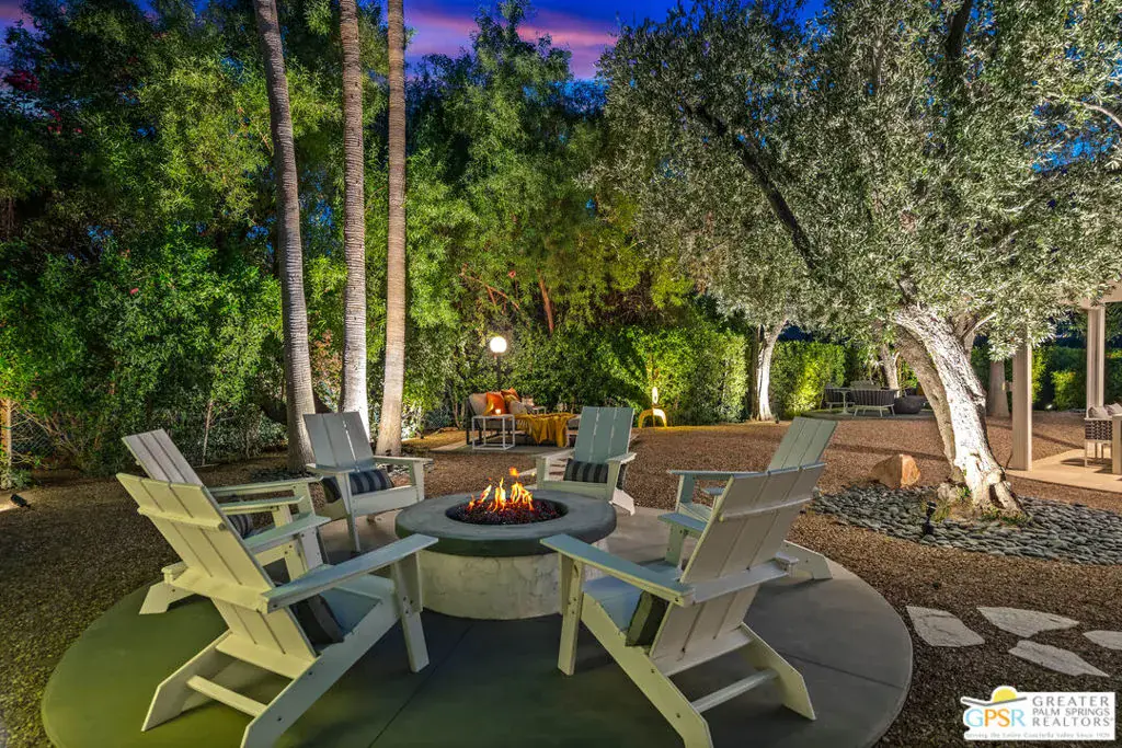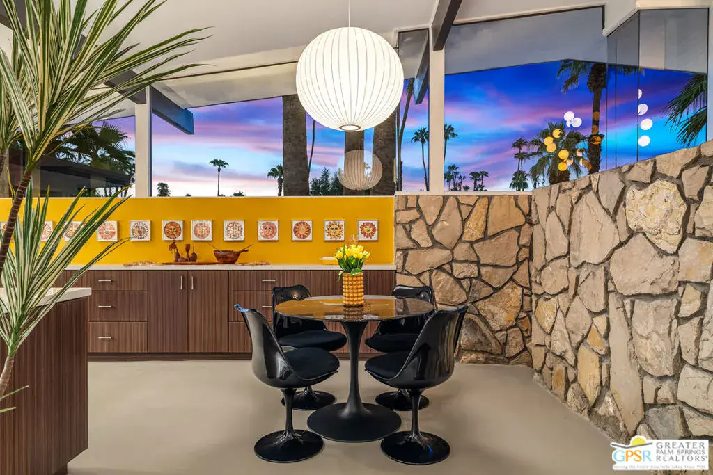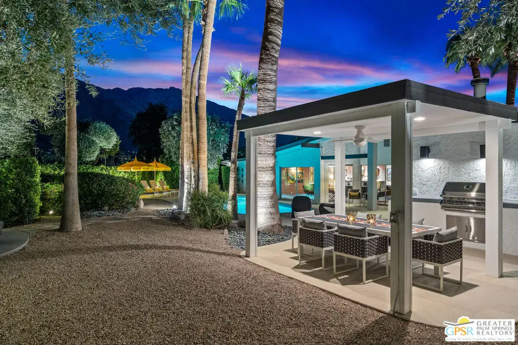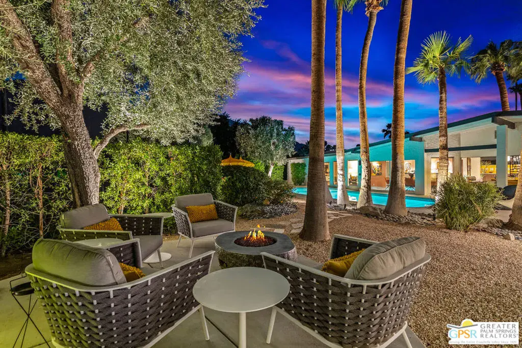 Recently featured in Palm Springs Life Magazine and The New York Times, and chosen for the 2025 Modernism Week Signature Home Tour, this mid-century modern gem is situated in South Palm Springs’ highly sought-after Indian Canyons neighborhood. Built in 1963 as a model home and thoughtfully expanded, it now spans nearly 4,000 square feet on a spacious 1/3-acre lot bordering the Indian Canyons Golf Course. Over the last four years, it has been updated to highlight sweeping mountain views and seamless indoor-outdoor living. Sold turnkey-furnished with a few minor exceptions, the interiors feature a dramatic entry, open living area, built-in bar, and a wall of sliding glass doors to the backyard. The reimagined chef’s kitchen includes custom cabinetry, designer tile, and premium Dacor and Miele appliances. Recent upgrades include three HVAC systems, dual-pane windows, an updated electrical panel, automatic window shades, plus vibrant paint and wallpaper. Outdoor enhancements include two fire pits, a pergola dining area, a built-in BBQ, an outdoor shower, a freshly re-plastered pool, a new foam-coated roof, and lush landscaping. With room for a casita or extra garage, and golf cart parking, this home blends classic design with modern ease.
