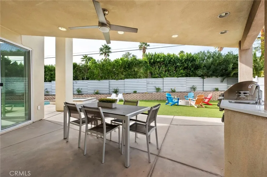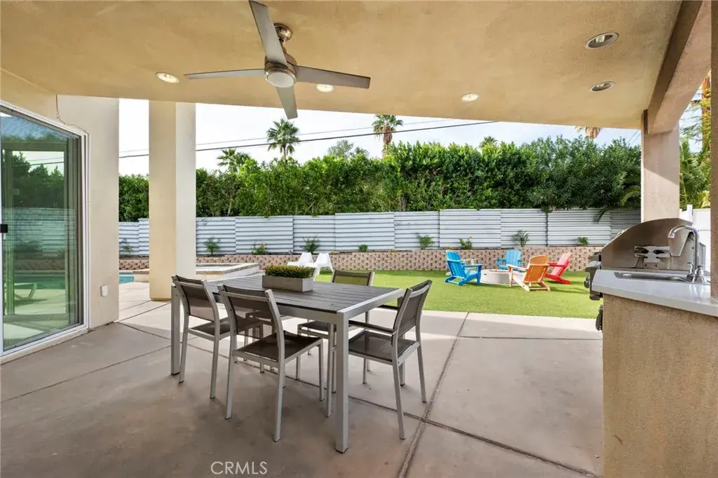Outside is pure Palm Springs: lounge poolside, unwind in the spa, gather around the firepit, and dine under the stars at the built-in BBQ kitchen, complete with an outdoor shower for true indoor/outdoor living. The pool and spa have been recently replastered in Pebble Tec, paired with all-new pool equipment, so the next owner can simply enjoy. The grounds are ultra low-maintenance with artificial turf, desert-tolerant landscaping, and landscape lighting with customizable color options that transforms the space after dark.