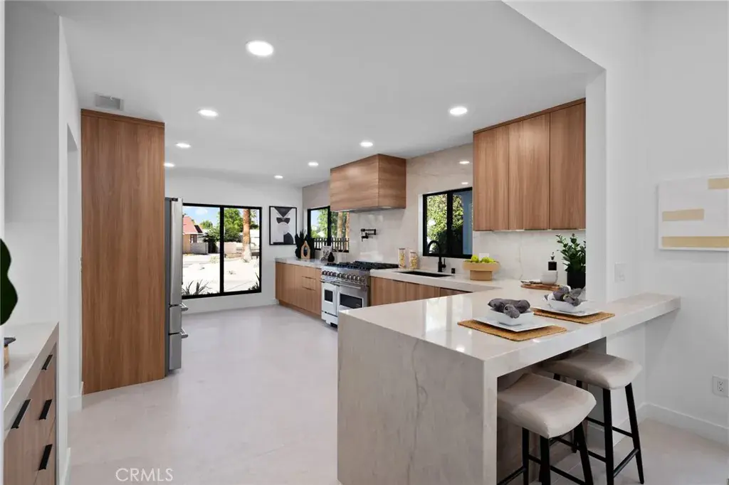 This 1959 mid century newly designed home in sought-after South Palm Springs is waiting for its new owners after being transformed! Enter through the wood front door and enter your large living room with fireplace, high ceilings, and aluminum bi-fold doors across the back of the living room leading you to the backyard where you will be greeted with a fully remodeled pool, backyard, and large covered patio to enjoy the outdoors and mountain views. Off the pool area is a large primary suite with a large walk in closet, a primary bathroom offering a curbless walk in shower, and separate soaking tub. On the other side of the home you will have the privacy of 3 additional bedrooms including one more primary suite with a walk in closet and curbless entry shower. The kitchen boast of frameless soft close cabinets, quartz countertops, and Z Line appliances. The home offers tons of natural light through the new construction aluminum double pane windows. The main home offers a powder room for guest and an additional bathroom with curbless shower for the additional guest and bedrooms. A private separate laundry room. This home combines mid century bones with updated organic modern design and earthy tones. The home offers Tesla paid off Solar, No land lease, privacy of a corner lot on a cul-de-sac, new roof, new HVAC, new plumbing, new electrical, new landscape and sprinklers, and so much more. Just minutes from downtown Palm Springs, Shopping, and Dining. Make this home a permanent residence, secondary home, or rental. Don’t miss this opportunity to own this modern gem.