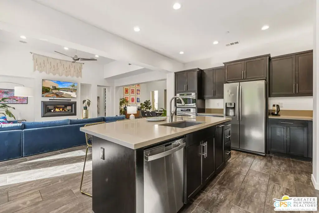 Wow! Bold architecture meets relaxed desert living in South Palm Springs. Set on one of the largest lots in the Luminaire community, this ultra-private residence captures the essence of modern Palm Springs living with expansive outdoor areas and mountain views. Offering more than 2,400 square feet of living space with OWNED SOLAR, the home features an airy, light-filled layout designed for comfort and separation of space. The living and dining rooms showcase 14-foot ceilings, a sleek fireplace, and walls of glass that frame both front and rear patios. The chef’s kitchen is beautifully equipped with a large island, double ovens, a 5-burner gas cooktop, rich walnut cabinetry, and abundant storage. Outdoors, privacy and serenity define the experience. The spacious backyard features a saltwater Pebble Tec pool and spa, lawn area, and multiple patios perfect for entertaining. The front courtyard, complete with a misting system, provides another inviting space to relax and unwind. With only one close neighbor, this property offers exceptional privacy and views in every direction. LOW HOA FEES and land you own make this polished home a rare find. Take the Matterport Virtual Tour for a better sense of flow. Luminaire is an exceptional community known for its pride of ownership and walkability in the heart of Araby Commons.